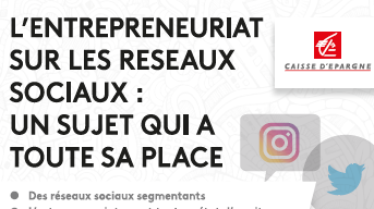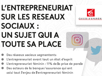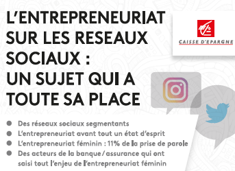 Visuel présentant les chiffres clés de l’entrepreneuriat et de l’entrepreneuriat féminin sur les réseaux sociaux, avec logos Instagram, Twitter et le logo Caisse d’Epargne.