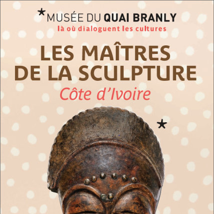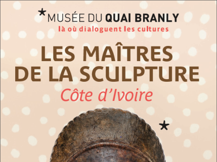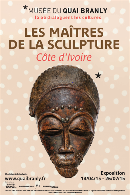 Affiche de l'exposition 'Les Maîtres de la sculpture de Côte d'Ivoire' au musée du quai Branly, représentant un masque ivoirien traditionnel.