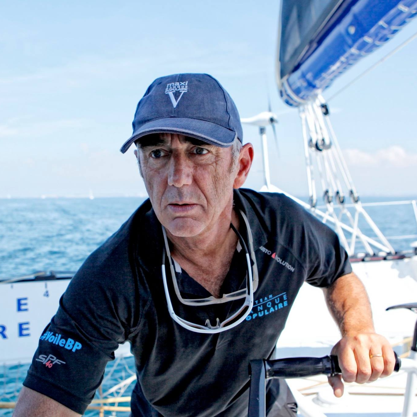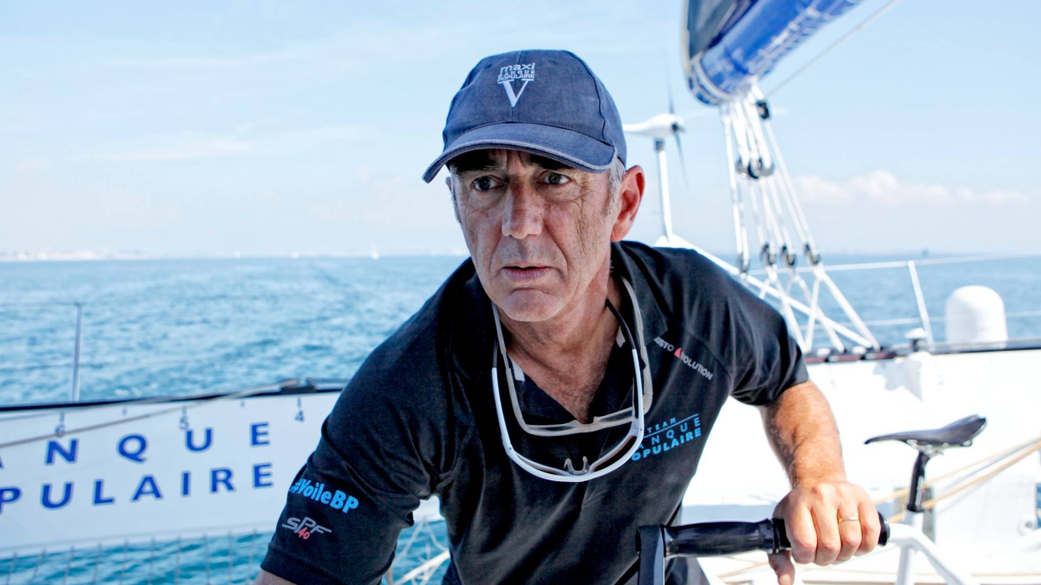 Portrait de Loïck Peyron à la barre du trimaran Banque Populaire sur la mer, lors de sa préparation à la Route du Rhum.
