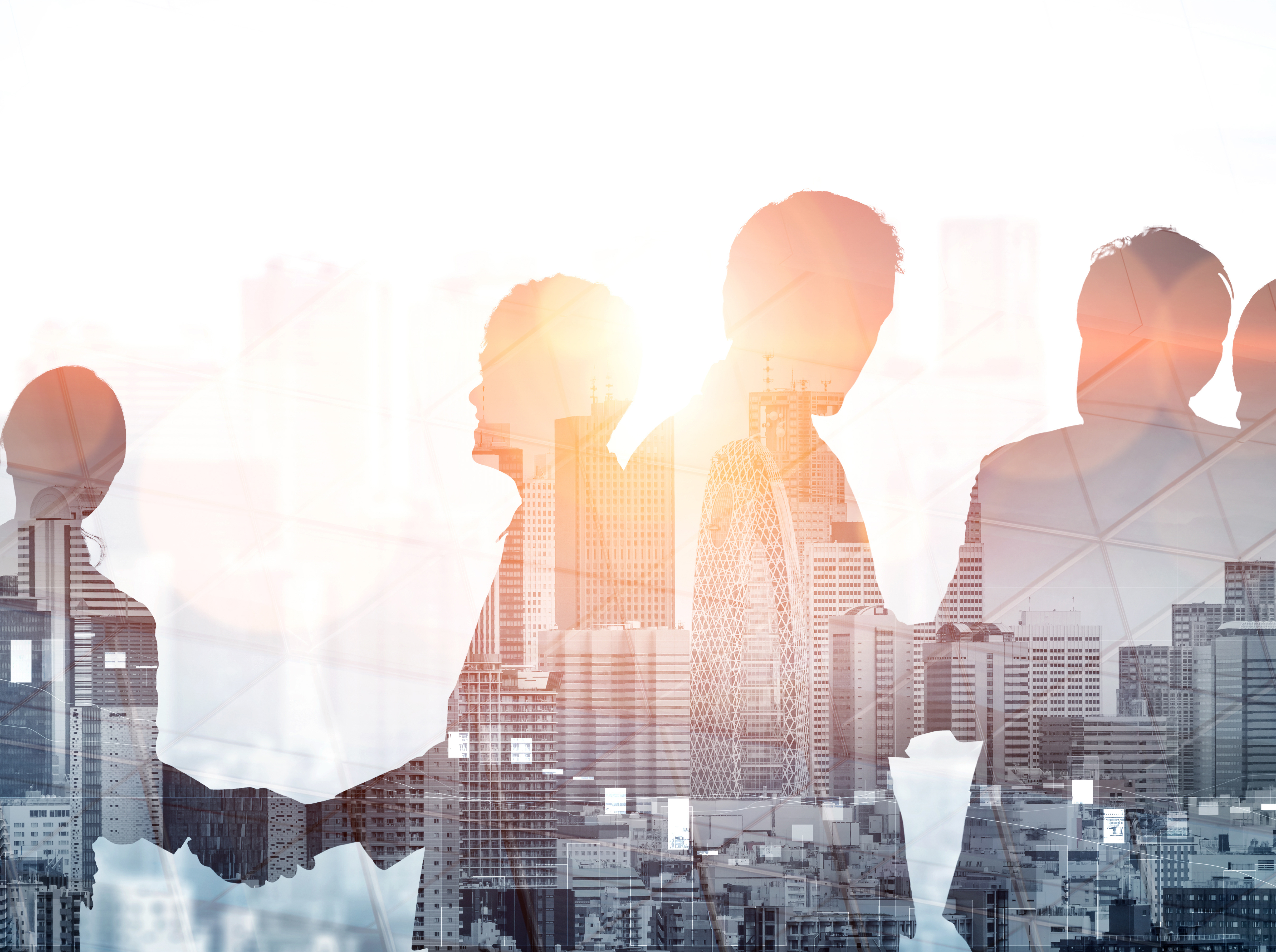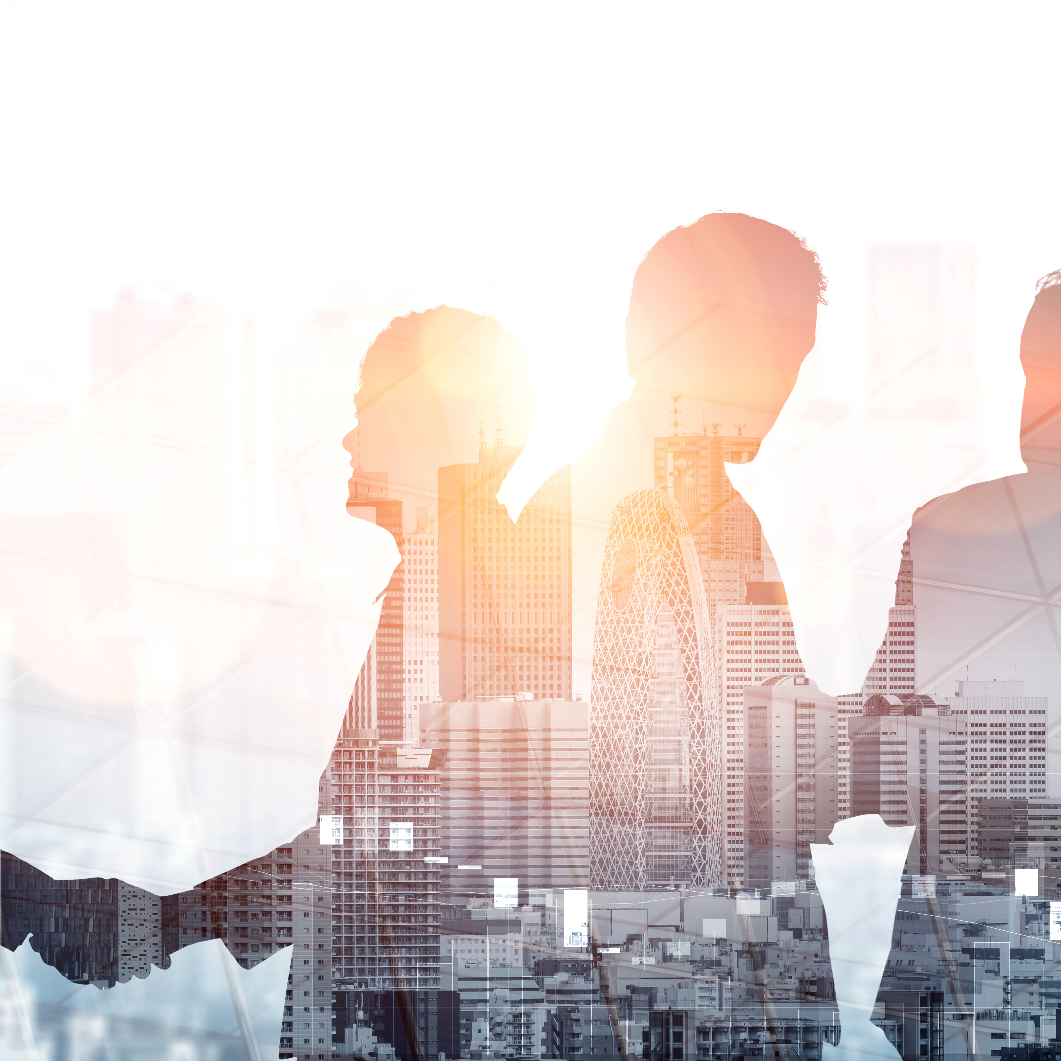 Illustration double exposition de plusieurs personnes en réunion d’affaires avec poignée de main, superposée à une vue de gratte-ciel modernes, symbolisant partenariat et fusions-acquisitions.
