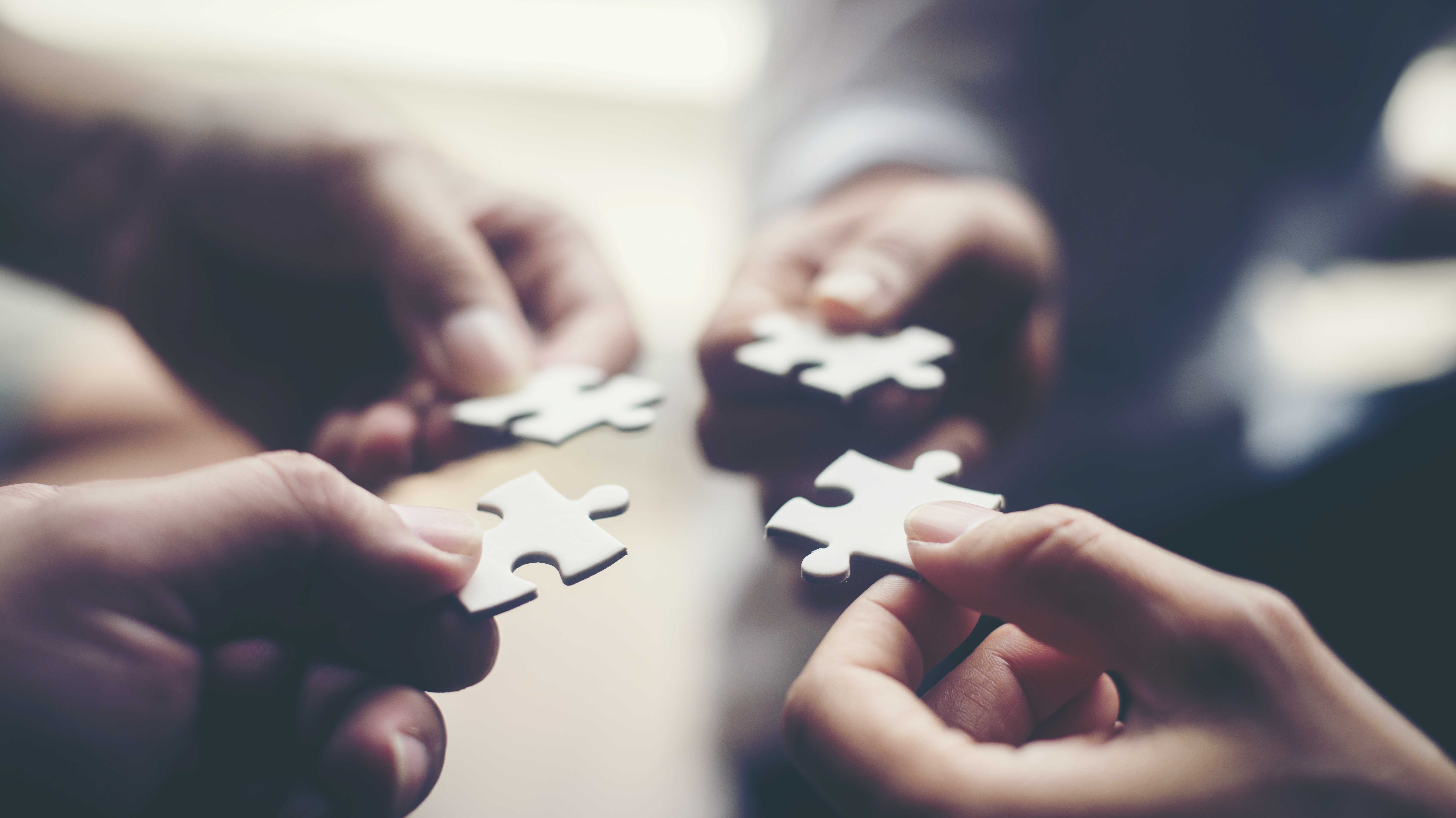 Quatre mains tenant des pièces de puzzle blanches, illustrant la collaboration, le travail d'équipe et le rapprochement d'expertises dans un contexte de fusion ou d'acquisition.