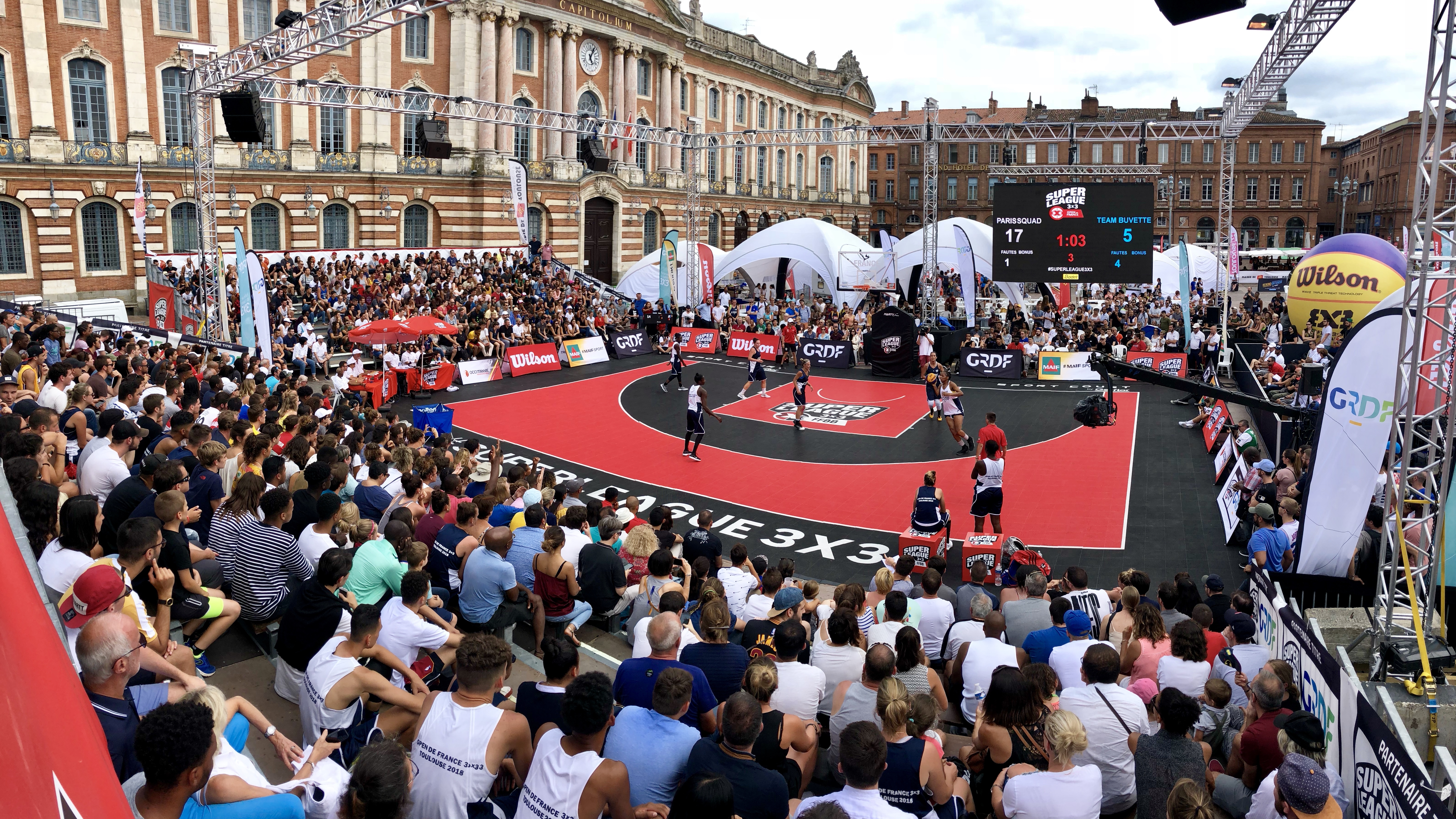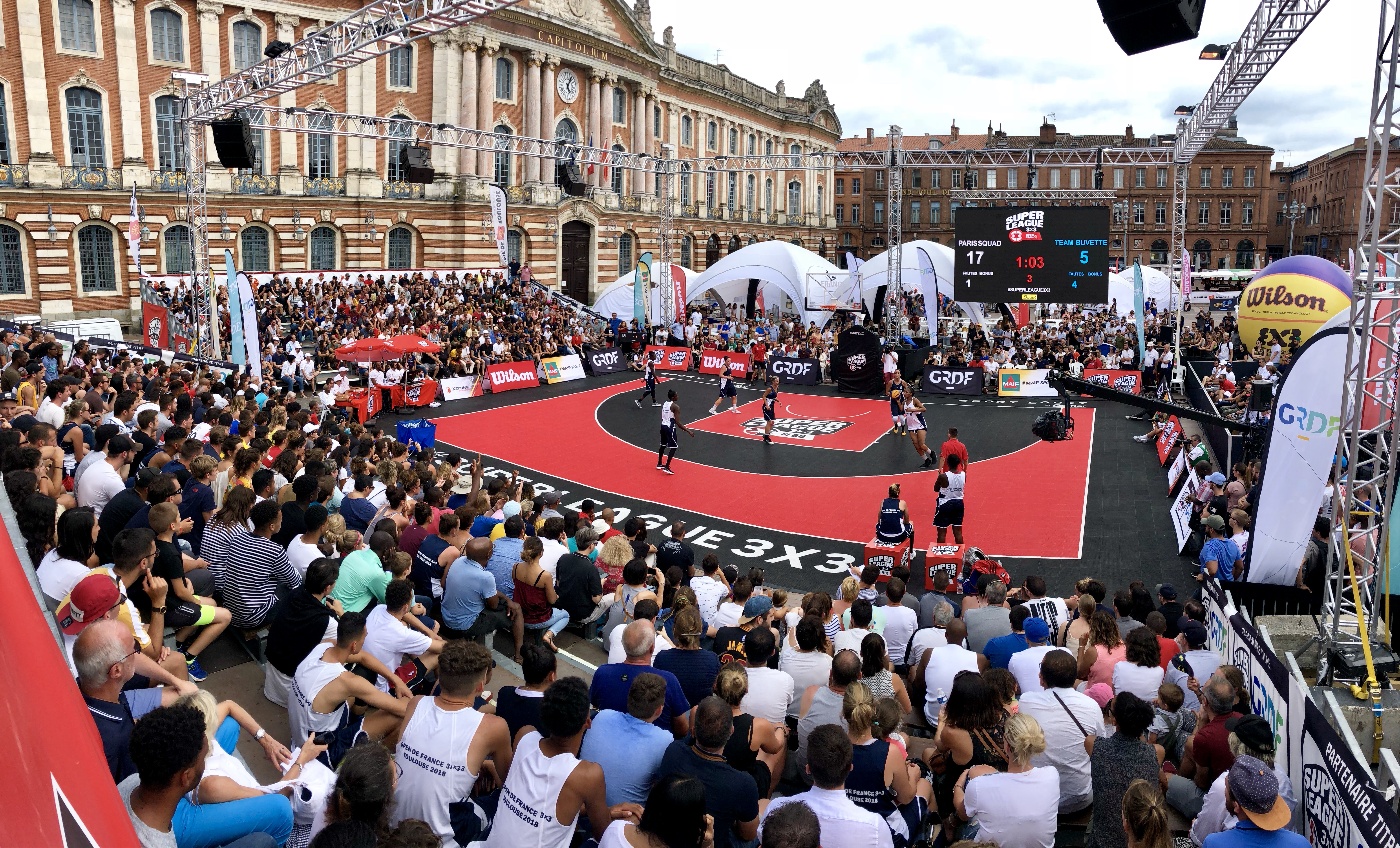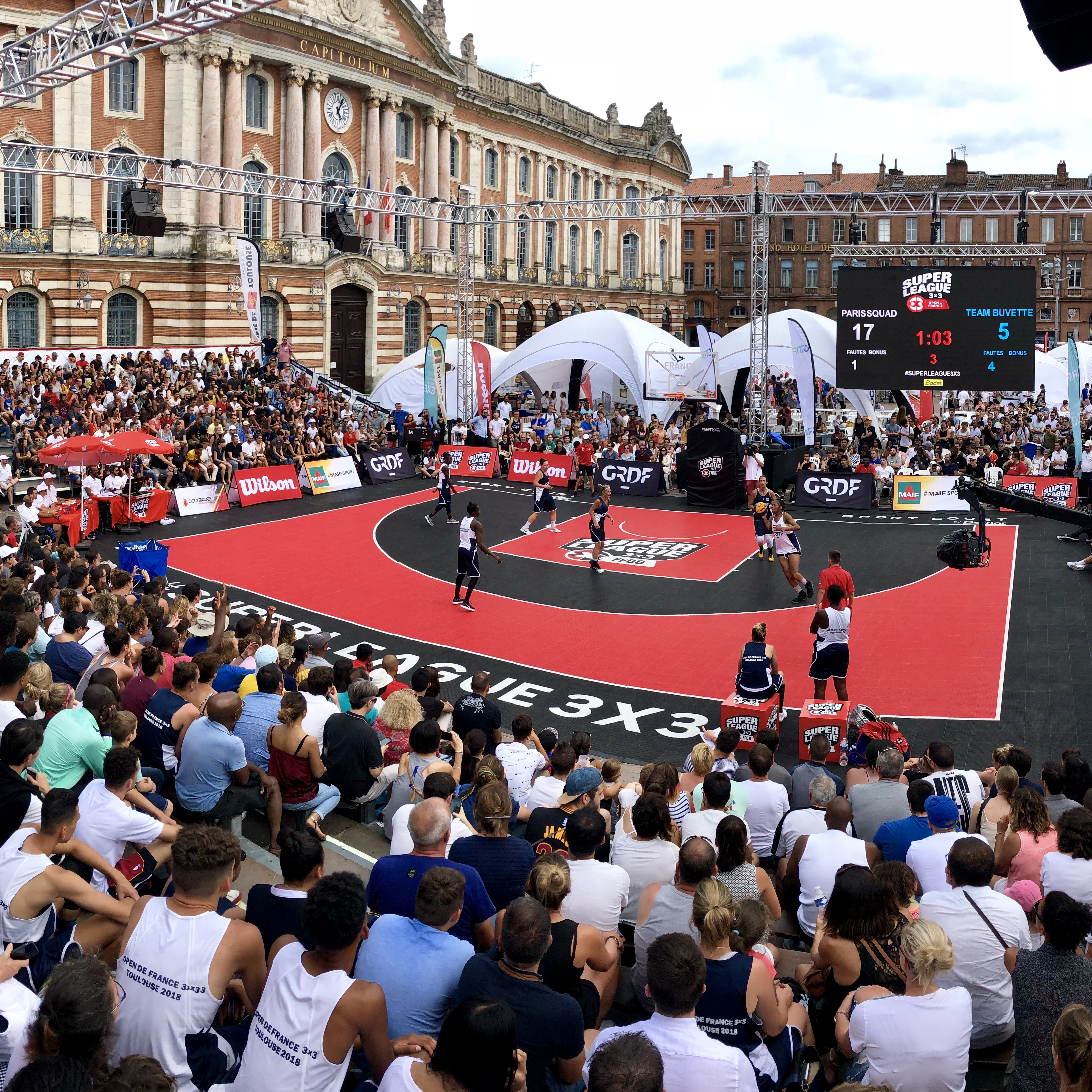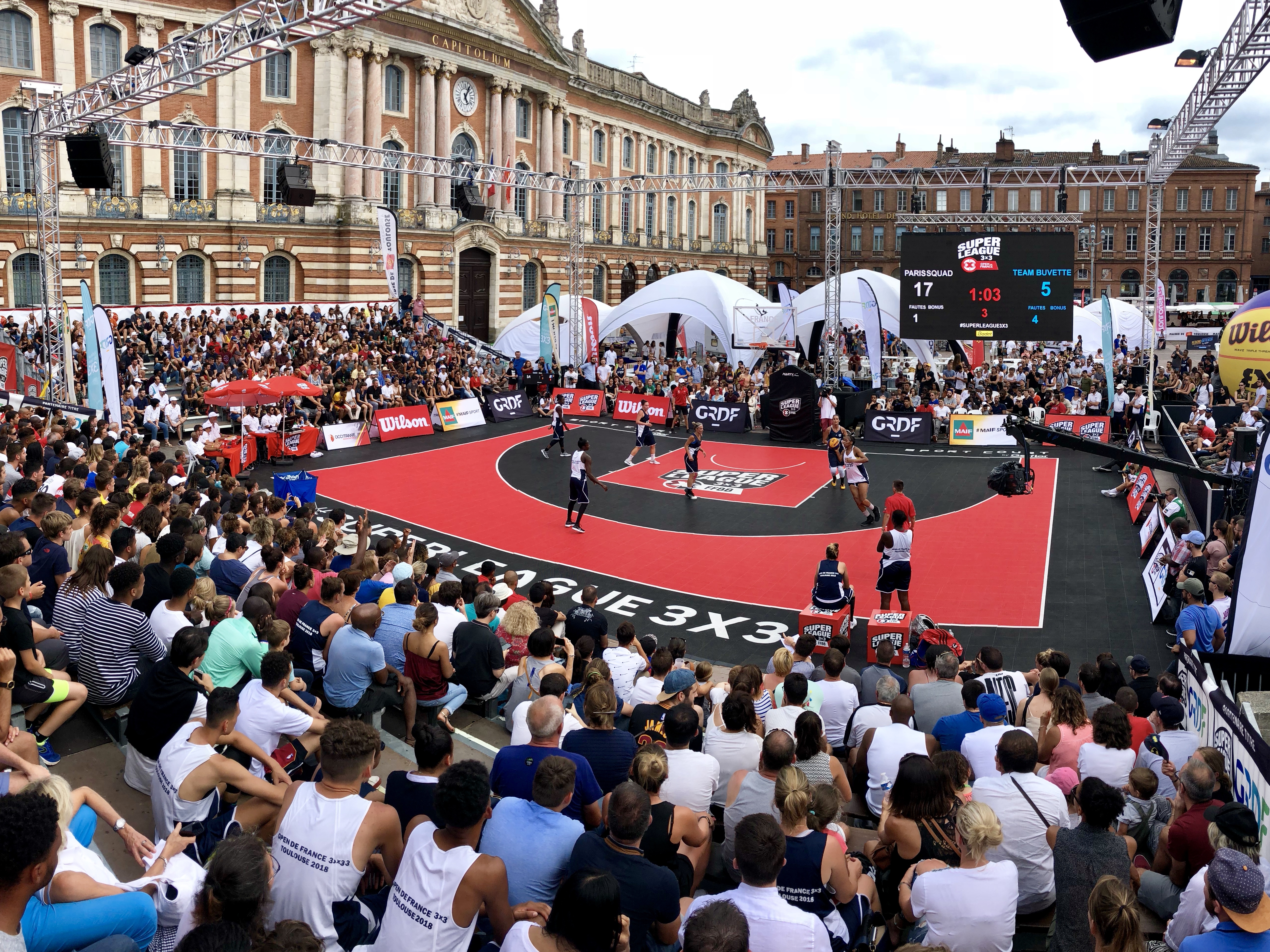 Match de basket 3x3 en plein air sur la Place du Capitole à Toulouse, devant un large public et sous une identité graphique urbaine distinctive.
