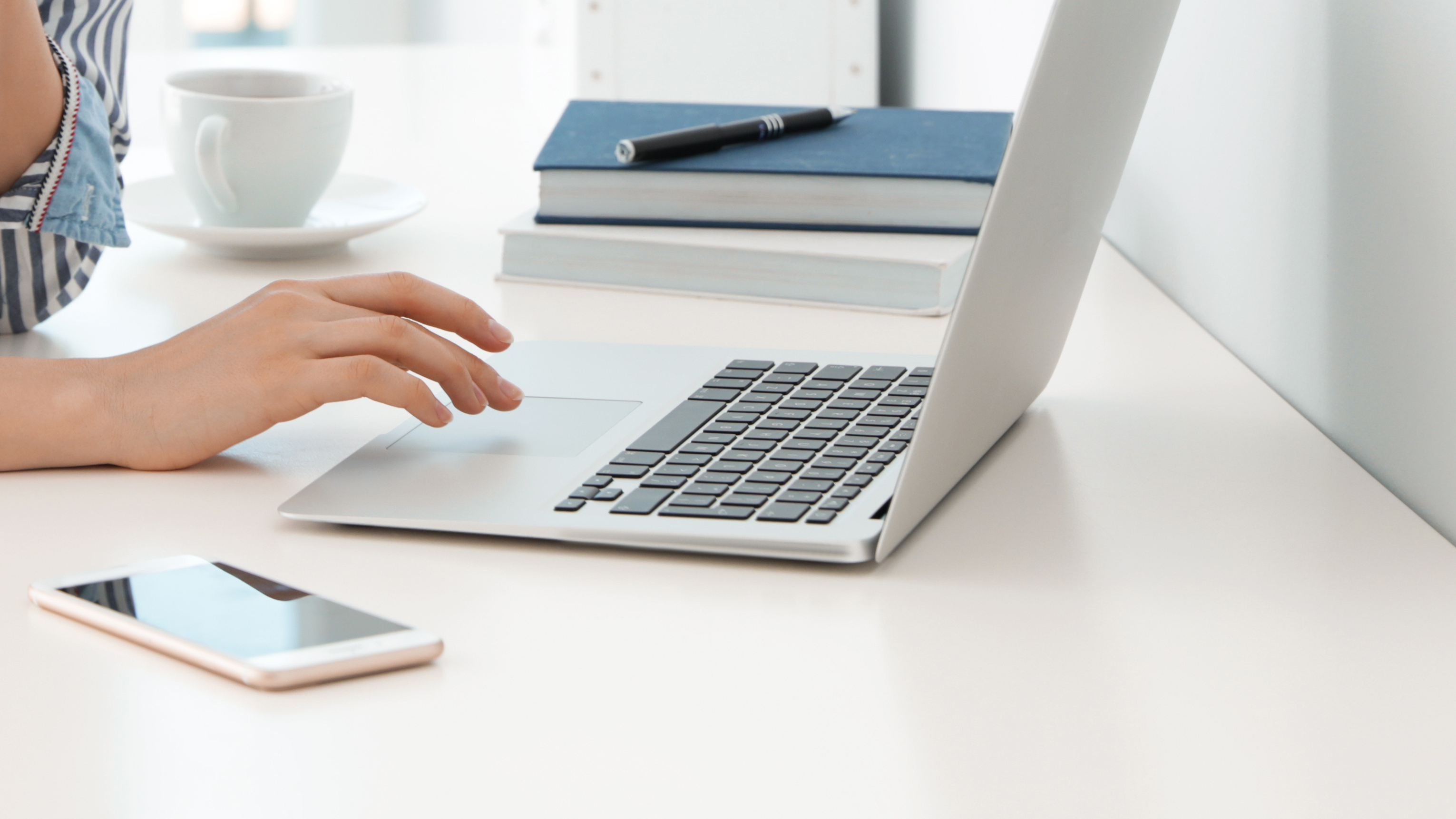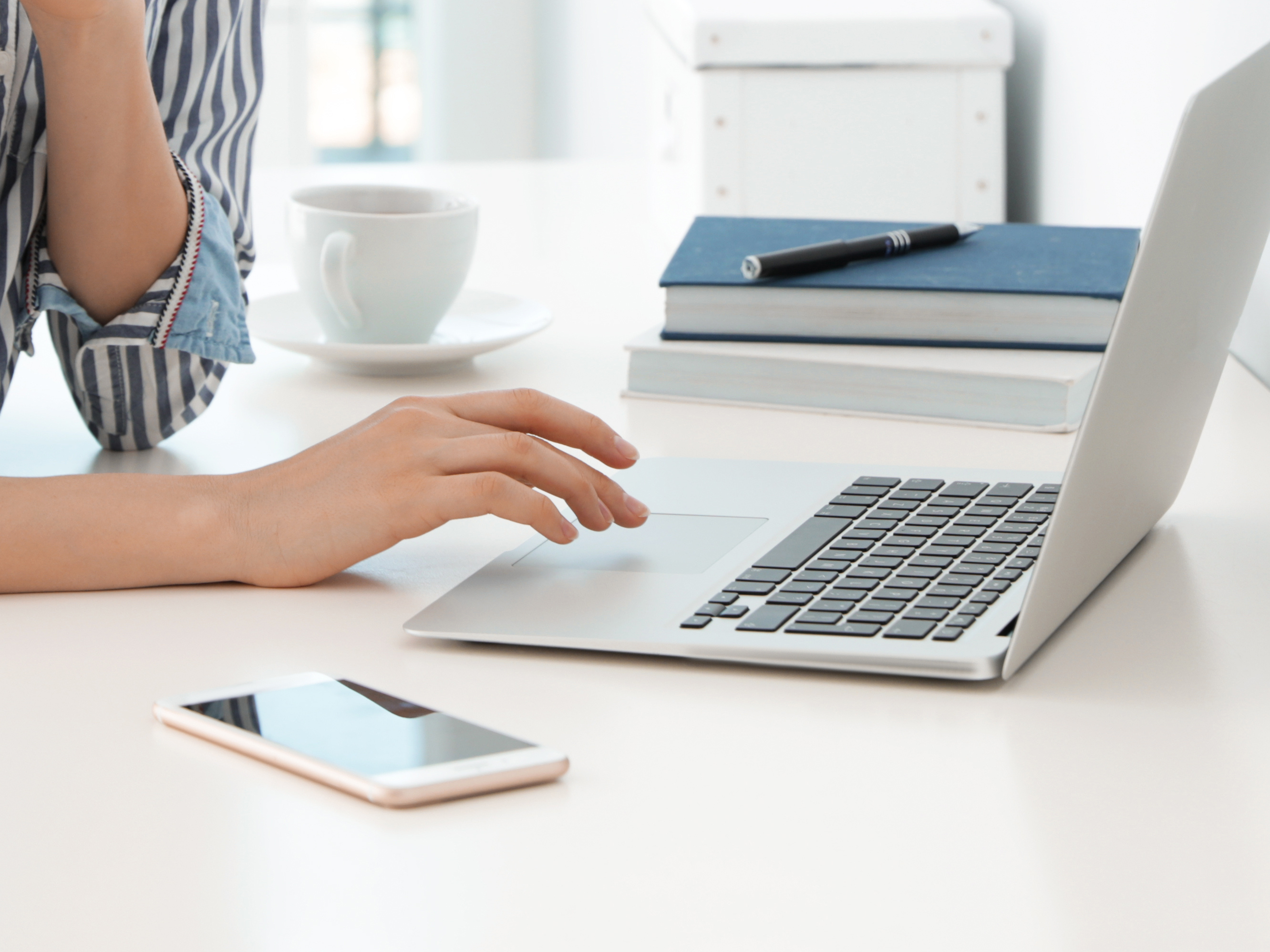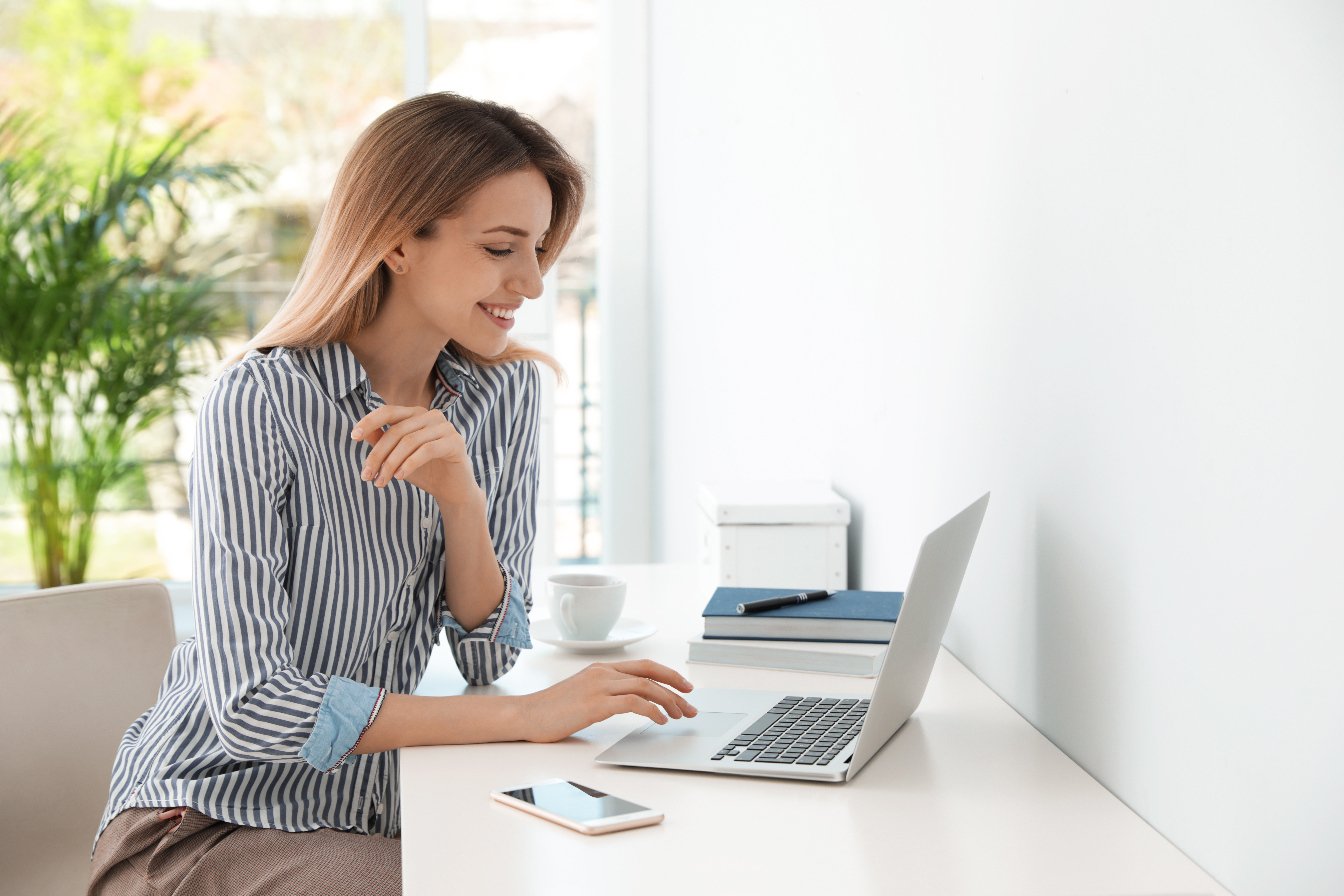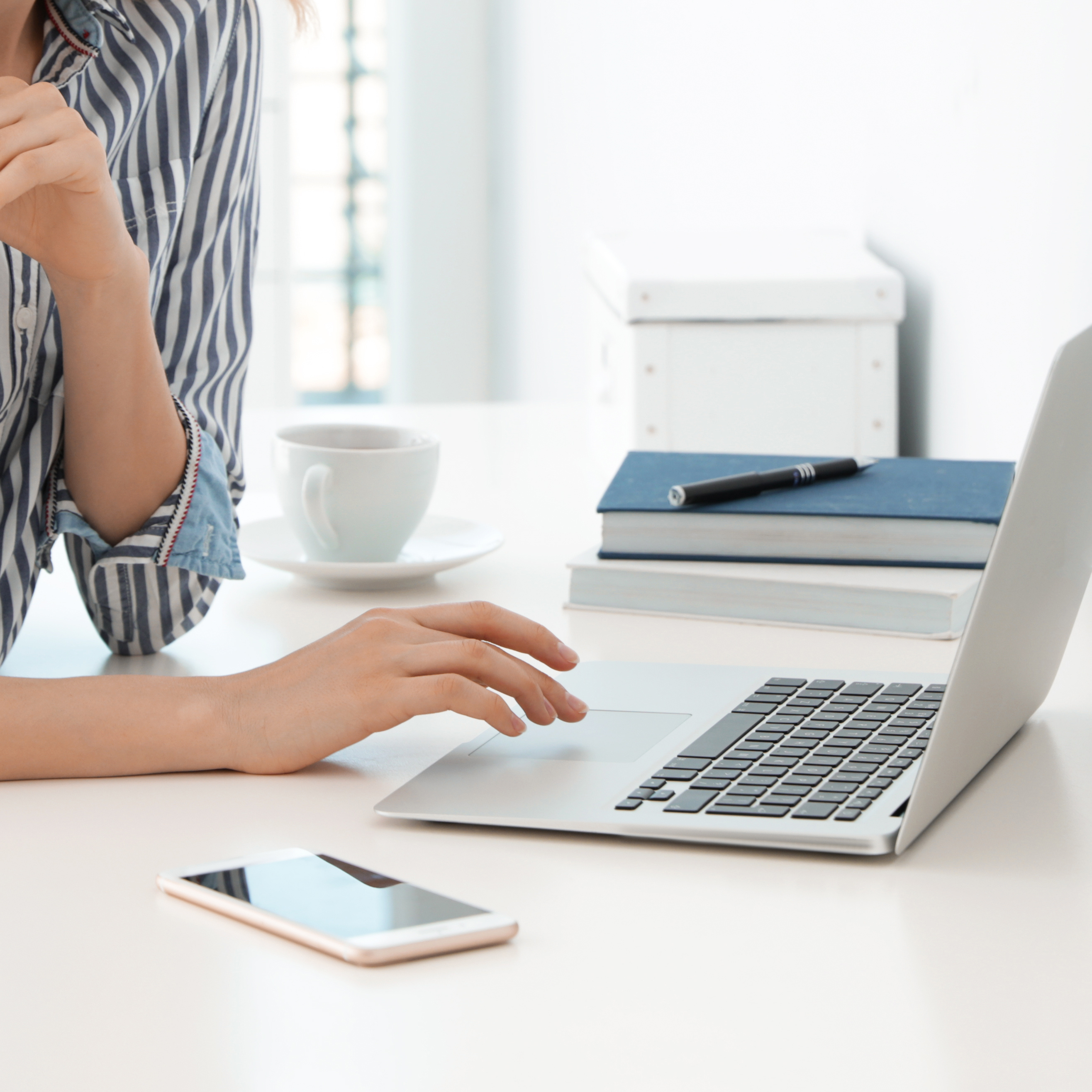 Femme travaillant sur un ordinateur portable dans un espace moderne et lumineux, avec un smartphone, des livres et une tasse de café sur le bureau.
