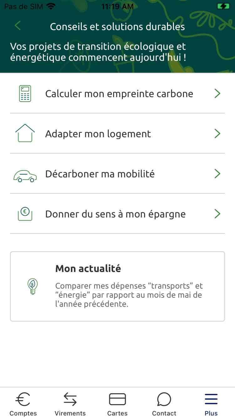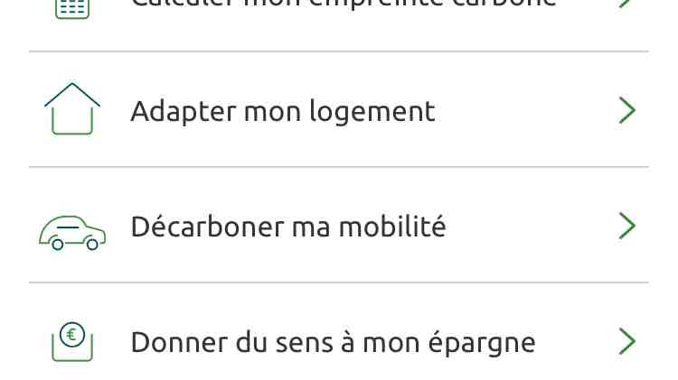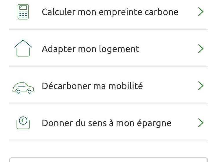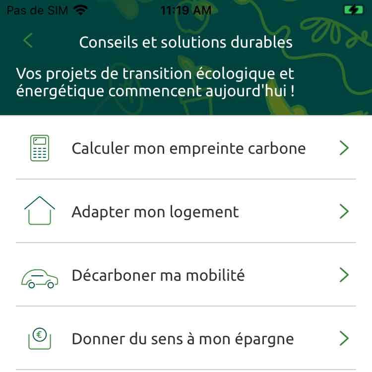 Capture d'écran de l'application mobile Banque Populaire ou Caisse d'Épargne affichant la plateforme Conseils et Solutions Durables, avec des options pour calculer son empreinte carbone, adapter son logement, décarboner sa mobilité et orienter son épargne vers des projets responsables.