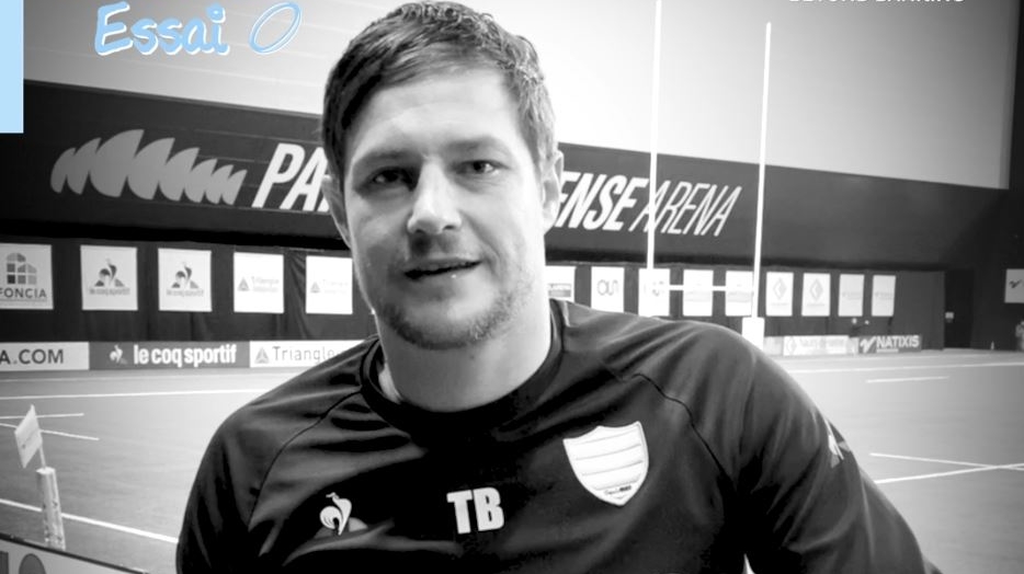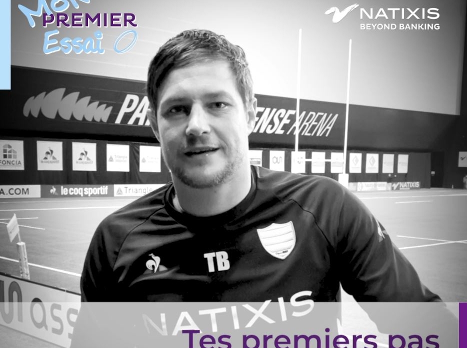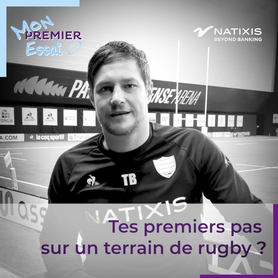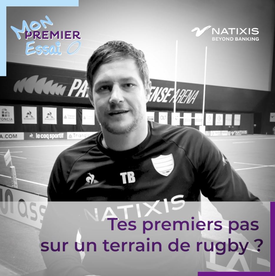 Portrait d'un joueur du Racing 92 dans une salle de rugby, visuel de la campagne Natixis 'Mon Premier Essai' en soutien aux écoles de rugby amateur.
