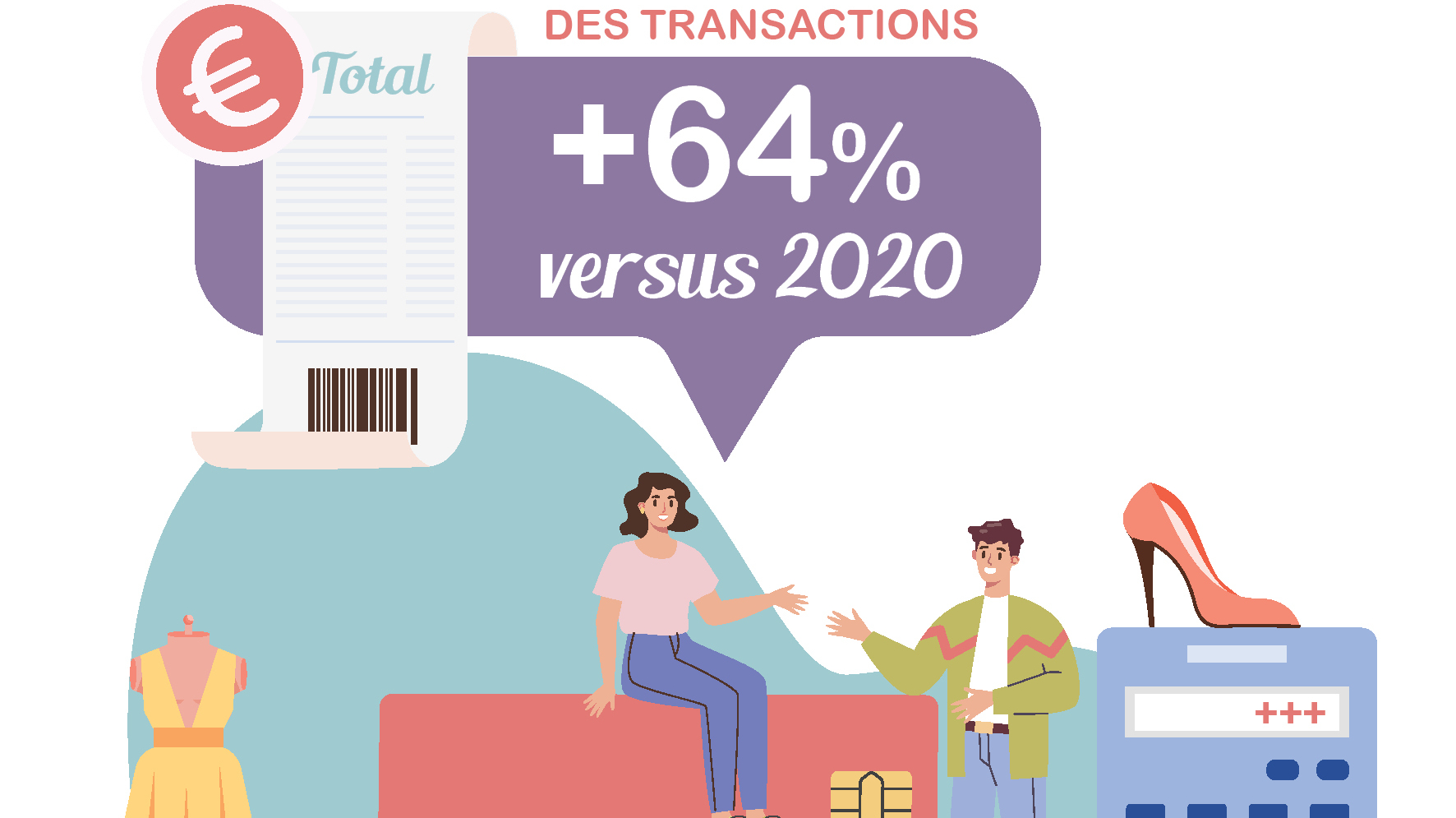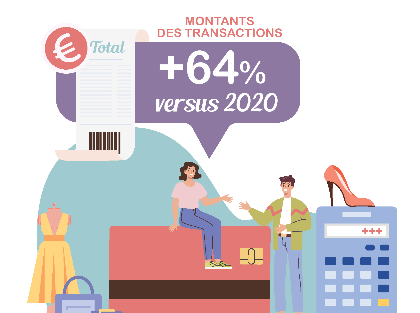 Infographie illustrant l’augmentation de 64% des montants des transactions dans le prêt-à-porter en France en 2021 par rapport à 2020, selon l’Observatoire Natixis Payments.