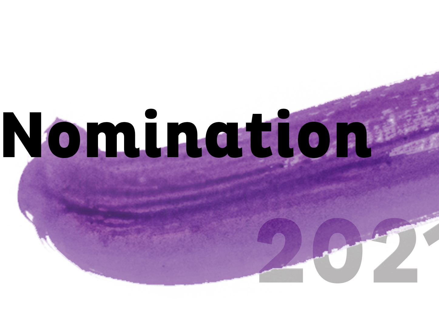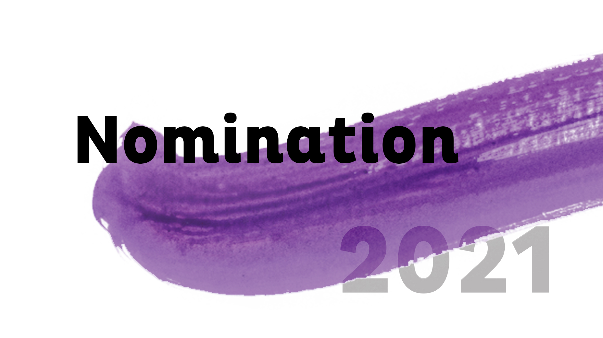 Visuel avec le mot 'Nomination' en noir sur un fond de coup de pinceau violet, accompagné du chiffre 2021 en gris clair en arrière-plan.