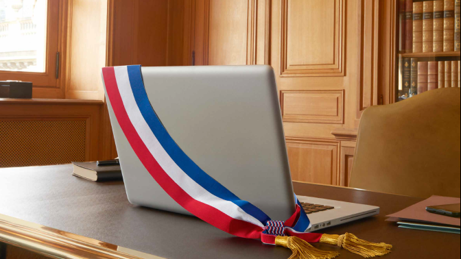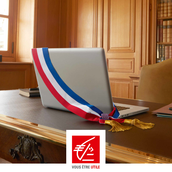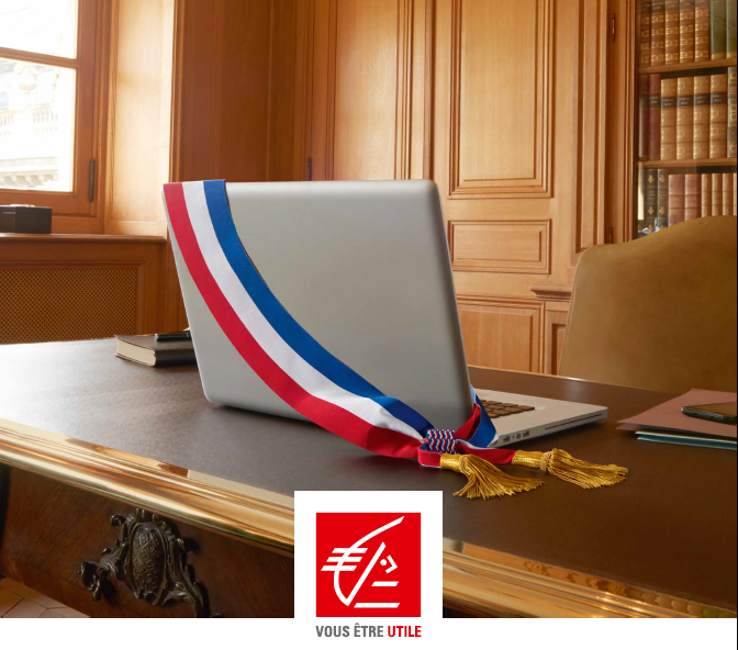 Ordinateur portable sur un bureau officiel, orné de l'écharpe tricolore de maire, illustrant la digitalisation des services aux collectivités locales par la Caisse d'Epargne.