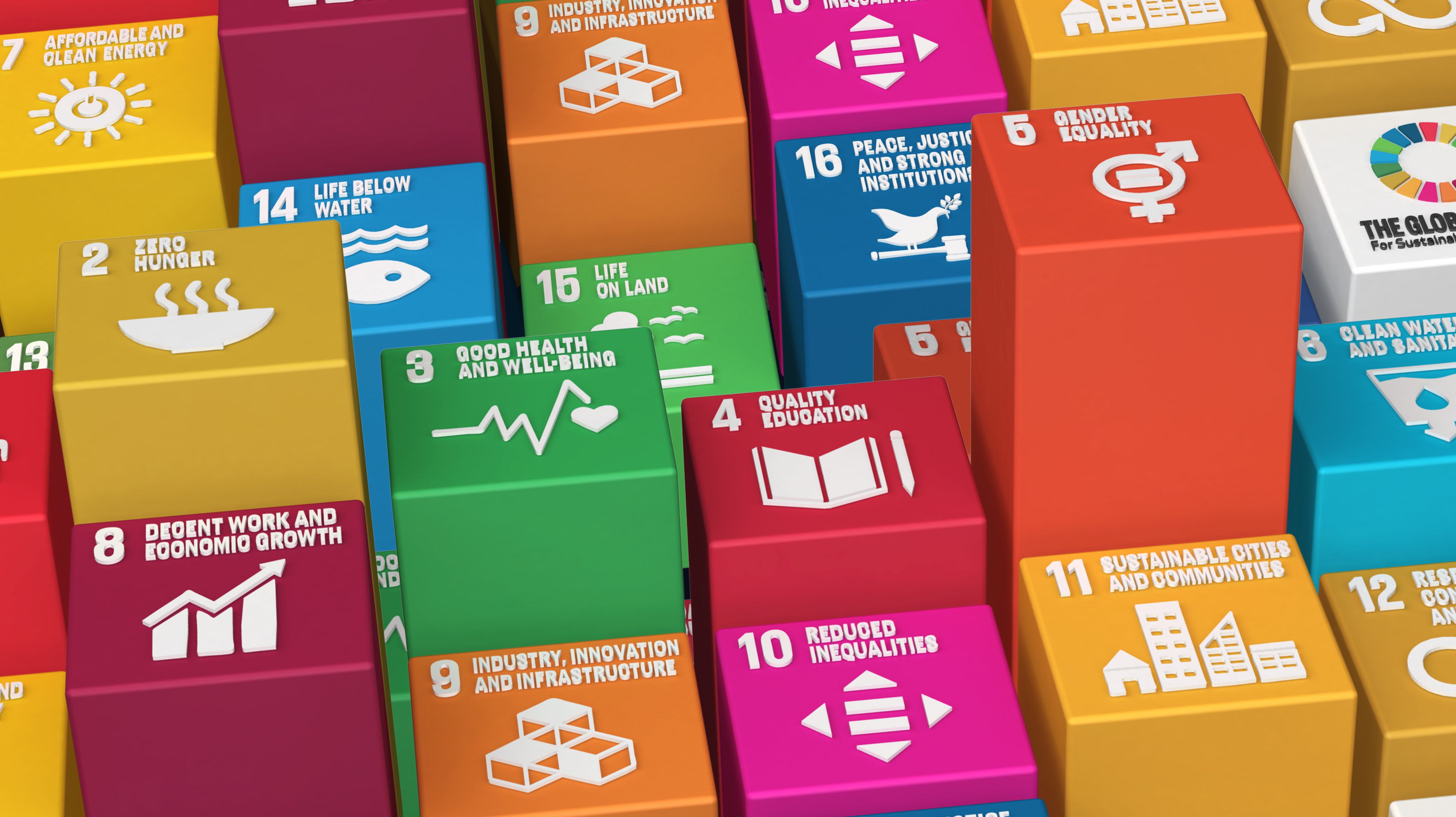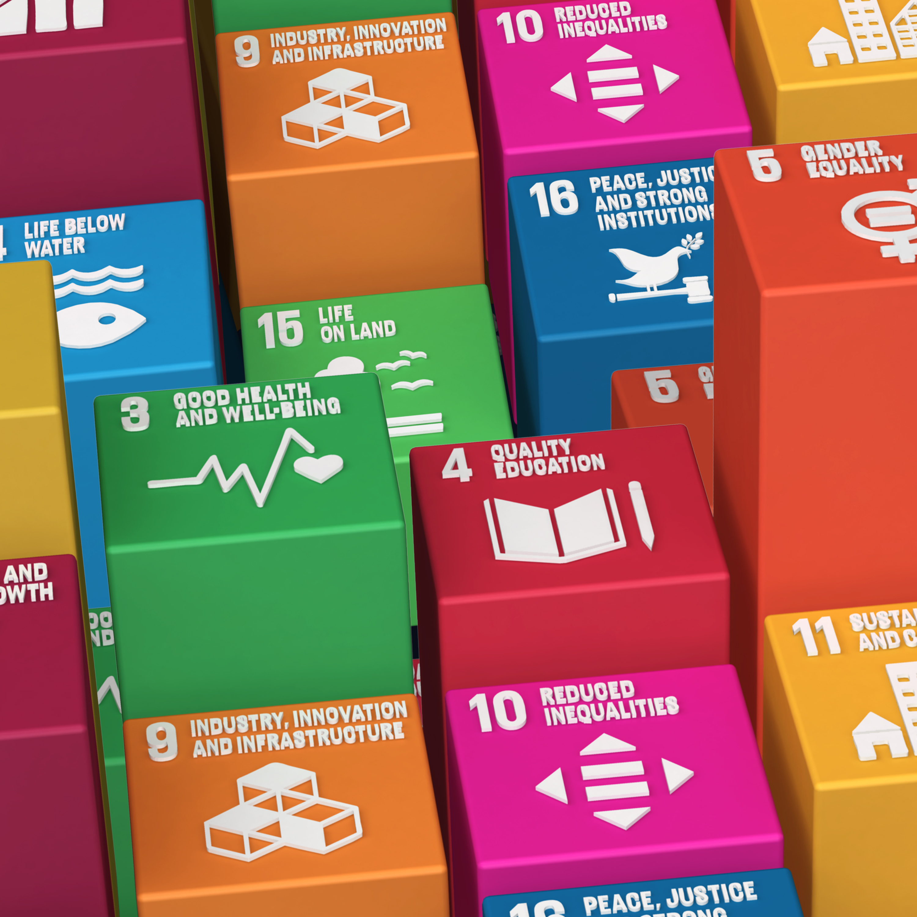 Illustration des objectifs de développement durable des Nations unies sous forme de cubes colorés, avec des pictogrammes représentant chaque objectif, tels que l'énergie propre, la santé, l'éducation et l'égalité.