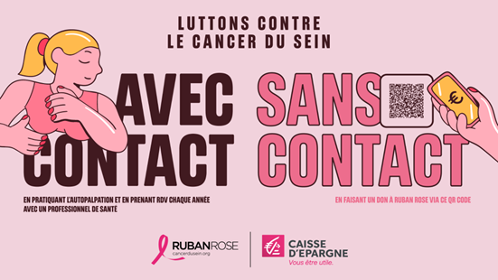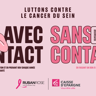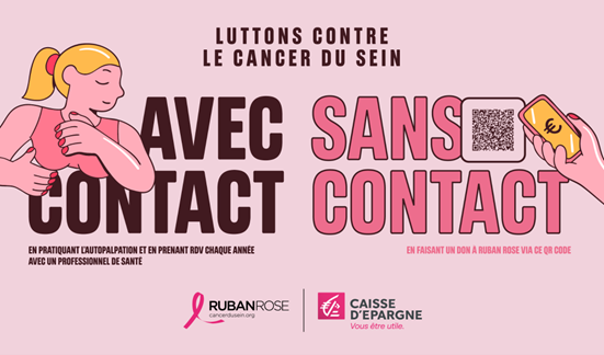 Affiche de sensibilisation à la lutte contre le cancer du sein, présentant les actions 'avec contact' par l'autopalpation et 'sans contact' via un don à Ruban Rose, soutenue par la Caisse d'Epargne.