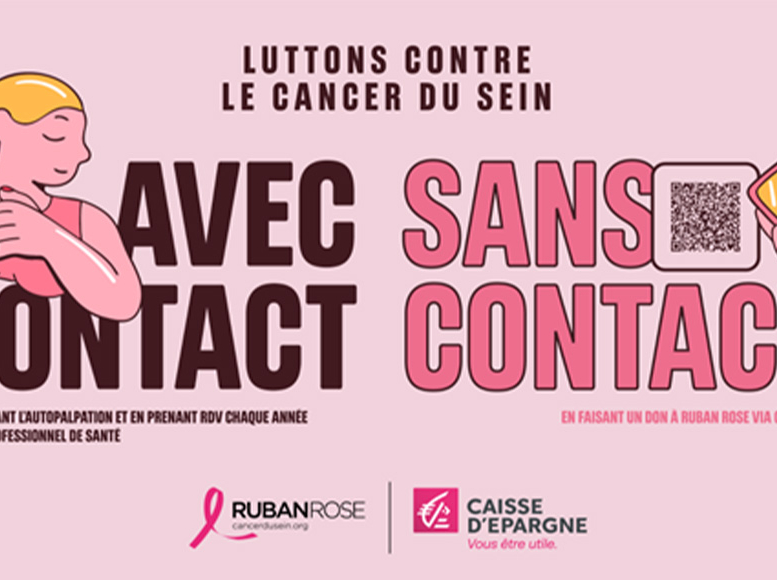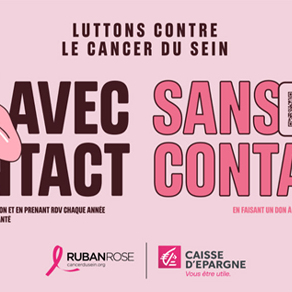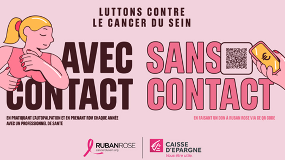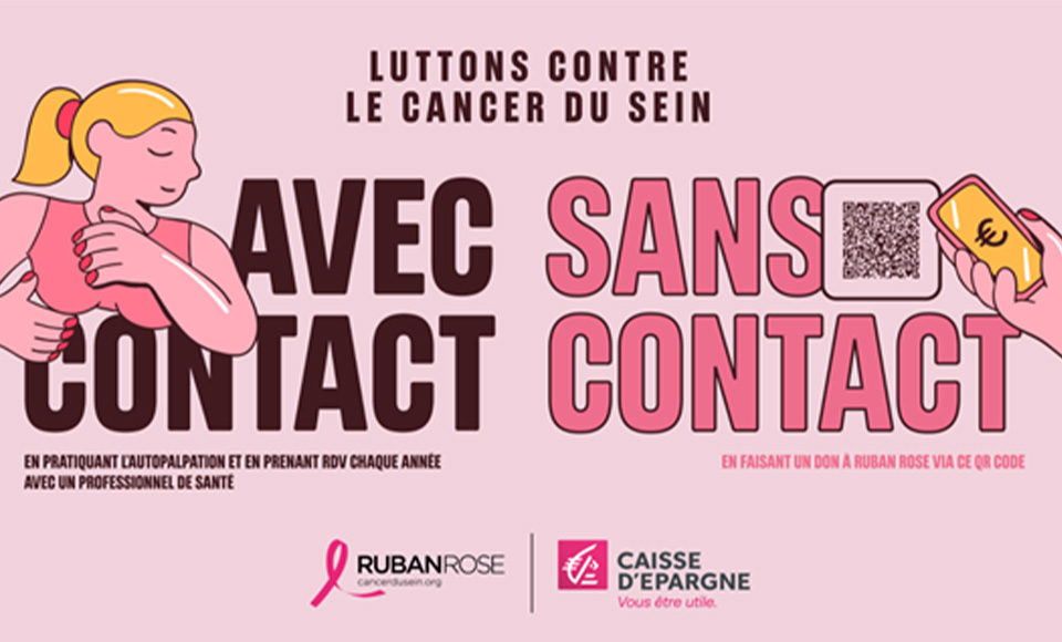 Affiche de sensibilisation Octobre Rose par Caisse d’Epargne, promouvant l’autopalpation et les dons sans contact pour lutter contre le cancer du sein, en partenariat avec Ruban Rose.