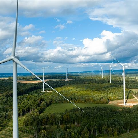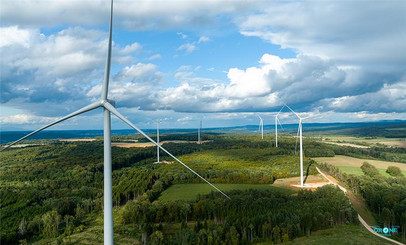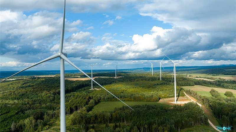 Vue aérienne du parc éolien des Trois Cantons en Bourgogne Franche-Comté, composé de plusieurs éoliennes implantées dans un paysage rural et forestier sous un ciel nuageux, illustrant la production d’électricité verte du Groupe BPCE en partenariat avec Opale.