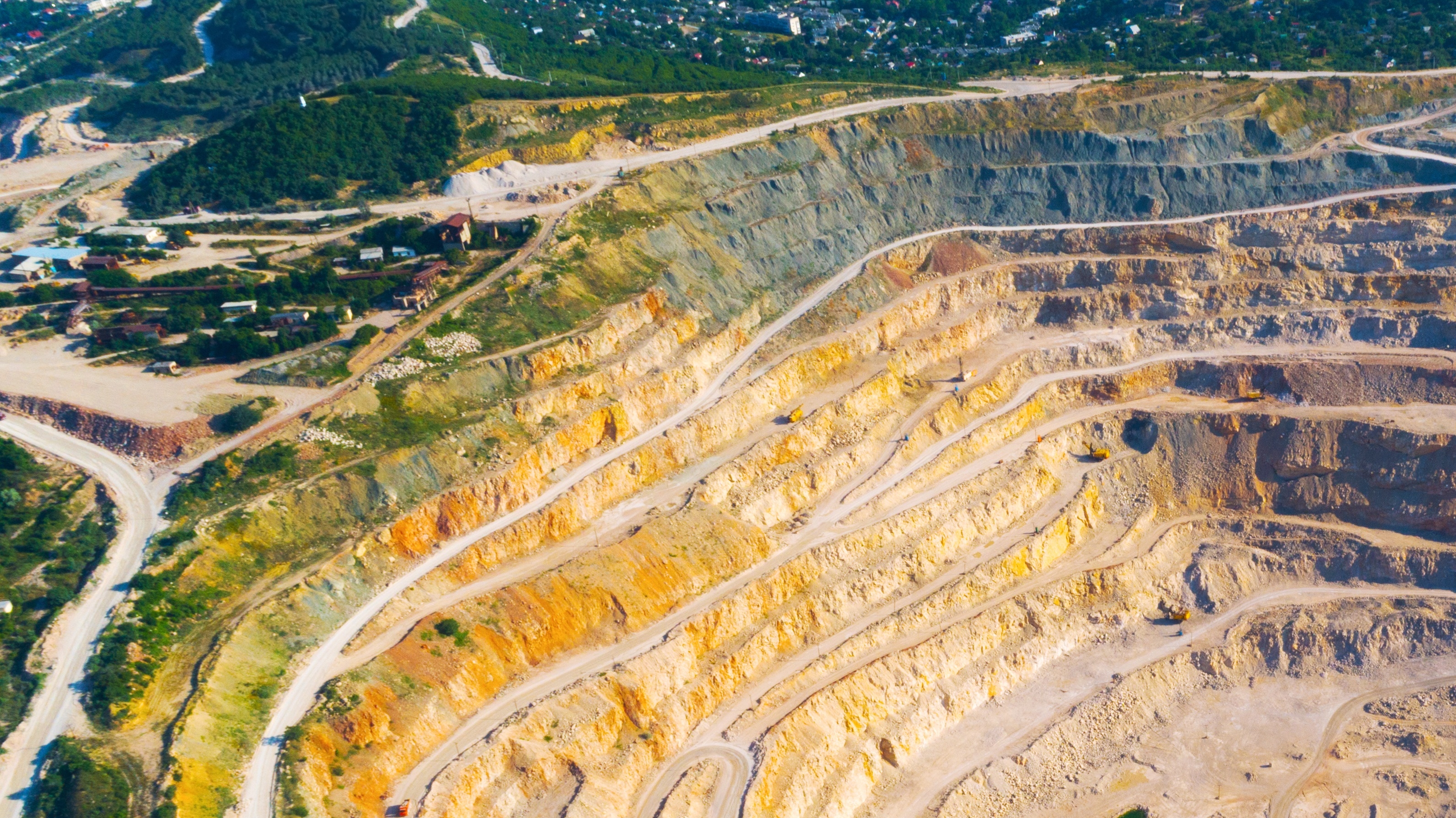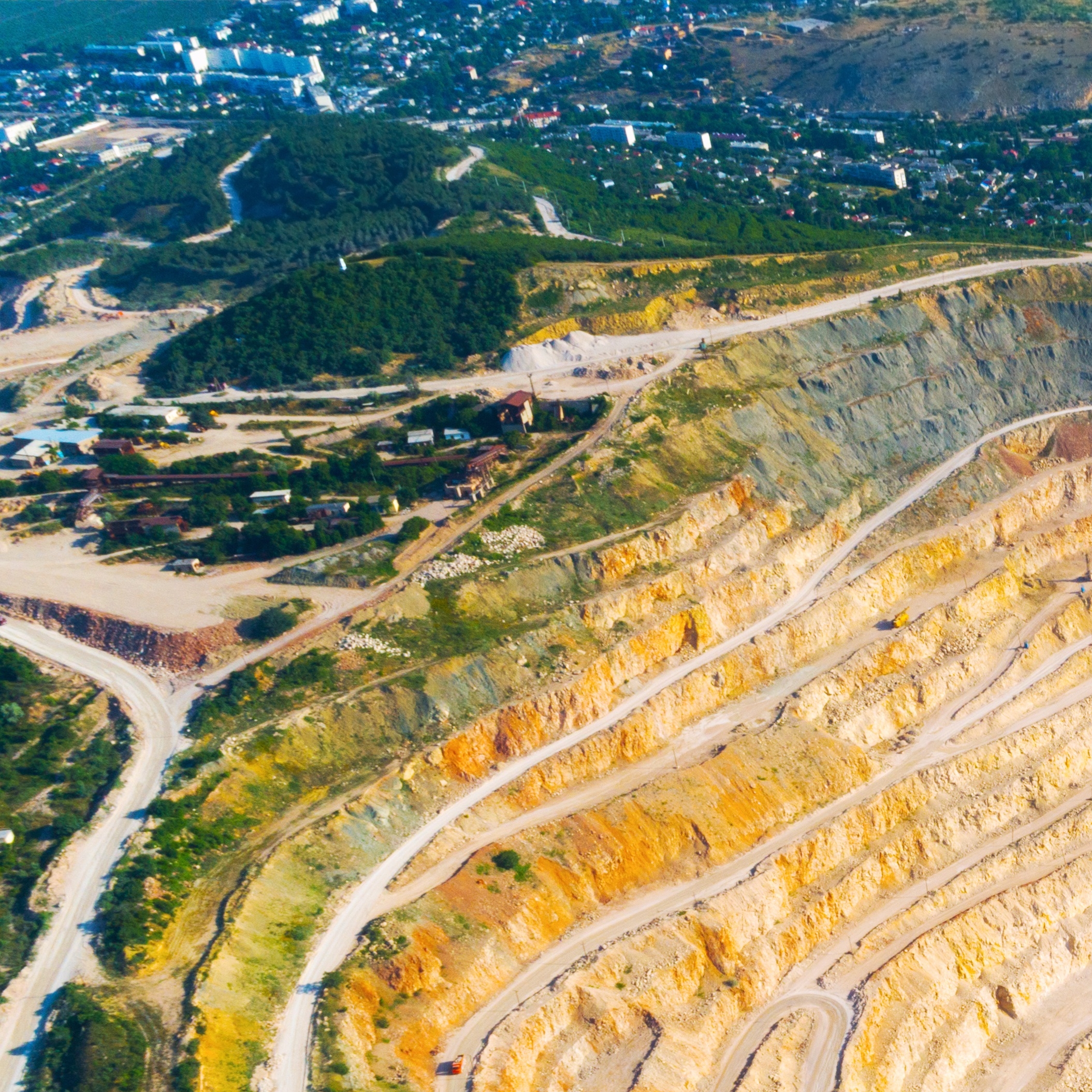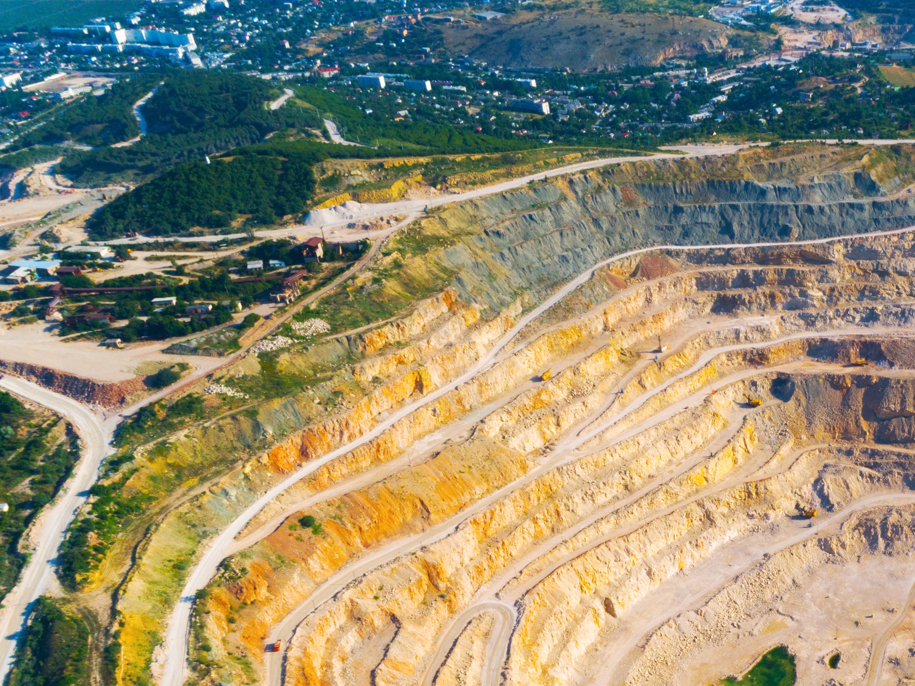 Vue aérienne d'une mine à ciel ouvert montrant les différentes couches de terrassement, utilisée pour l’extraction de minerais près de la surface terrestre.