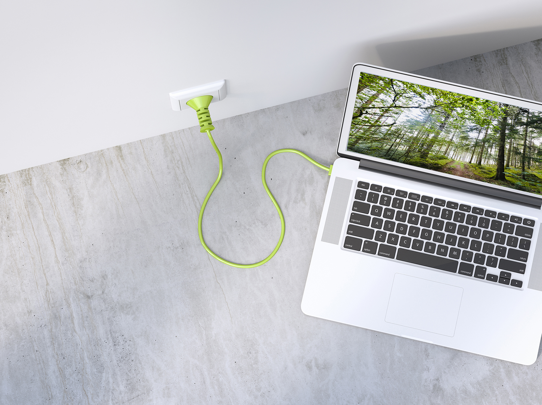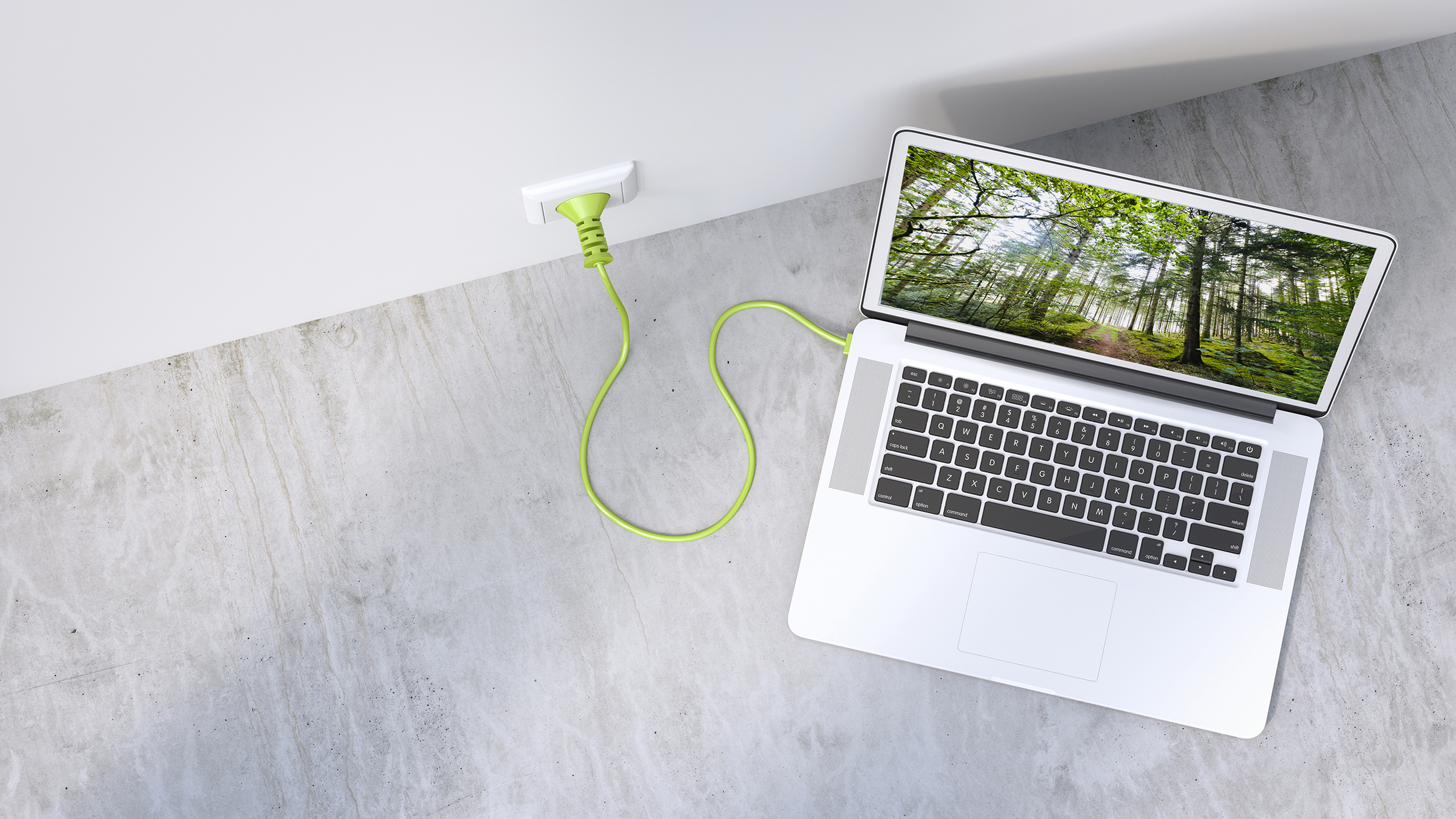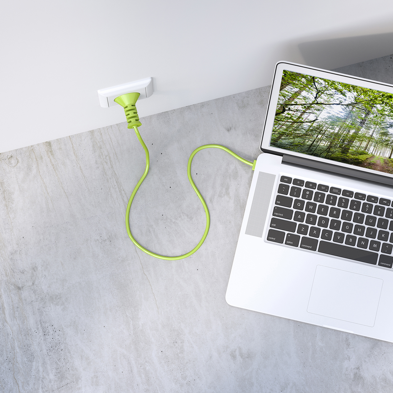 Vue d'un ordinateur portable branché à une prise murale avec un câble vert, affichant une forêt sur son écran, illustrant le lien entre numérique et environnement.
