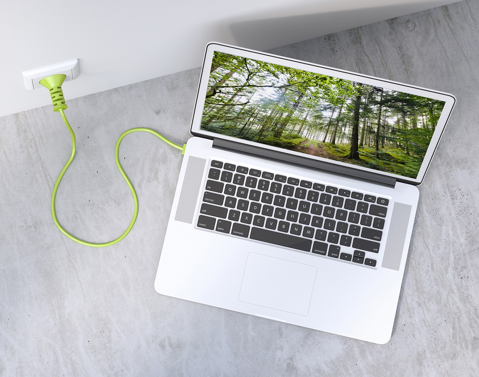 Ordinateur portable en charge sur secteur, affichant une forêt verdoyante à l'écran, illustrant le lien entre technologie et développement durable.