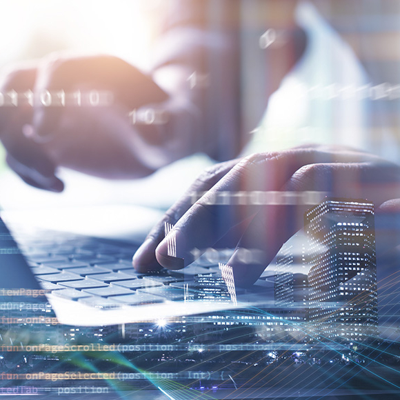 Mains en train de taper sur le clavier d'un ordinateur portable, avec une superposition de codes informatiques et de bâtiments urbains illustrant l'innovation technologique appliquée au secteur bancaire.