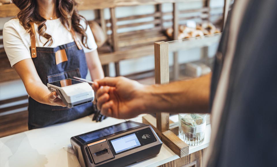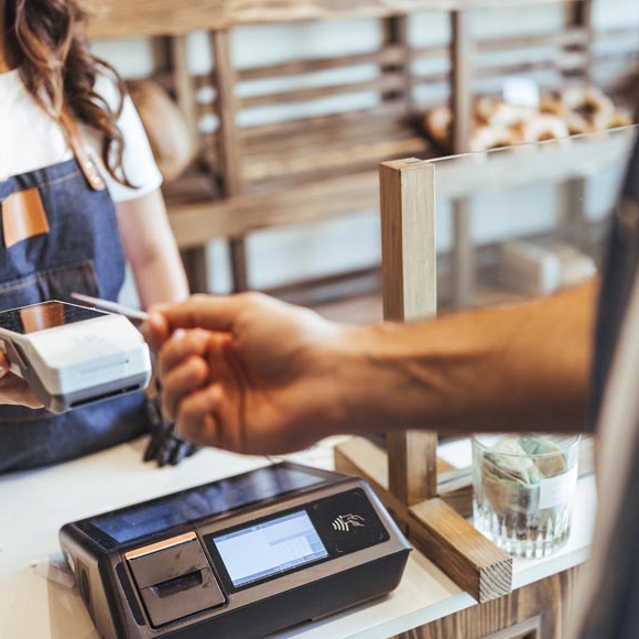 Paiement sans contact par carte bancaire sur un terminal de point de vente dans une boutique moderne.