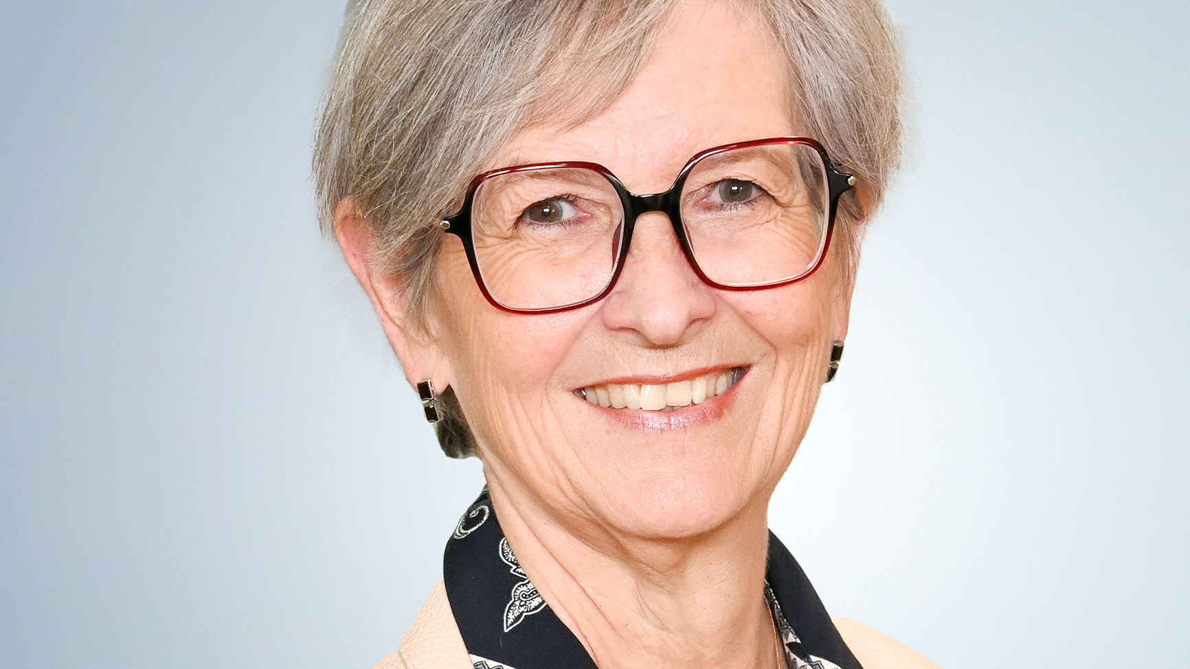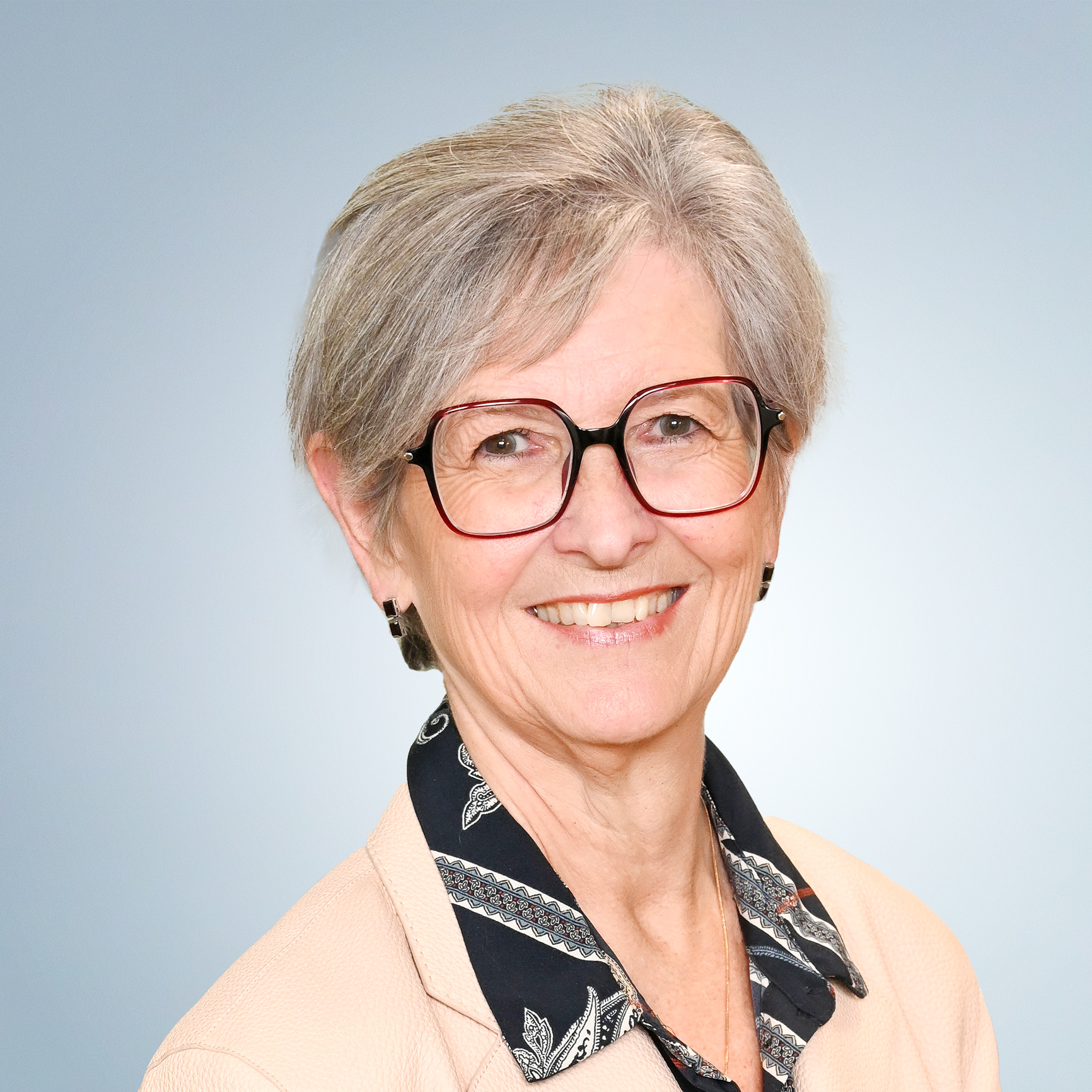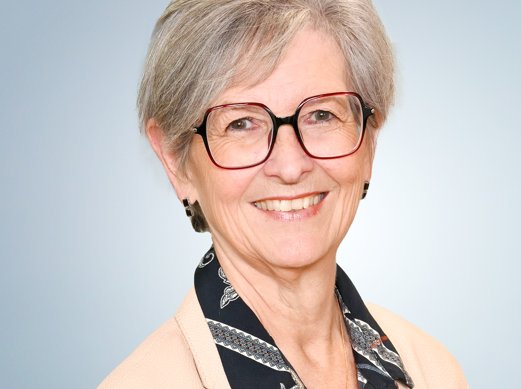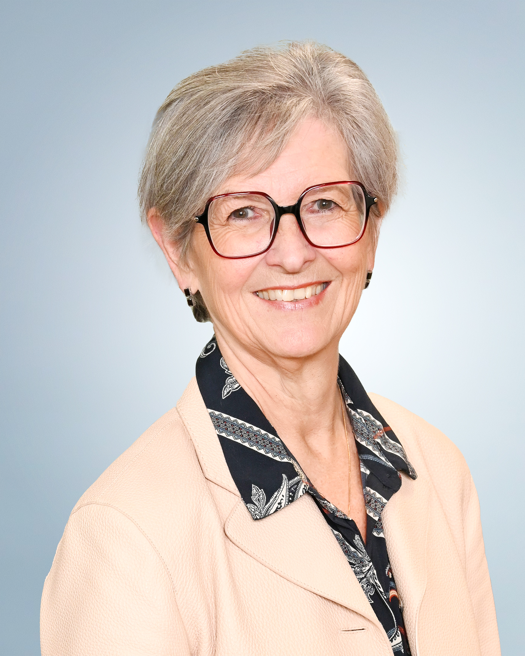 Portrait professionnel d'une femme senior souriante devant un fond uni, adapté à une utilisation institutionnelle ou d'entreprise.