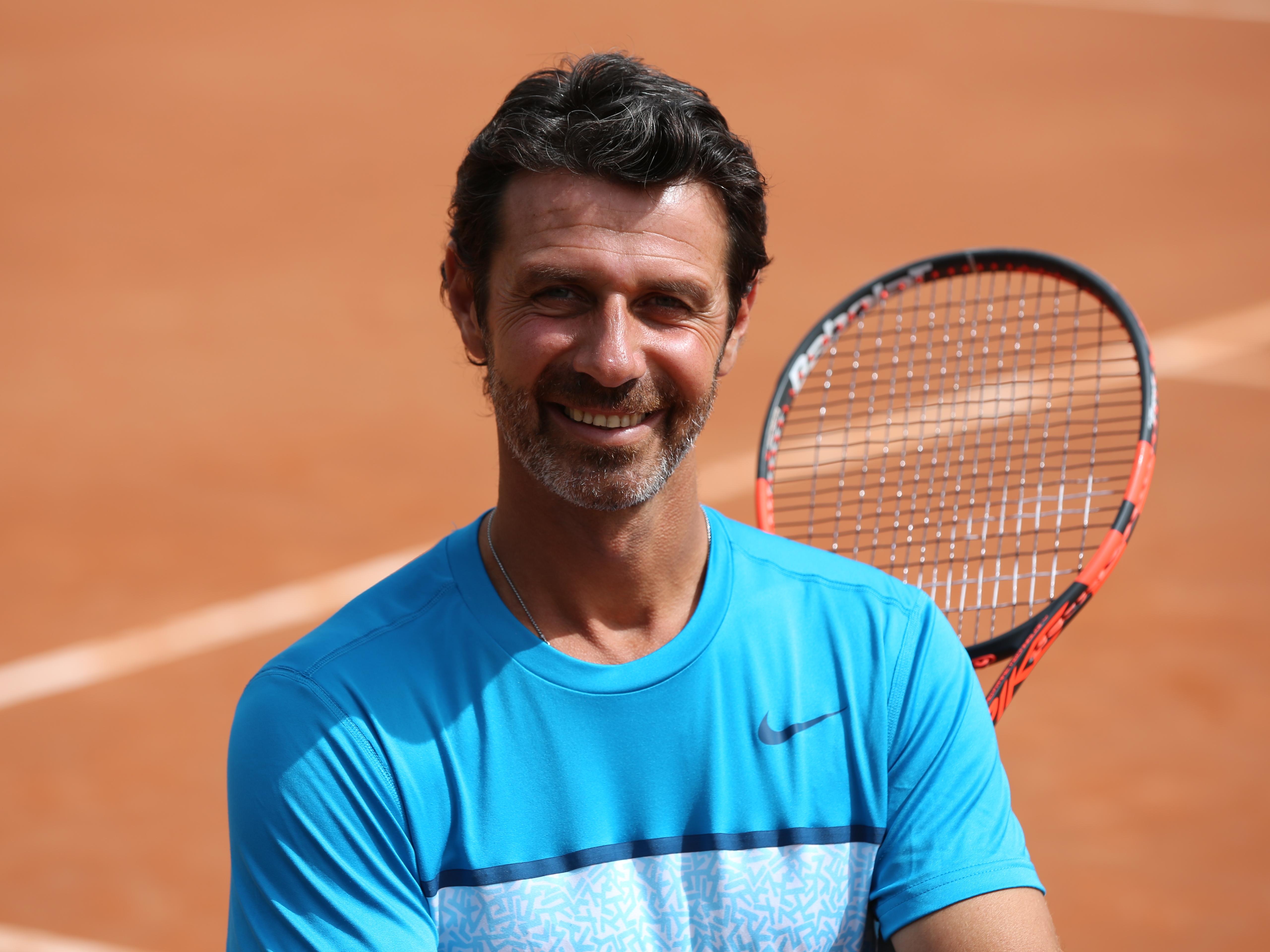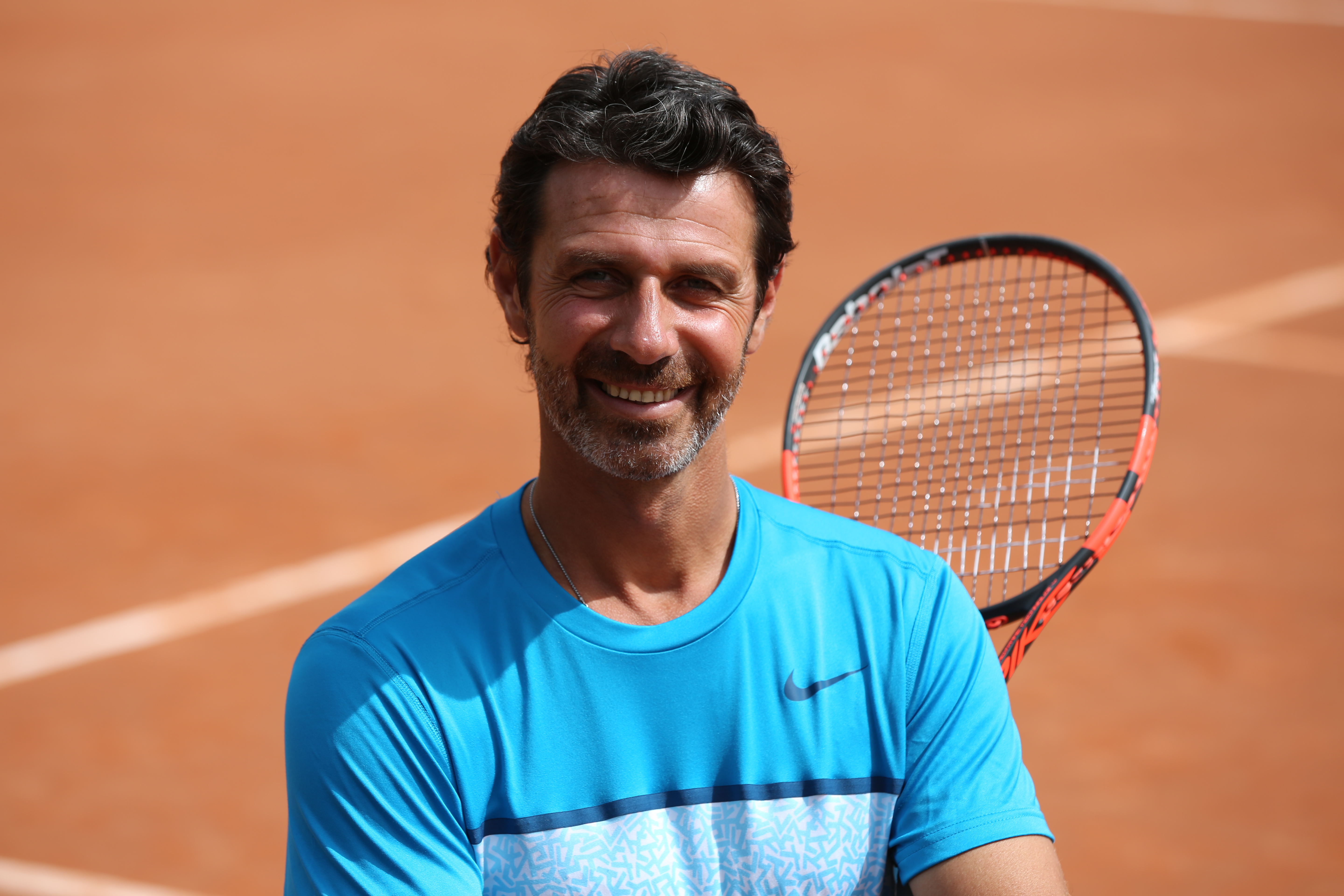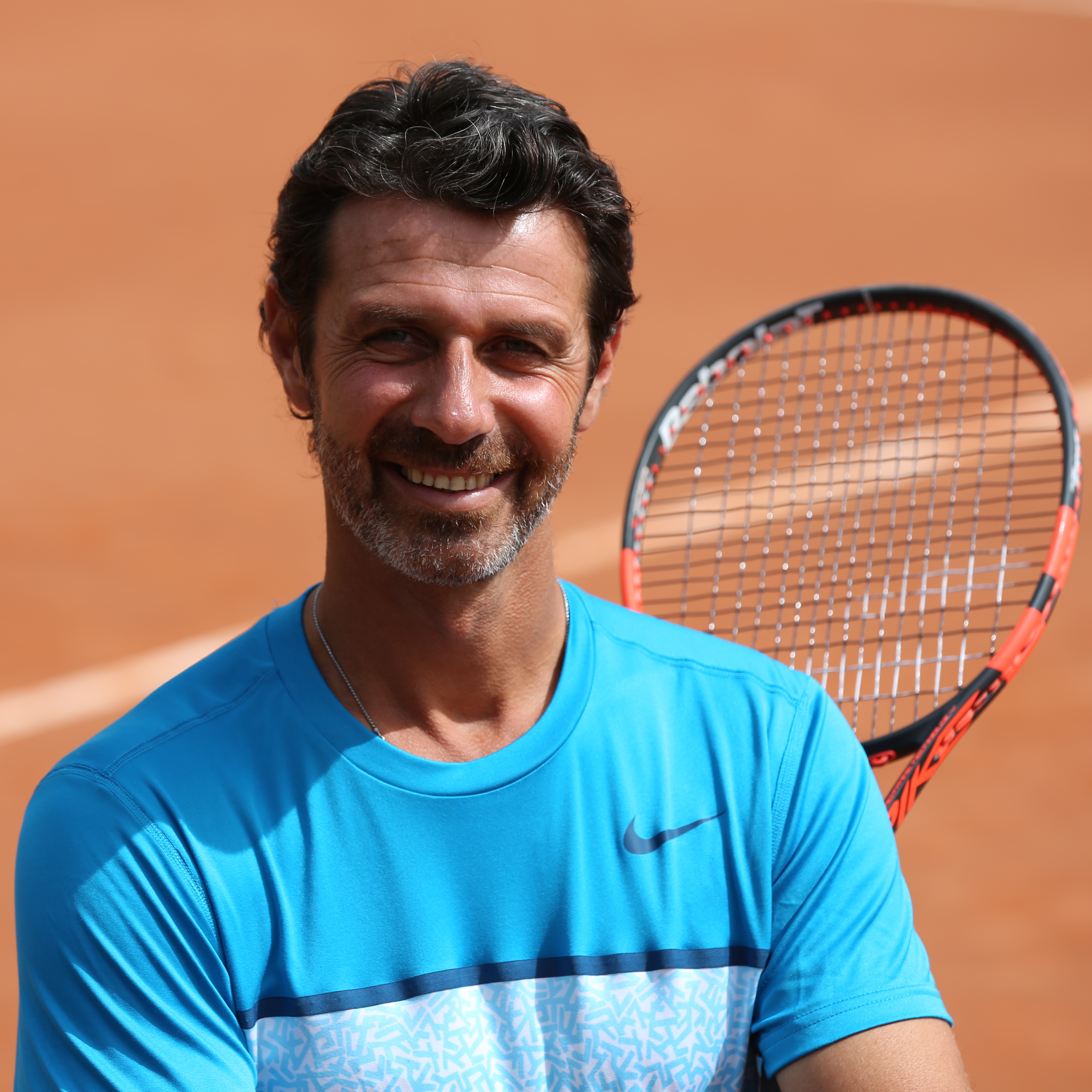 Portrait de Patrick Mouratoglou, célèbre coach de tennis, sur un court en terre battue avec une raquette à la main.