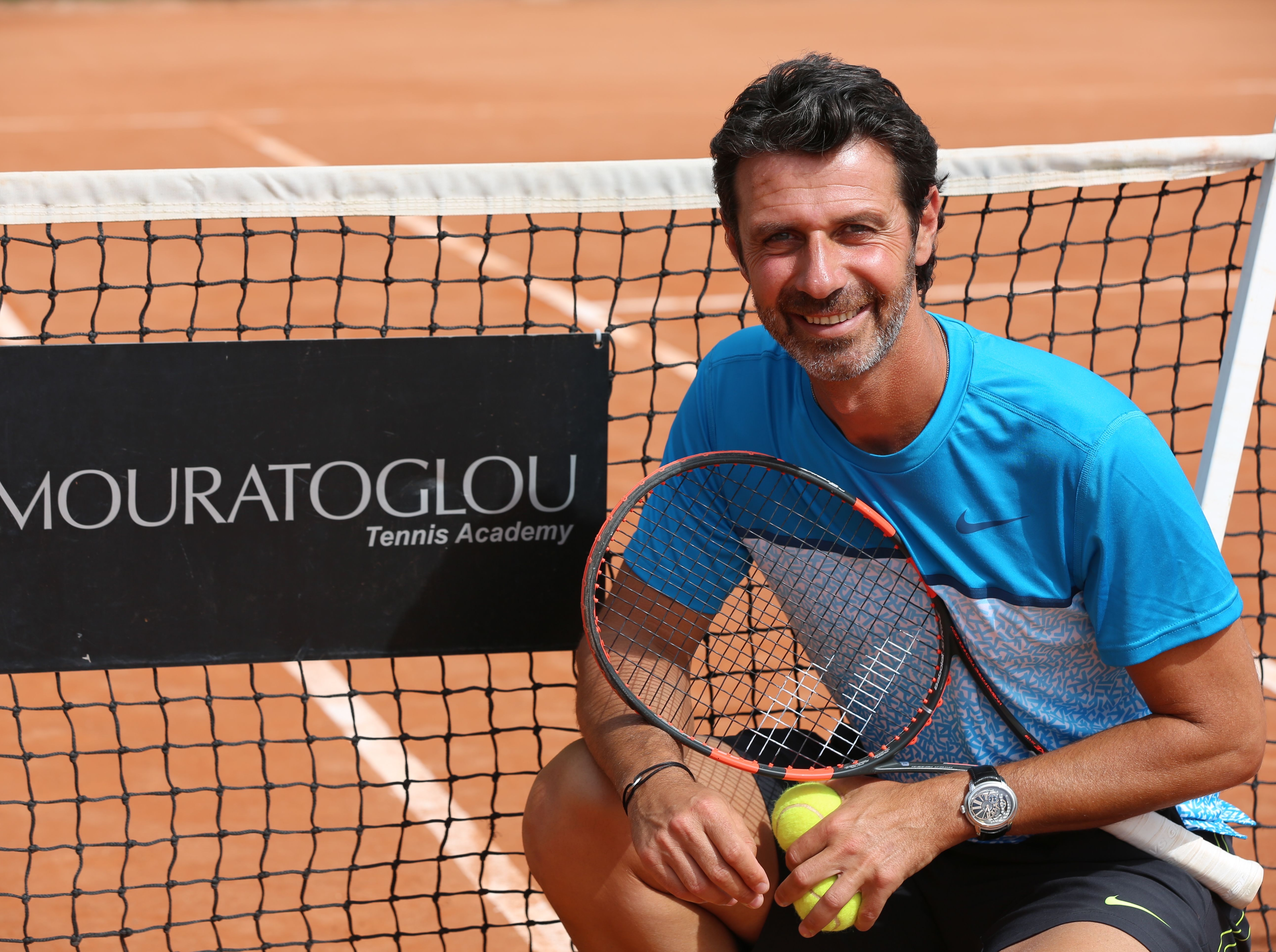 Portrait de Patrick Mouratoglou souriant, assis devant un filet de tennis sur un court en terre battue, tenant une raquette et une balle, avec le panneau Mouratoglou Tennis Academy en arrière-plan.