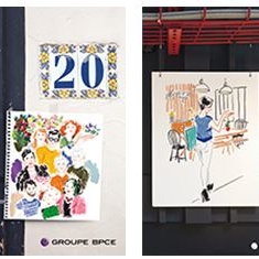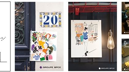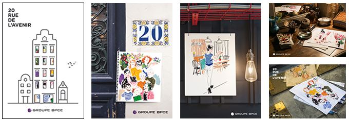 Visuels illustrant le rapport d'activité 2017 du Groupe BPCE, intitulé 20 rue de l'Avenir, avec des illustrations et ambiances littéraires.