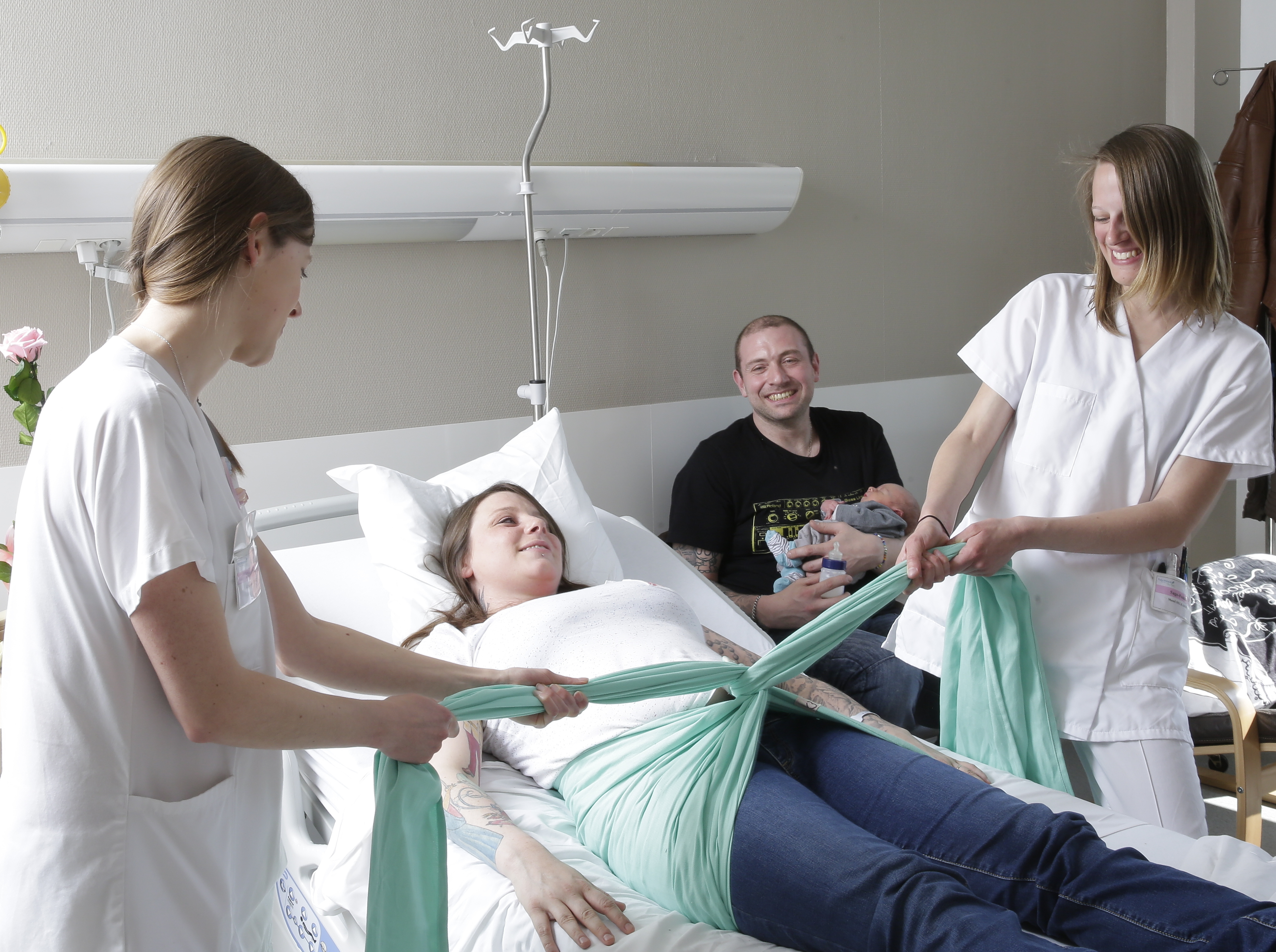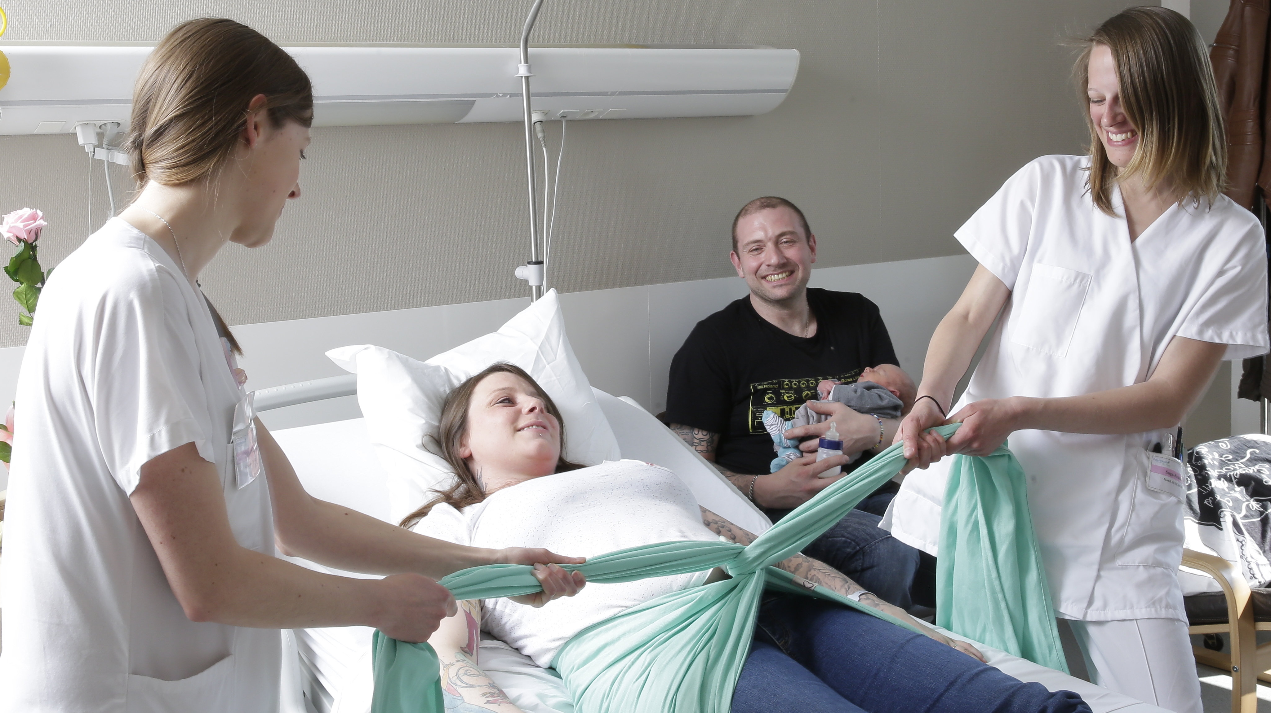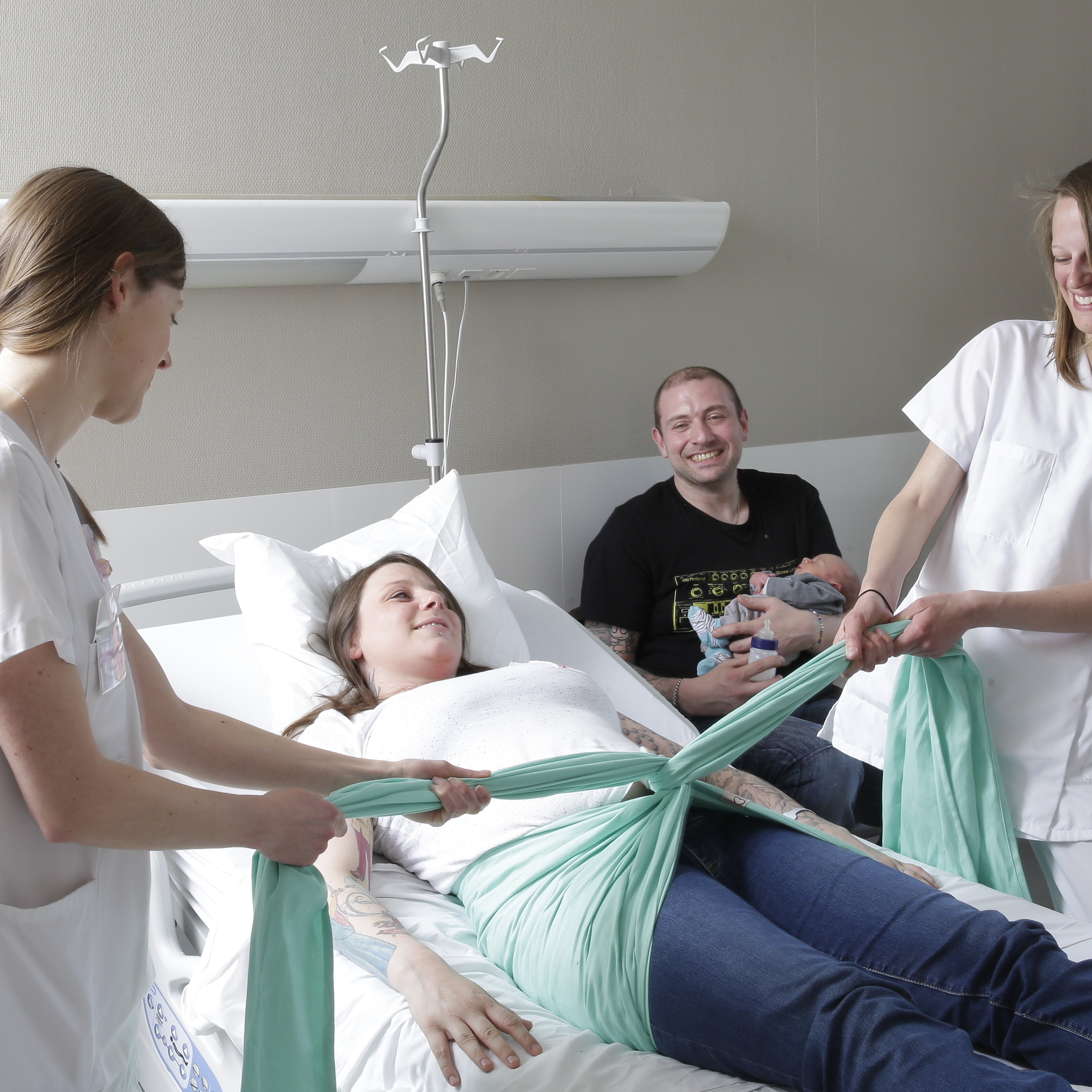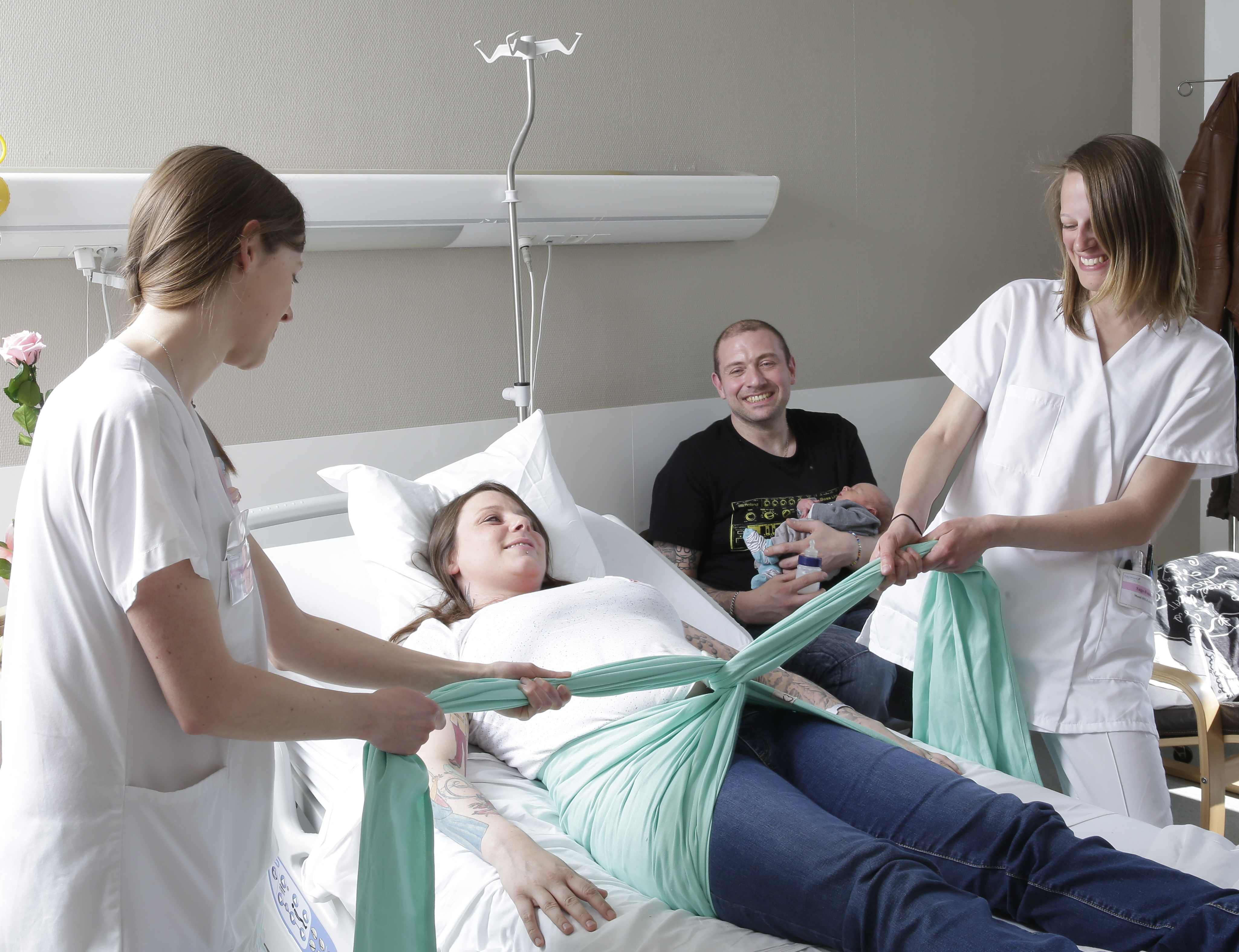 Scène de soins hospitaliers post-partum montrant deux soignantes utilisant un tissu pour un soin auprès d'une jeune mère allongée, tandis qu'un proche tient un nouveau-né dans une chambre d’hôpital.