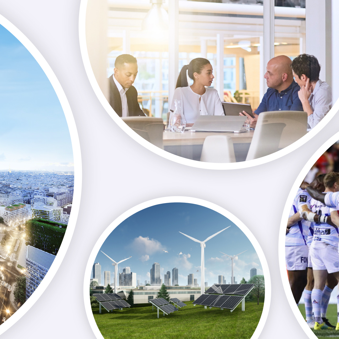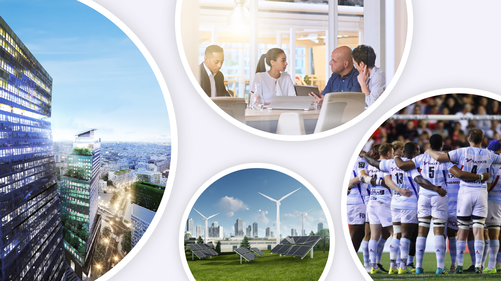 Montage représentant une vue de gratte-ciels, une réunion professionnelle, des énergies renouvelables avec des panneaux solaires et éoliennes, et une équipe de rugby, illustrant les axes stratégiques de Natixis : innovation, finance durable, engagement collectif et développement urbain.
