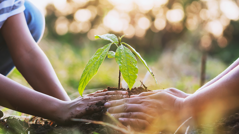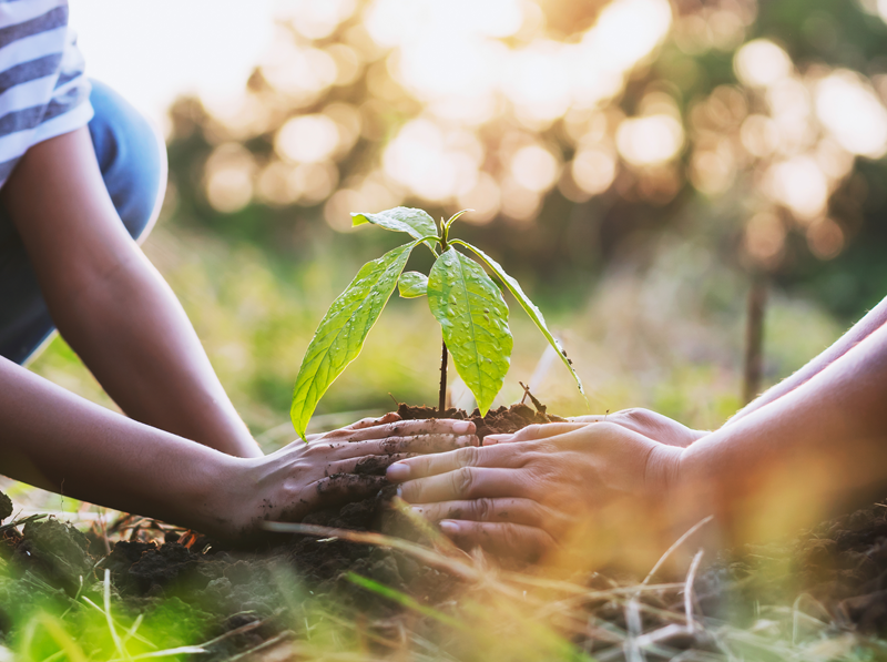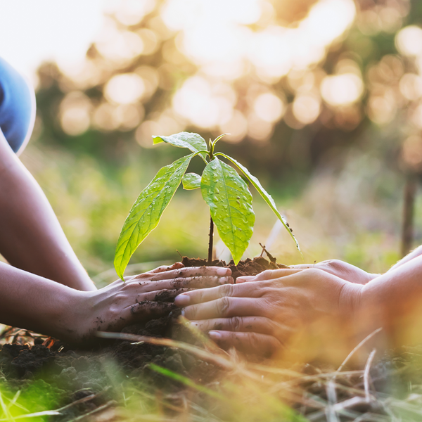 Gros plan sur deux personnes plantant un jeune arbre pour illustrer l'engagement environnemental et la transition écologique.