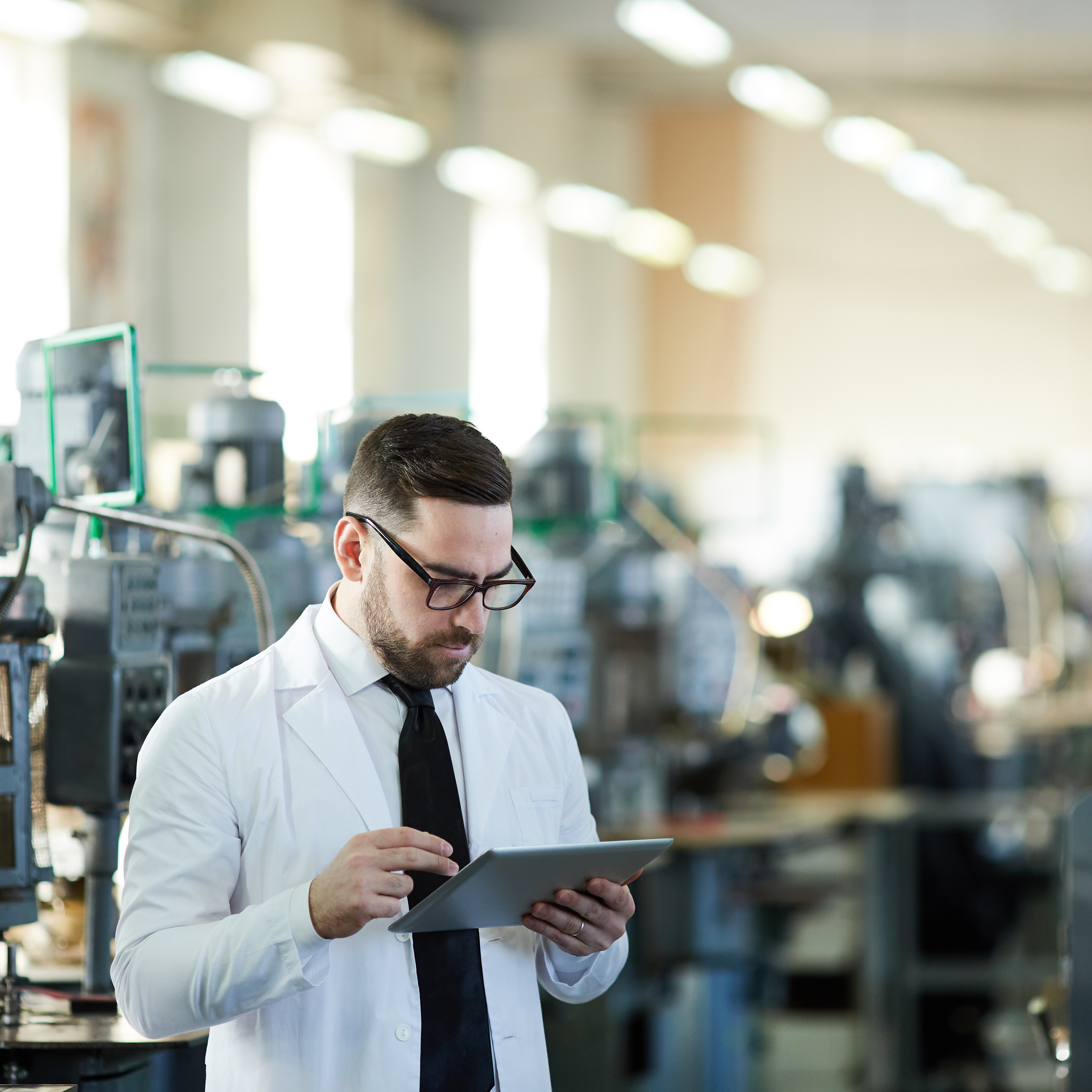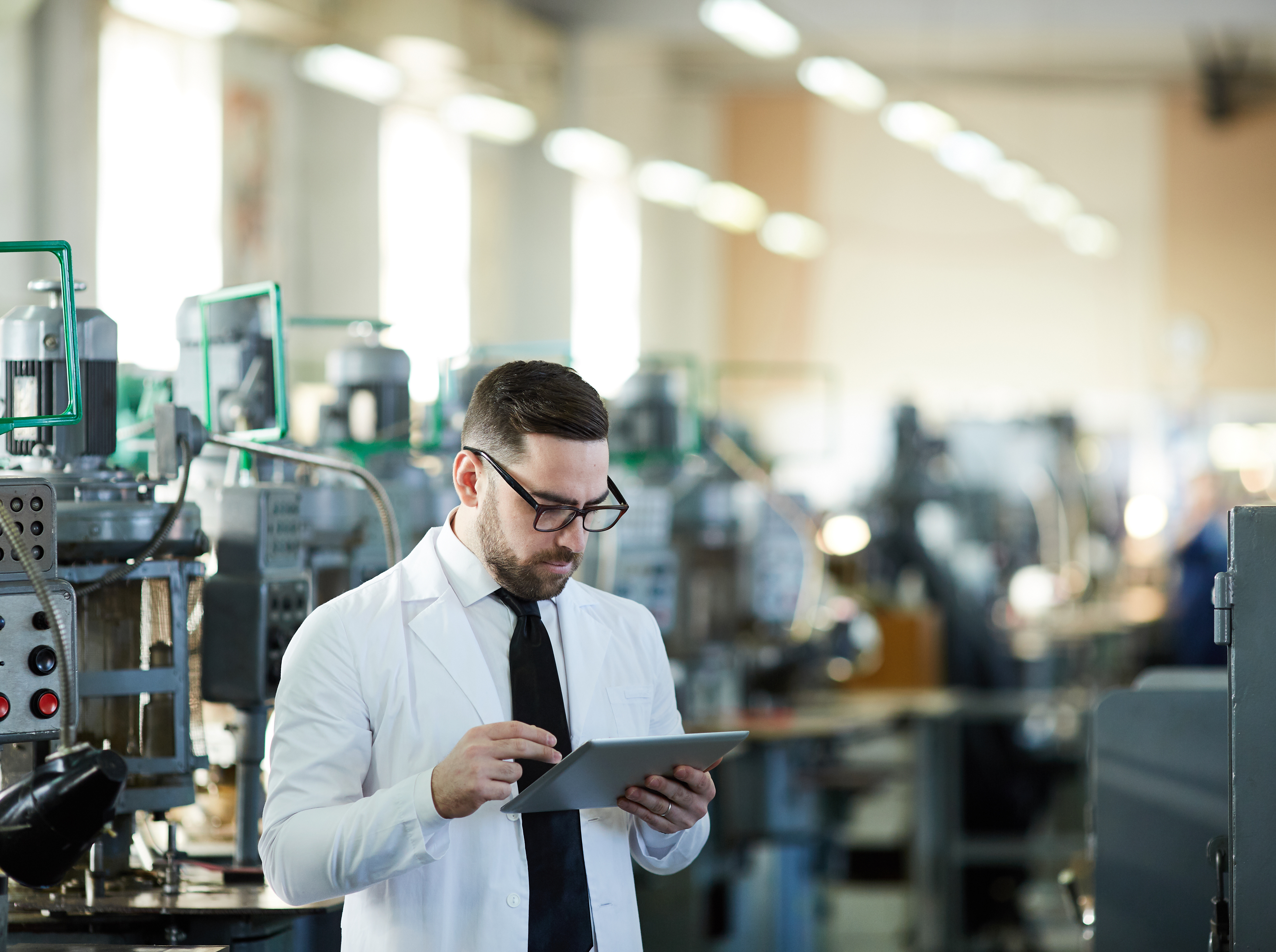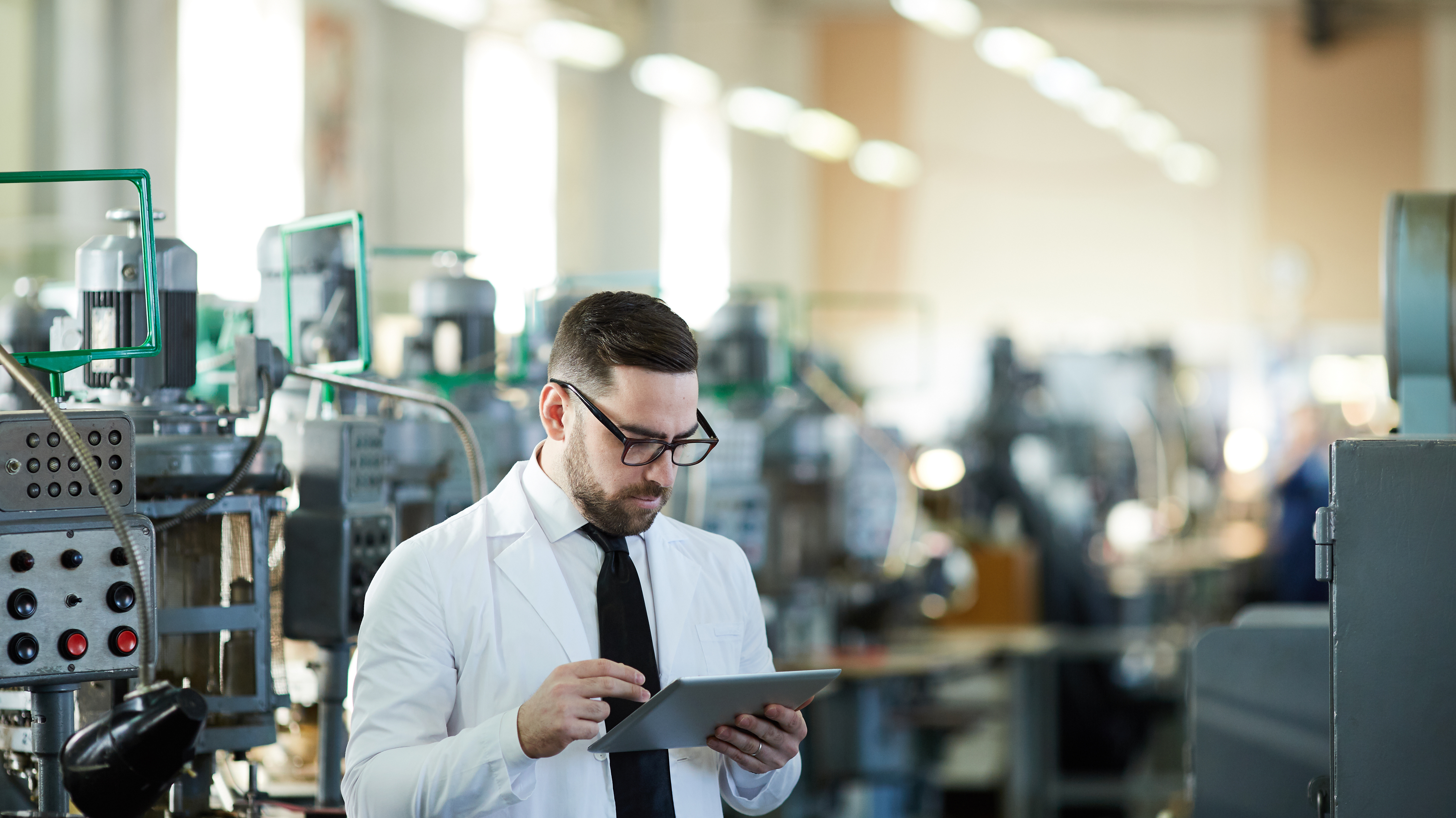 Un ingénieur utilise une tablette numérique pour contrôler ou surveiller des équipements dans une usine moderne, illustrant l'intégration de technologies numériques et l'évolution des métiers industriels vers l'industrie 4.0.