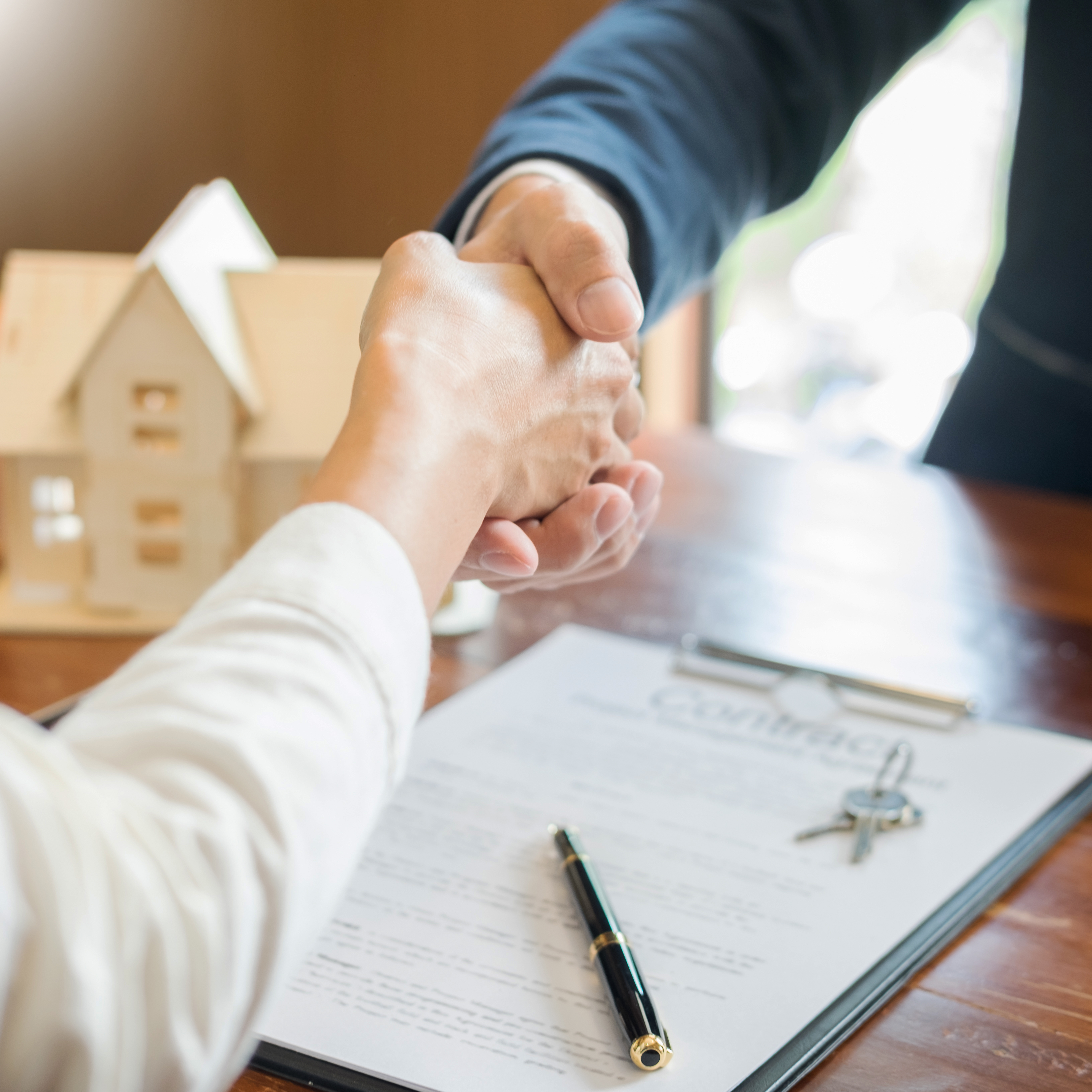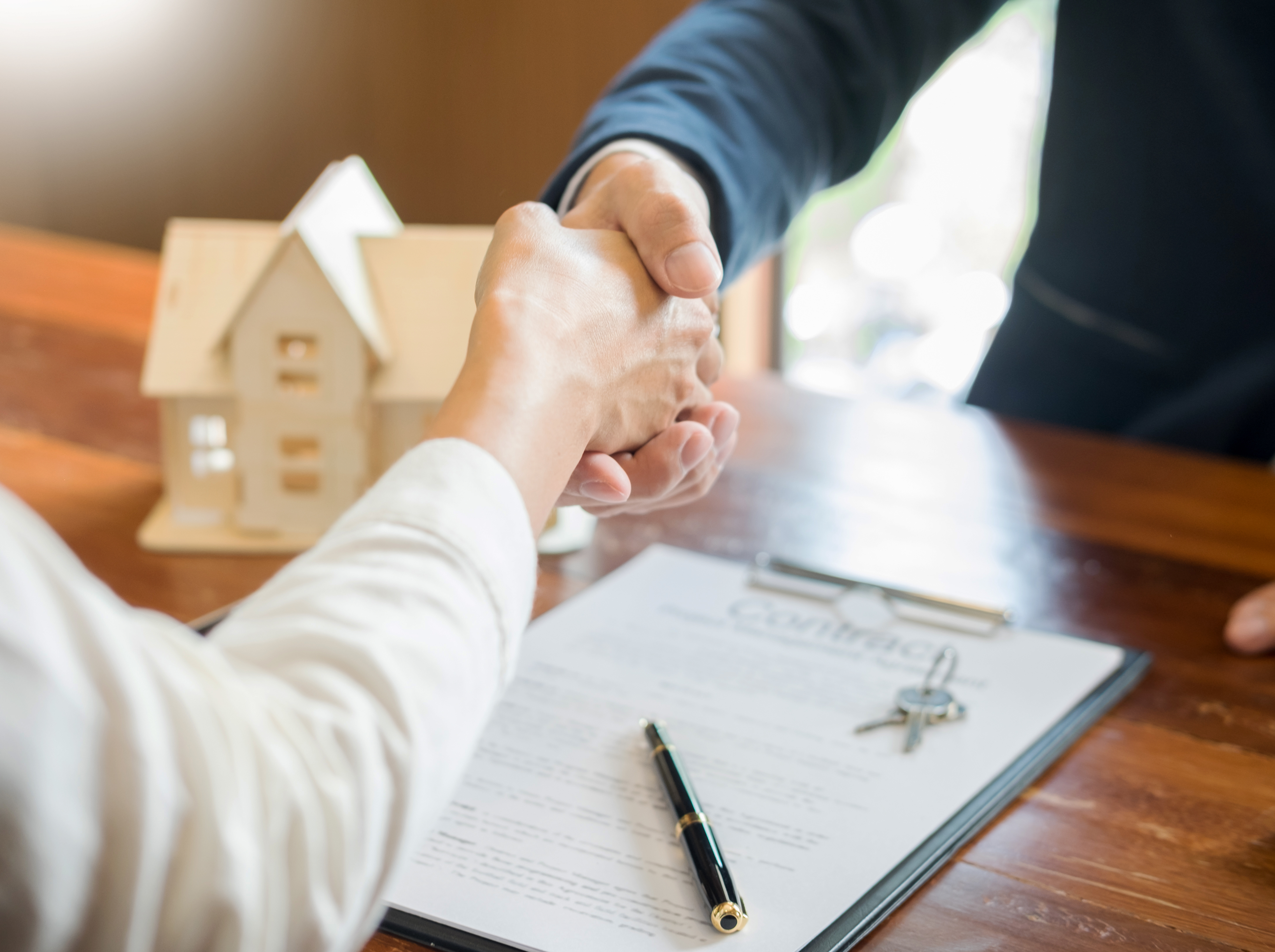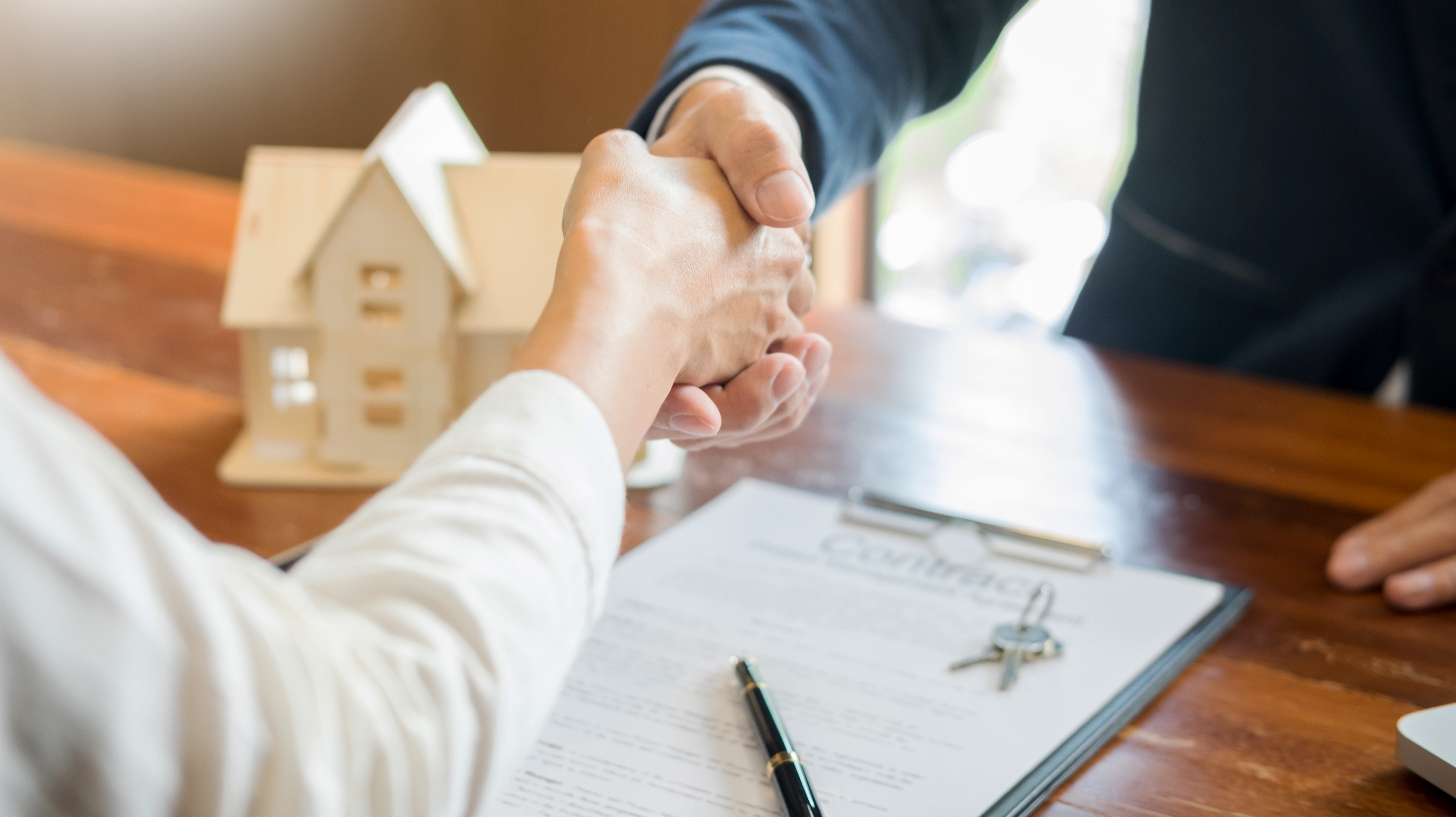 Poignée de main entre deux personnes, avec une maquette de maison, des clés et un contrat sur la table, illustrant une transaction immobilière ou la signature d'une assurance loyers impayés.