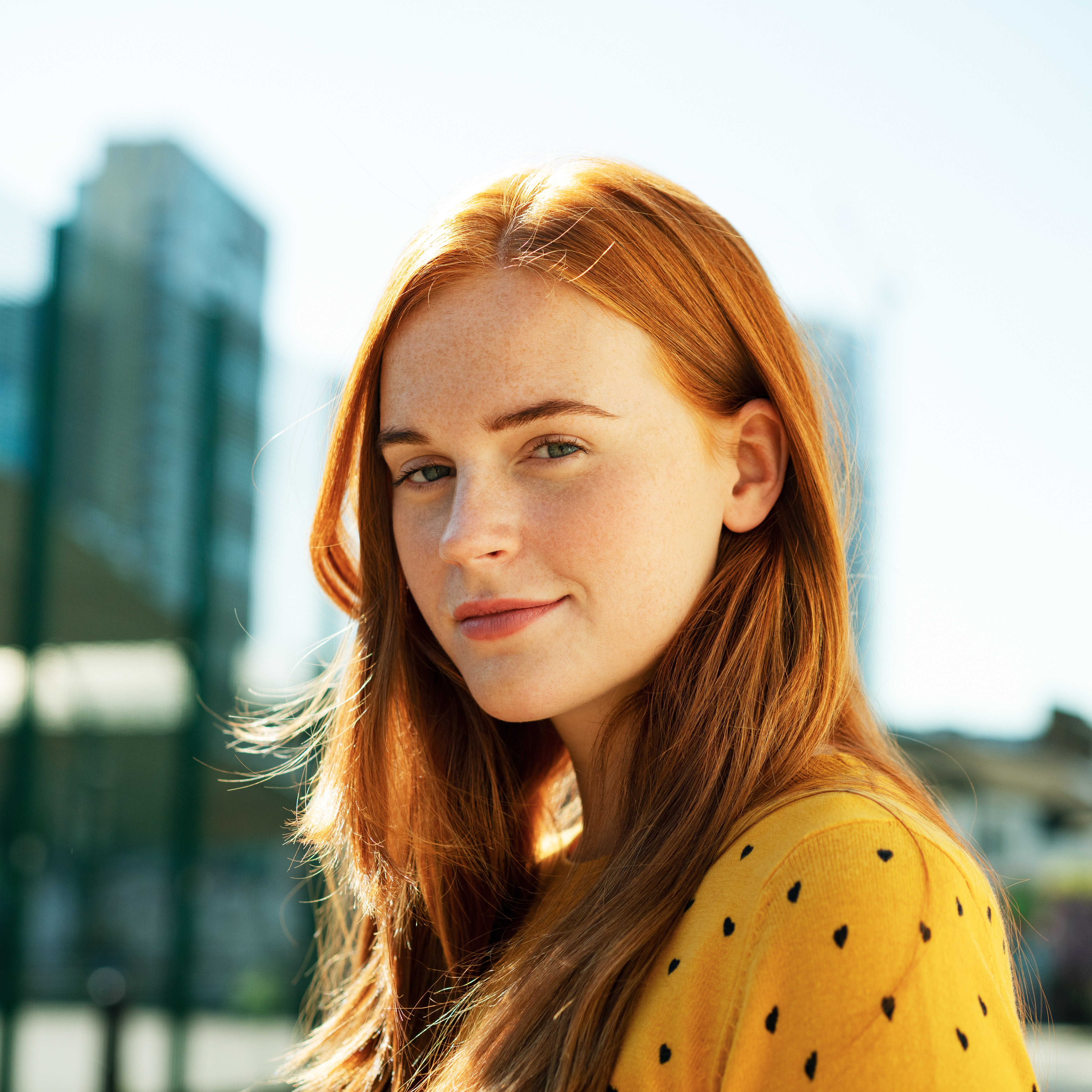 Portrait lumineux d'une jeune femme rousse à l'extérieur, devant un décor urbain flou, idéale pour illustrer des sujets liés à l'entrepreneuriat, la jeunesse active ou l'innovation.