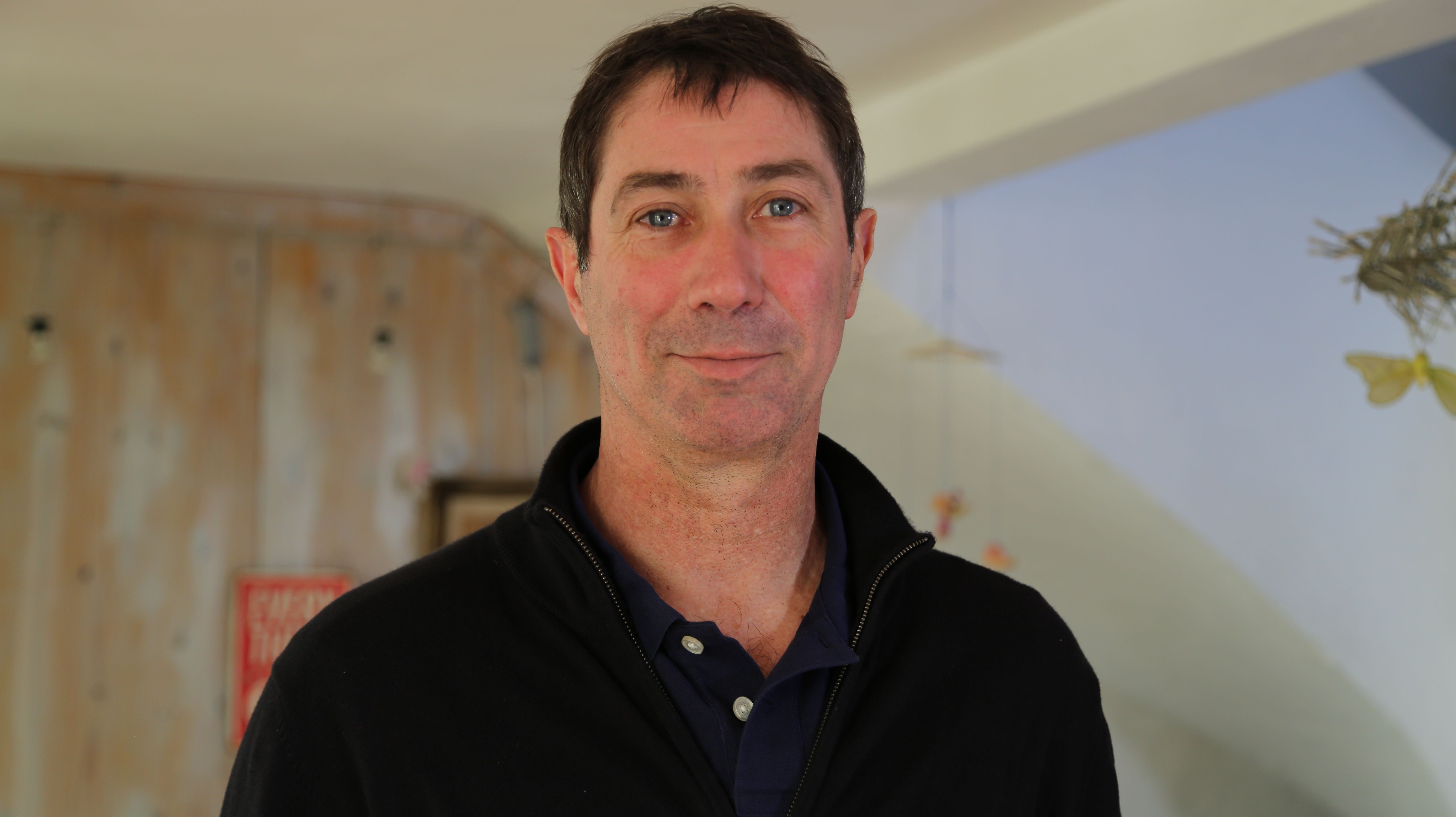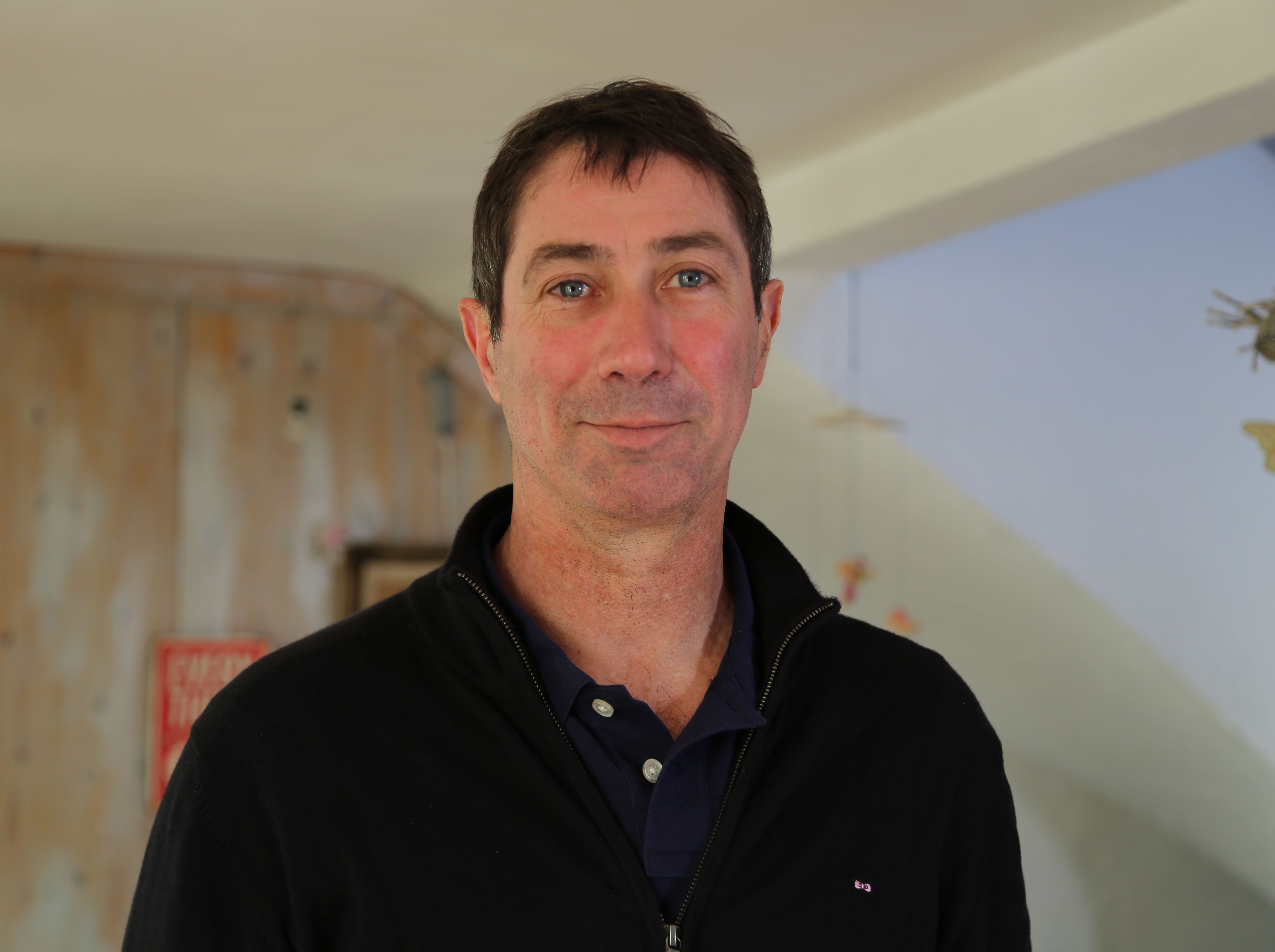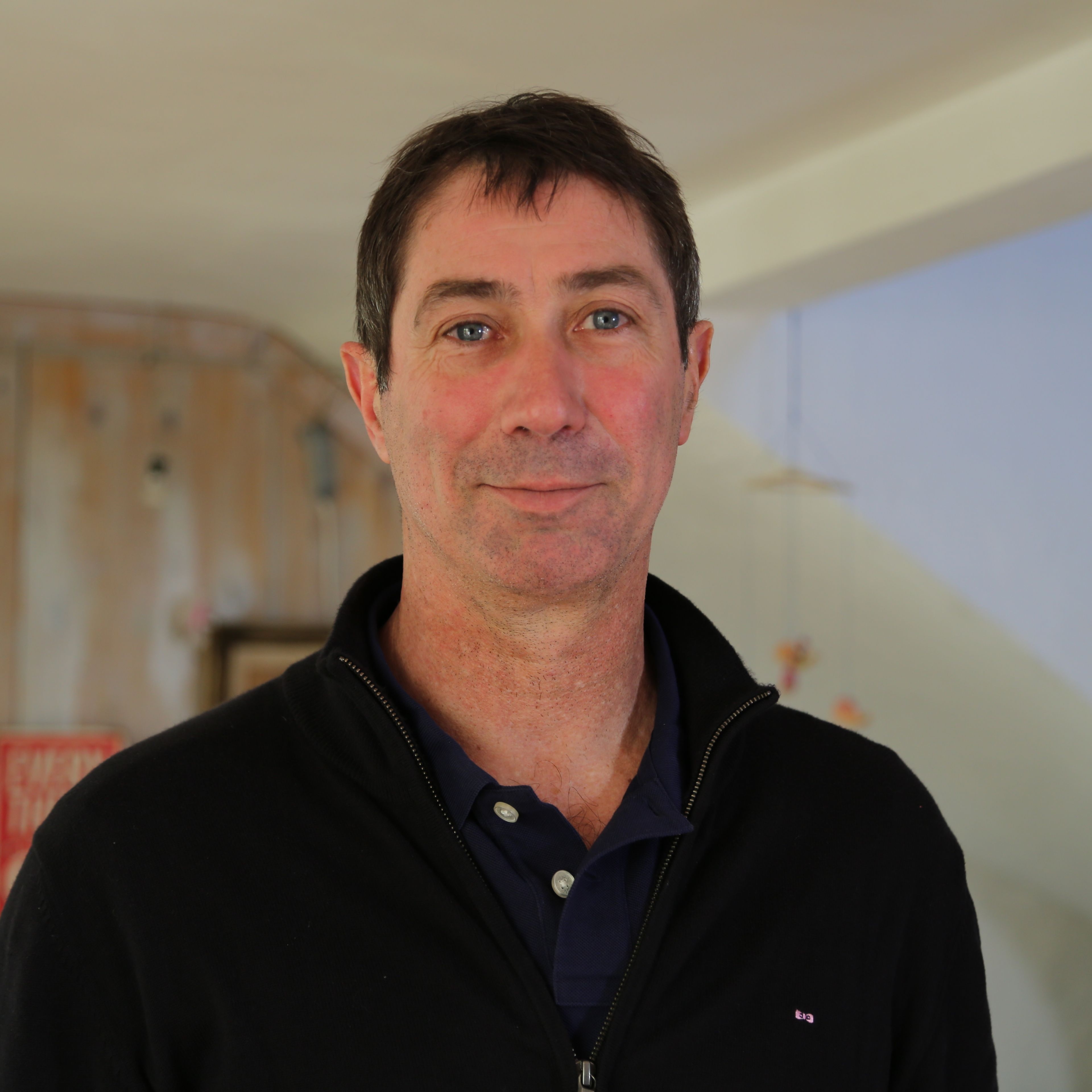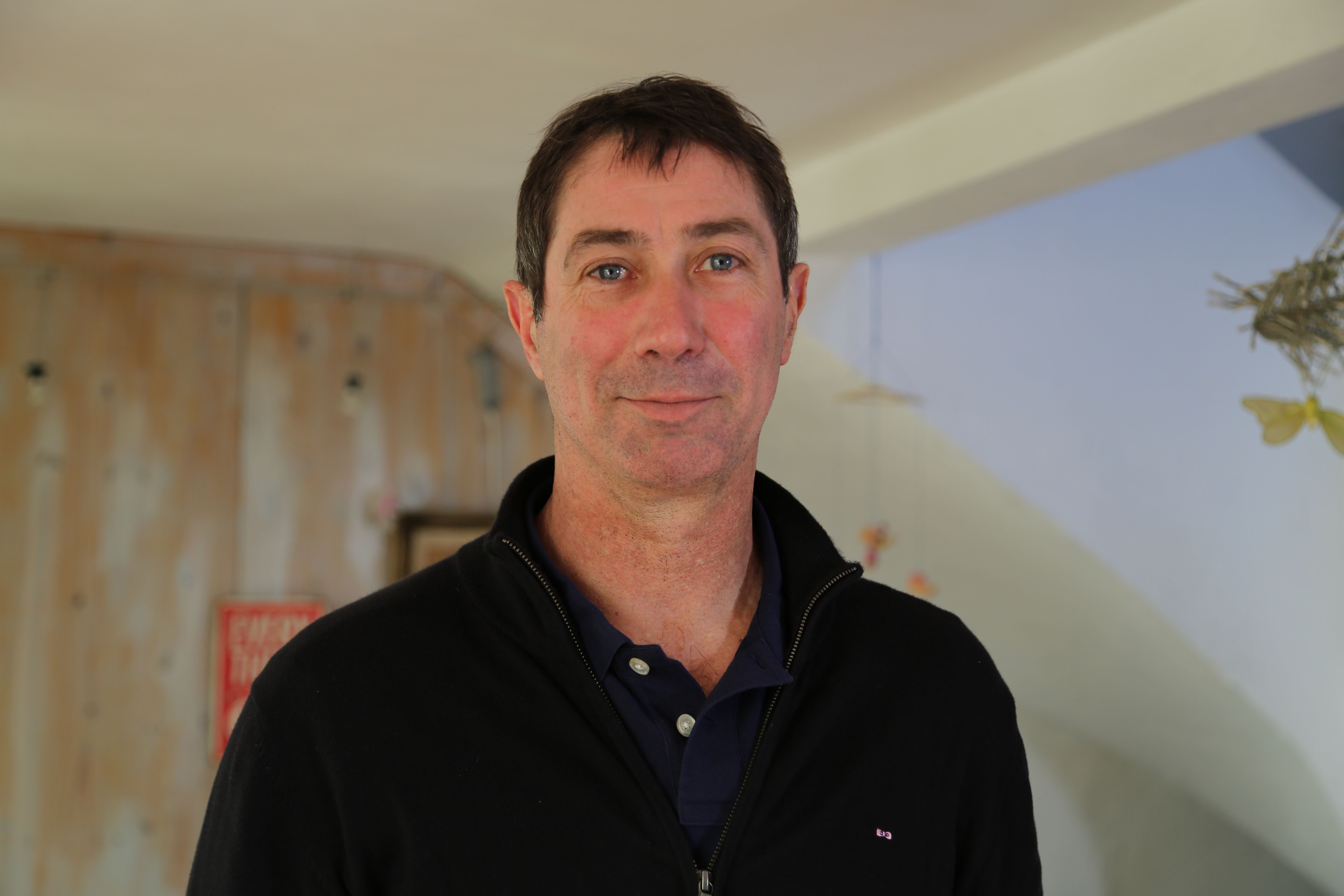 Portrait de Laurent Tillie, entraîneur de l’équipe de France de volley-ball, dans un cadre intérieur lumineux.