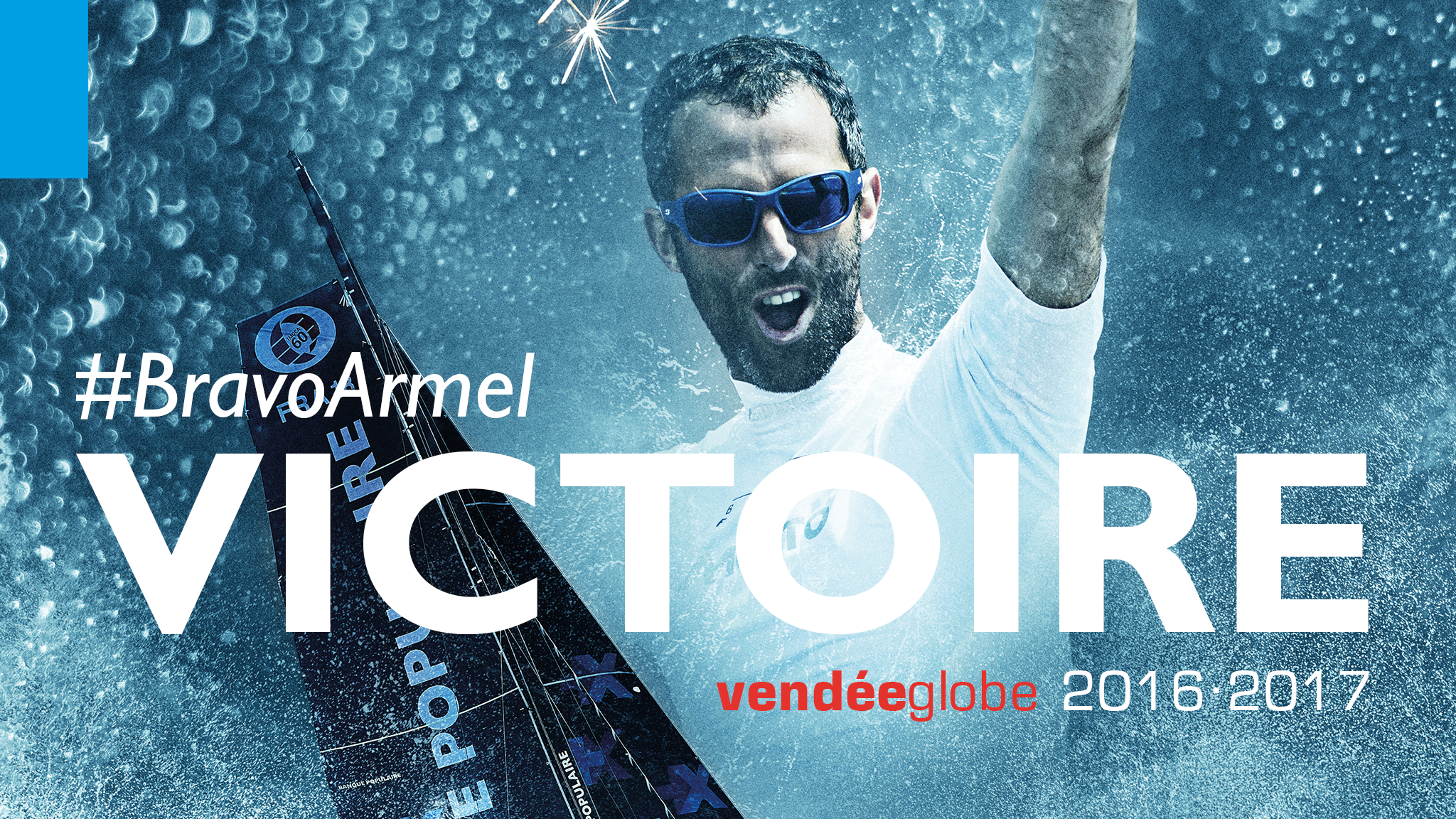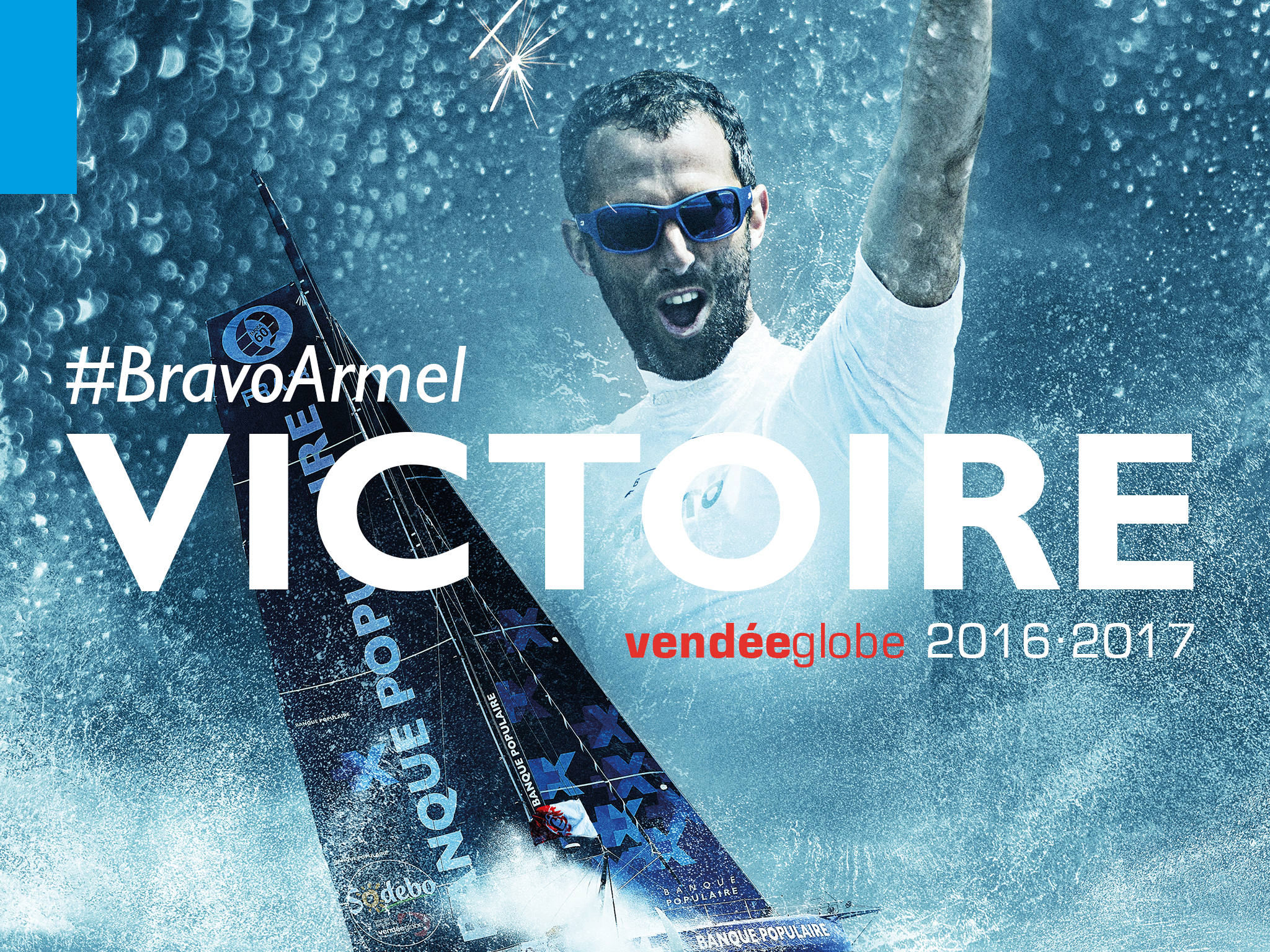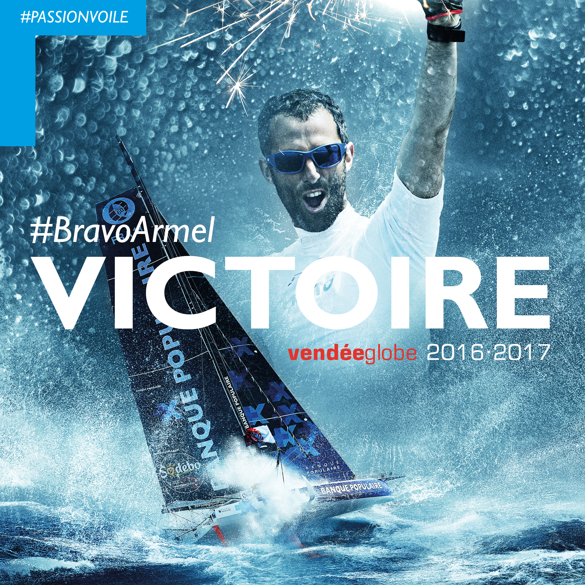 Affiche célébrant la victoire d’Armel Le Cléac’h sur Banque Populaire lors du Vendée Globe 2016-2017, avec un visuel du skipper et du voilier en mer.