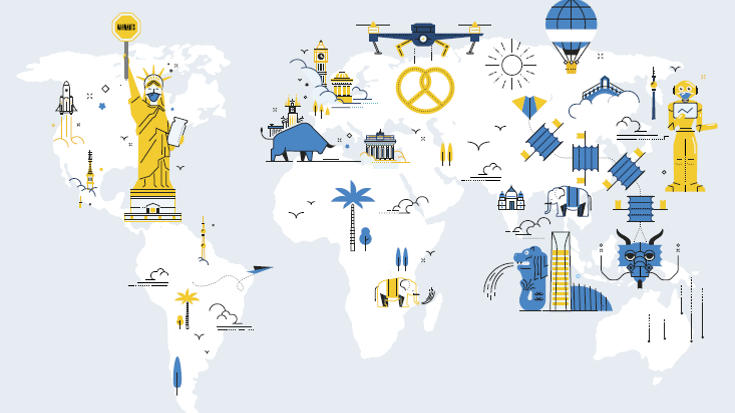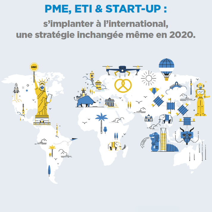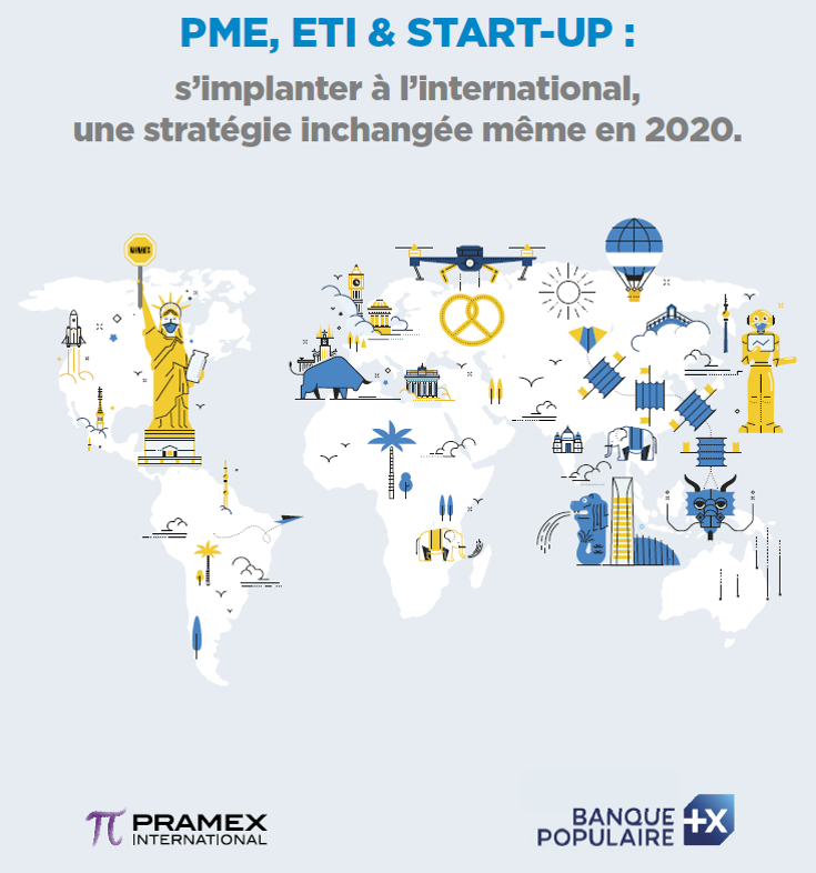 Carte illustrée des principales destinations internationales d’implantation des PME, ETI et start-up françaises, extraite du baromètre 2021 Banque Populaire - Pramex, mettant en avant la stabilité de la stratégie d’internationalisation en 2020 malgré la pandémie.