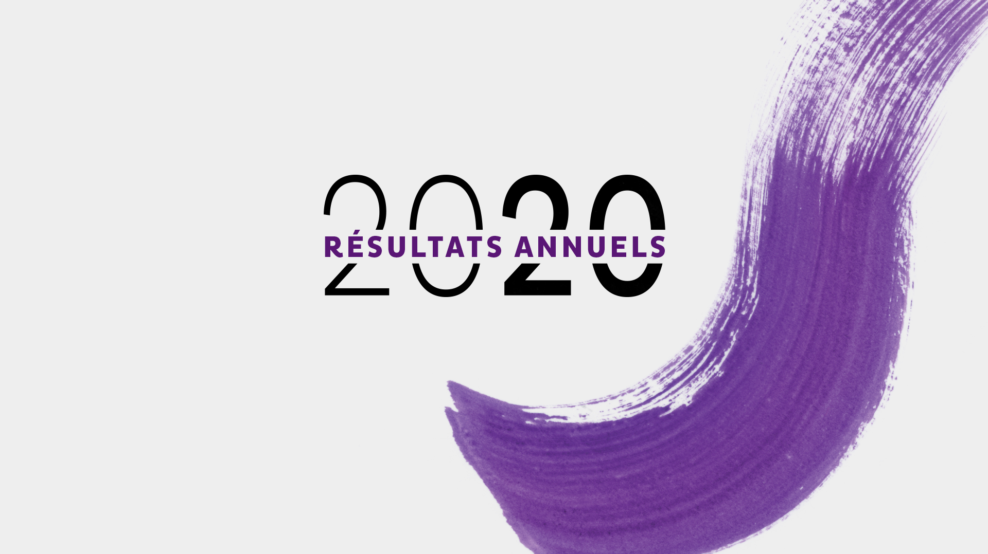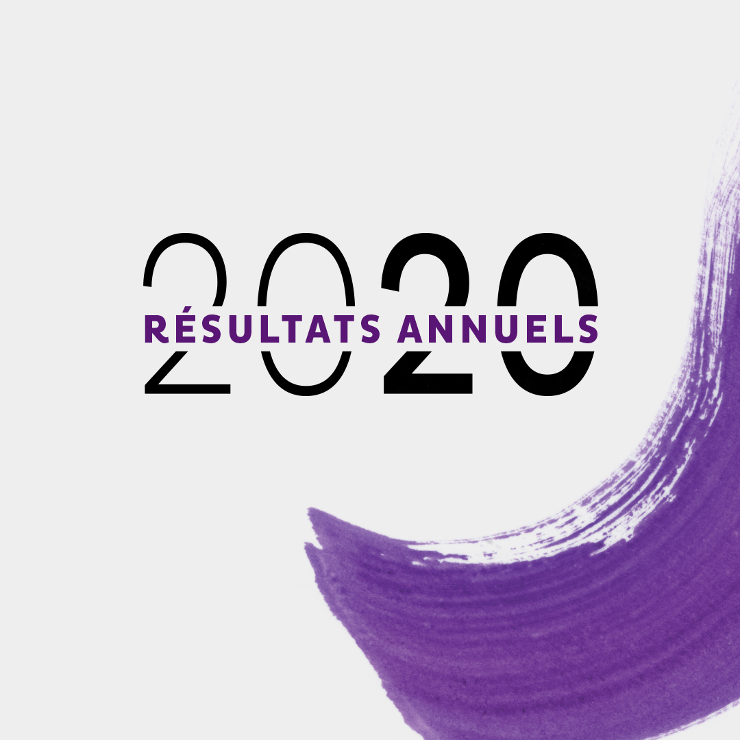 Visuel avec l’inscription 'Résultats annuels 2020' en noir et violet sur fond clair, accompagné d’un large coup de pinceau violet en bas à droite.