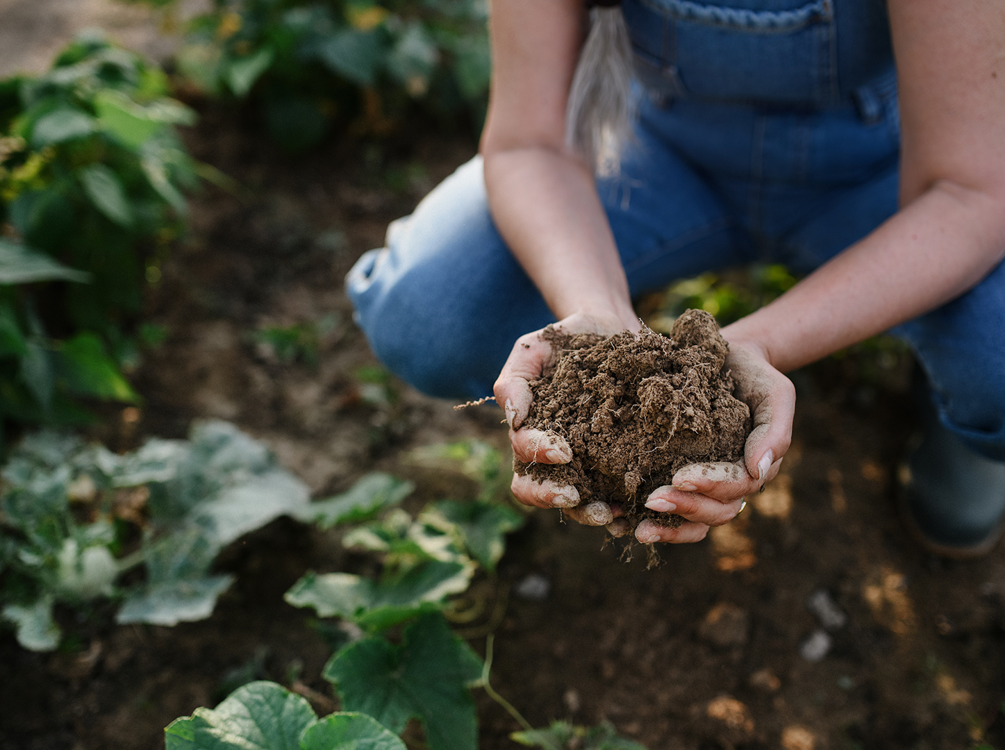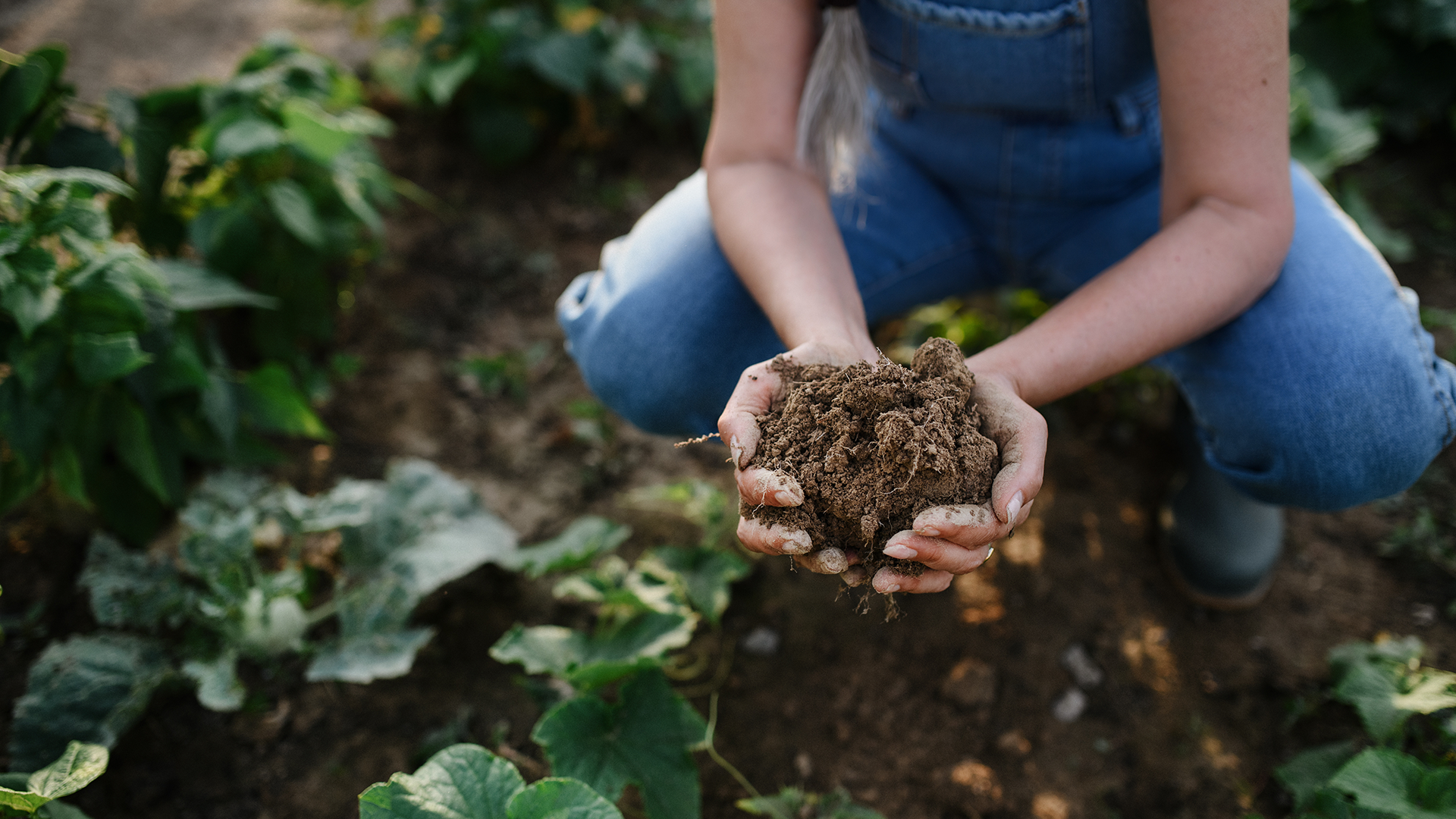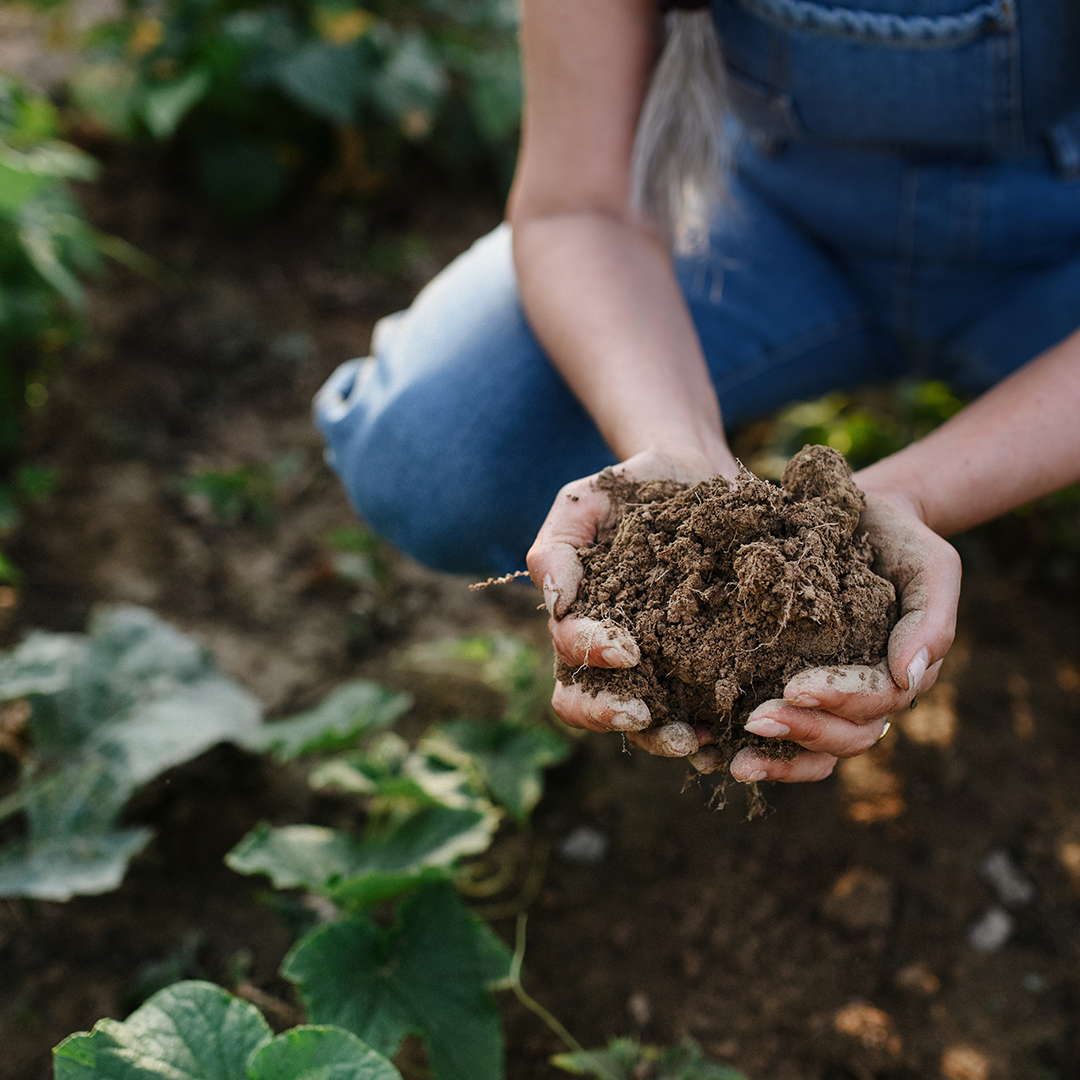 Une personne tient de la terre entre ses mains dans un potager, illustrant l'importance de la qualité des sols pour l’agriculture et la durabilité environnementale.