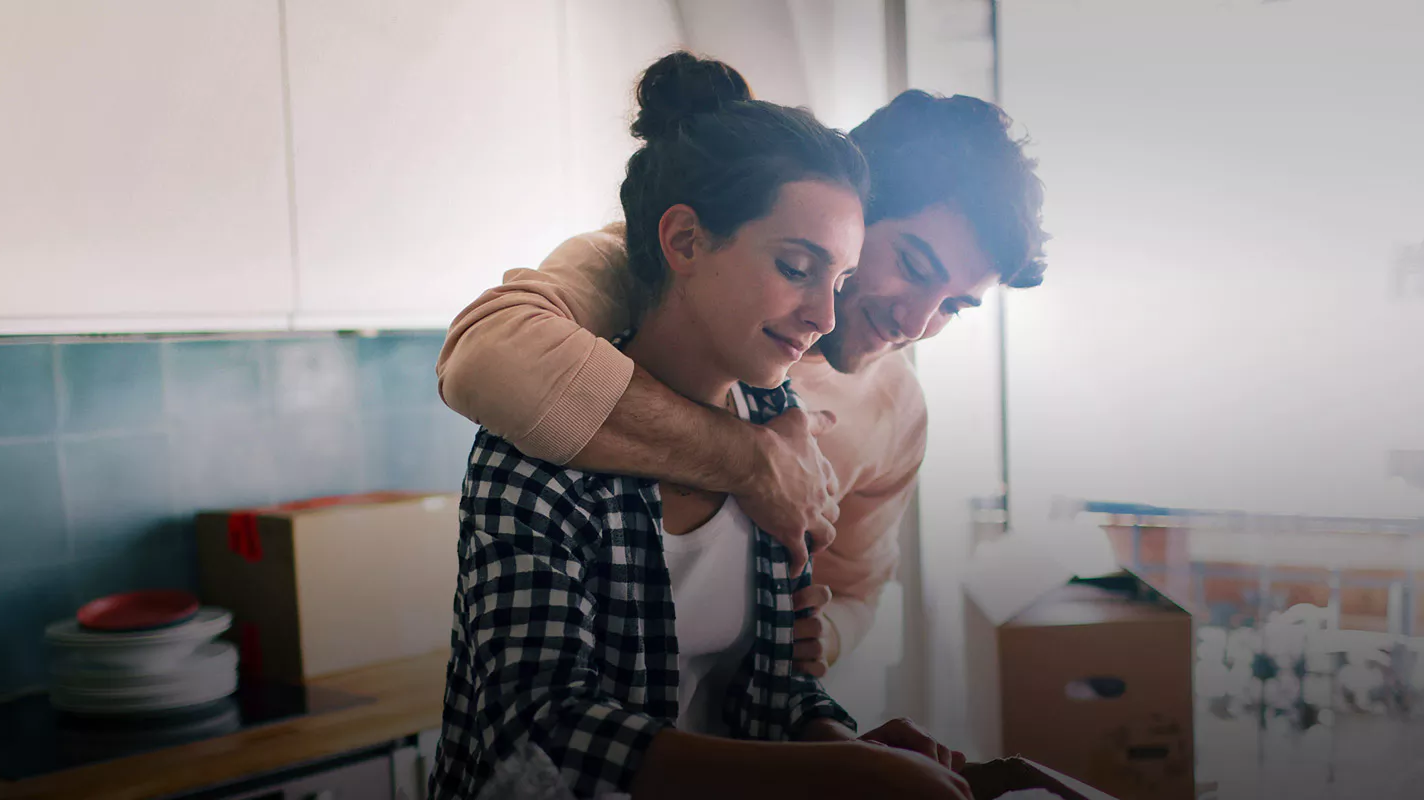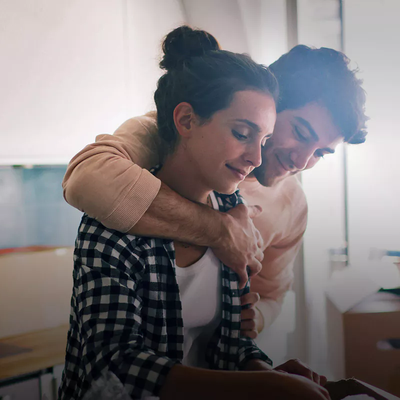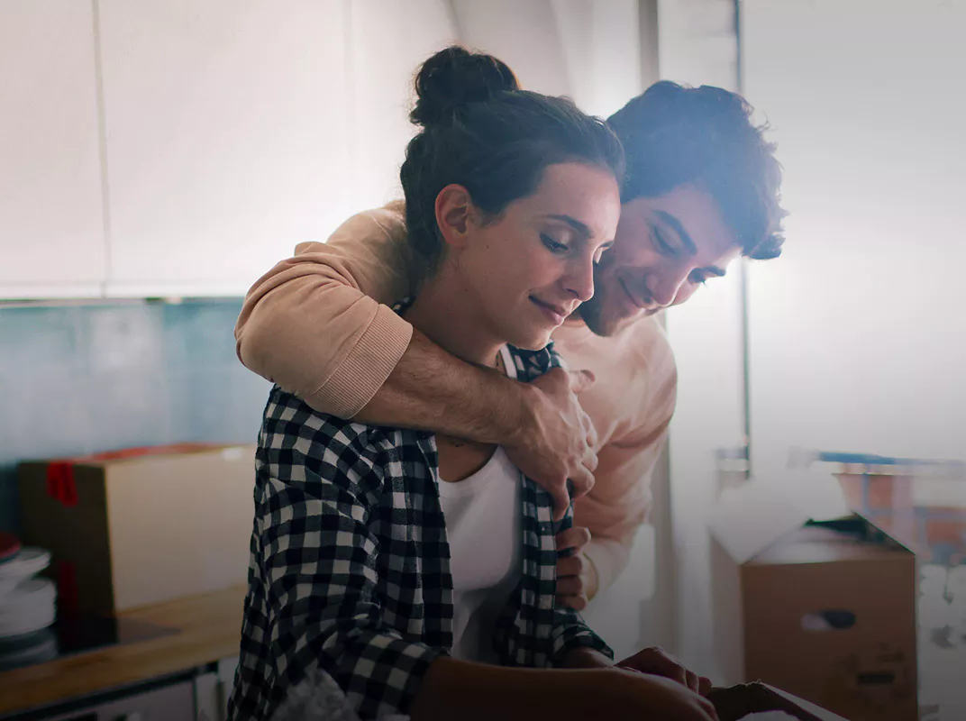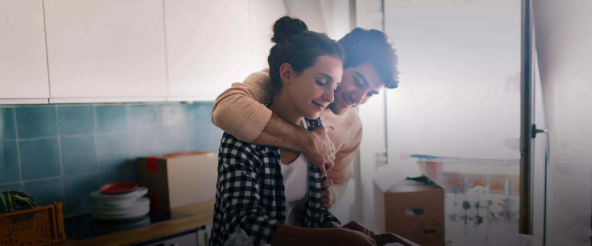 Un couple s'enlace tendrement dans une cuisine moderne, mettant en avant un moment de complicité et un quotidien serein à la maison.