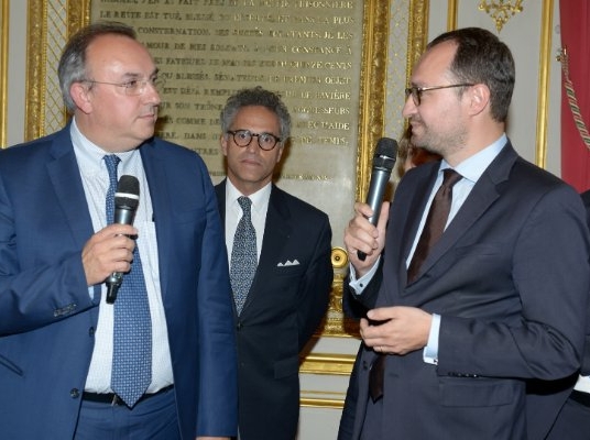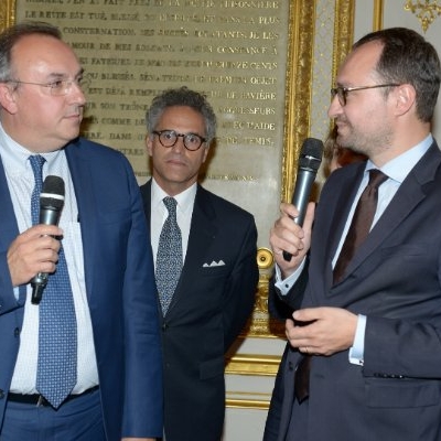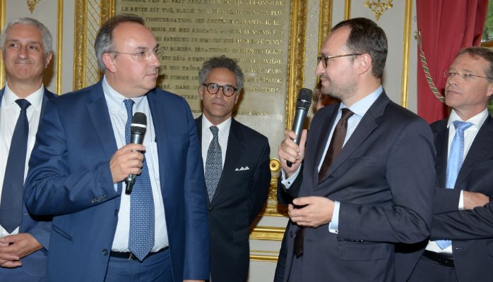 Discussion entre plusieurs dirigeants lors d'une réunion d'affaires ou d'une cérémonie officielle pour le Prix Etienne Marcel 2016.