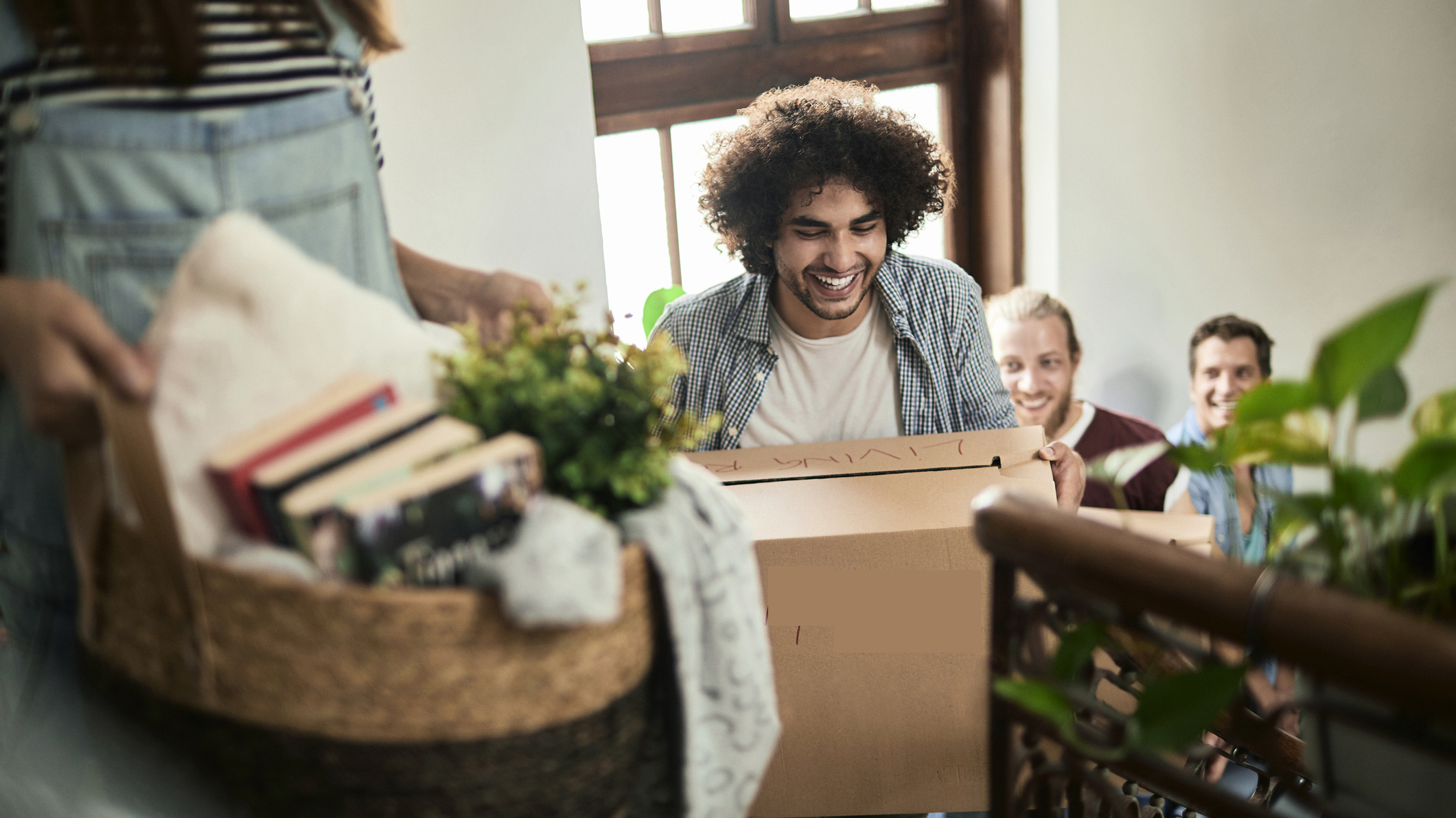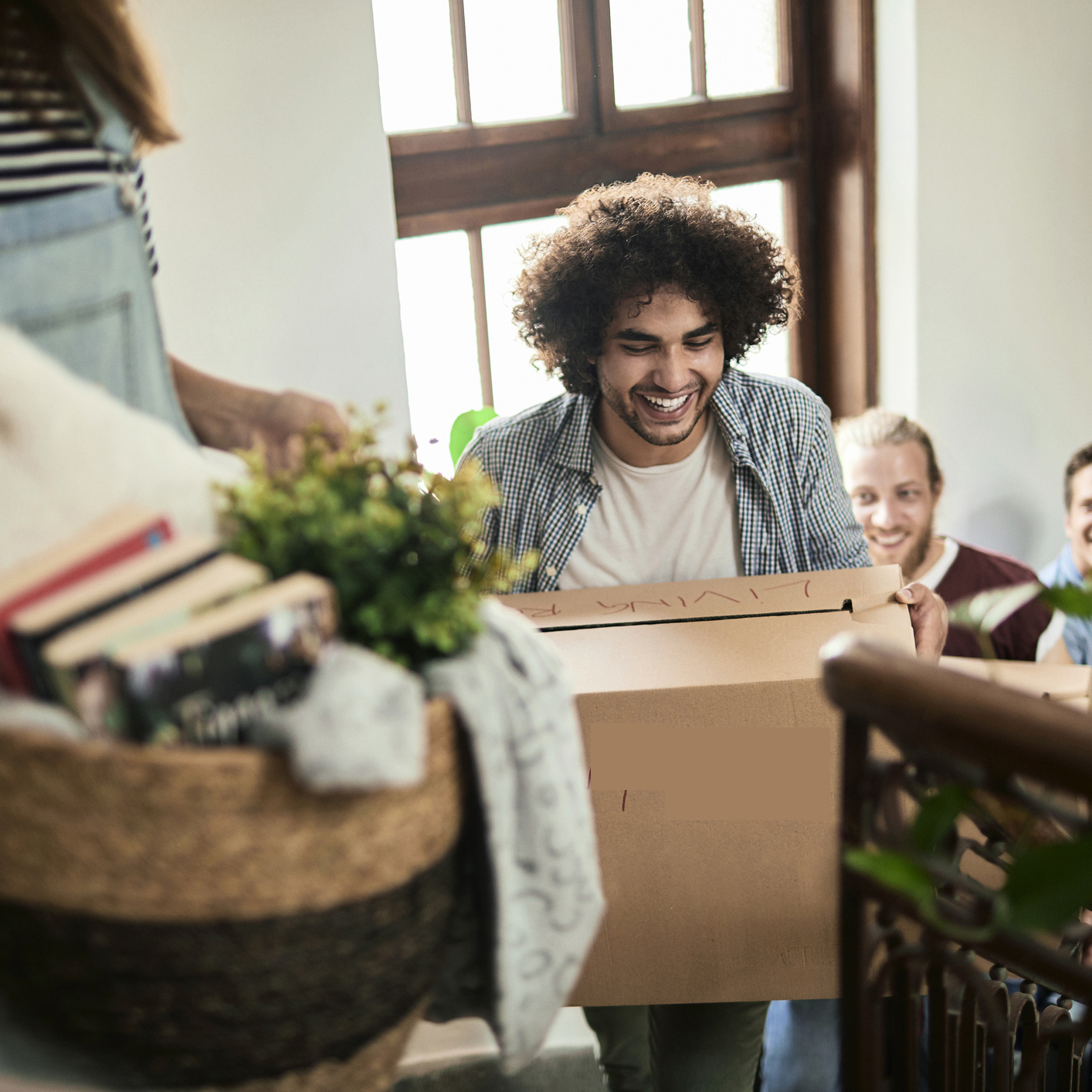 Groupe de jeunes adultes portant des cartons de déménagement dans une cage d'escalier lumineuse, symbolisant l'accession à la propriété et la mobilité résidentielle.