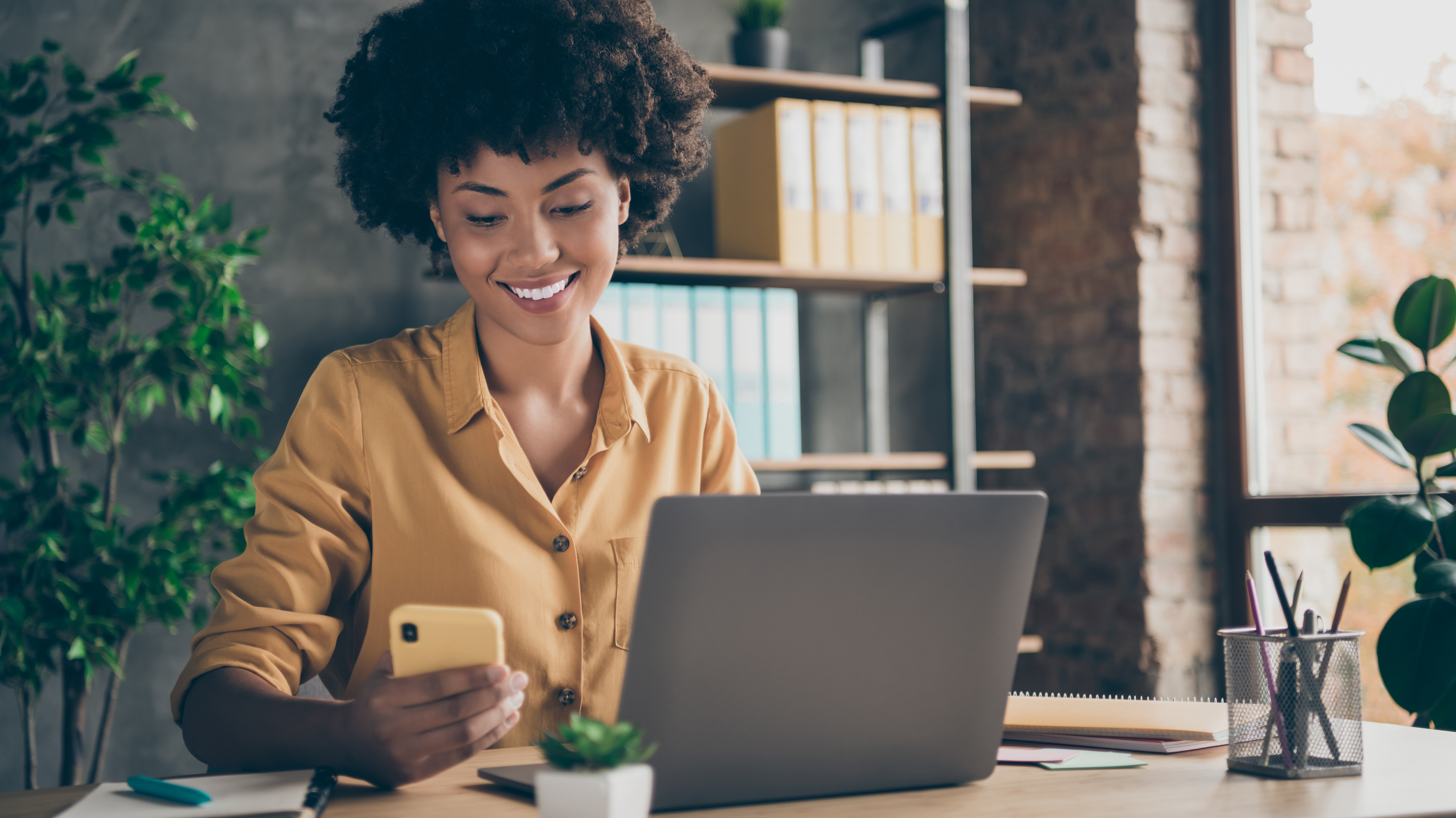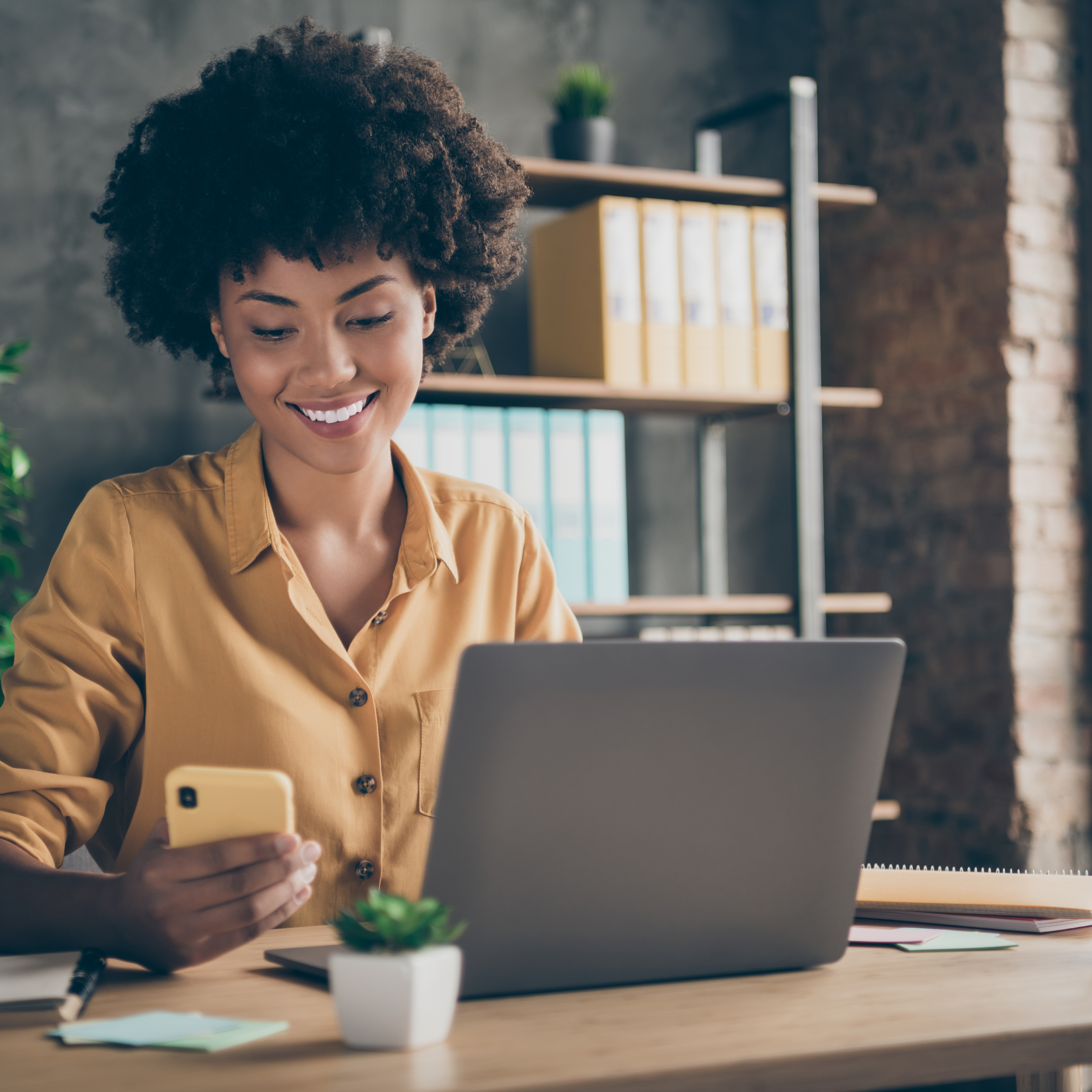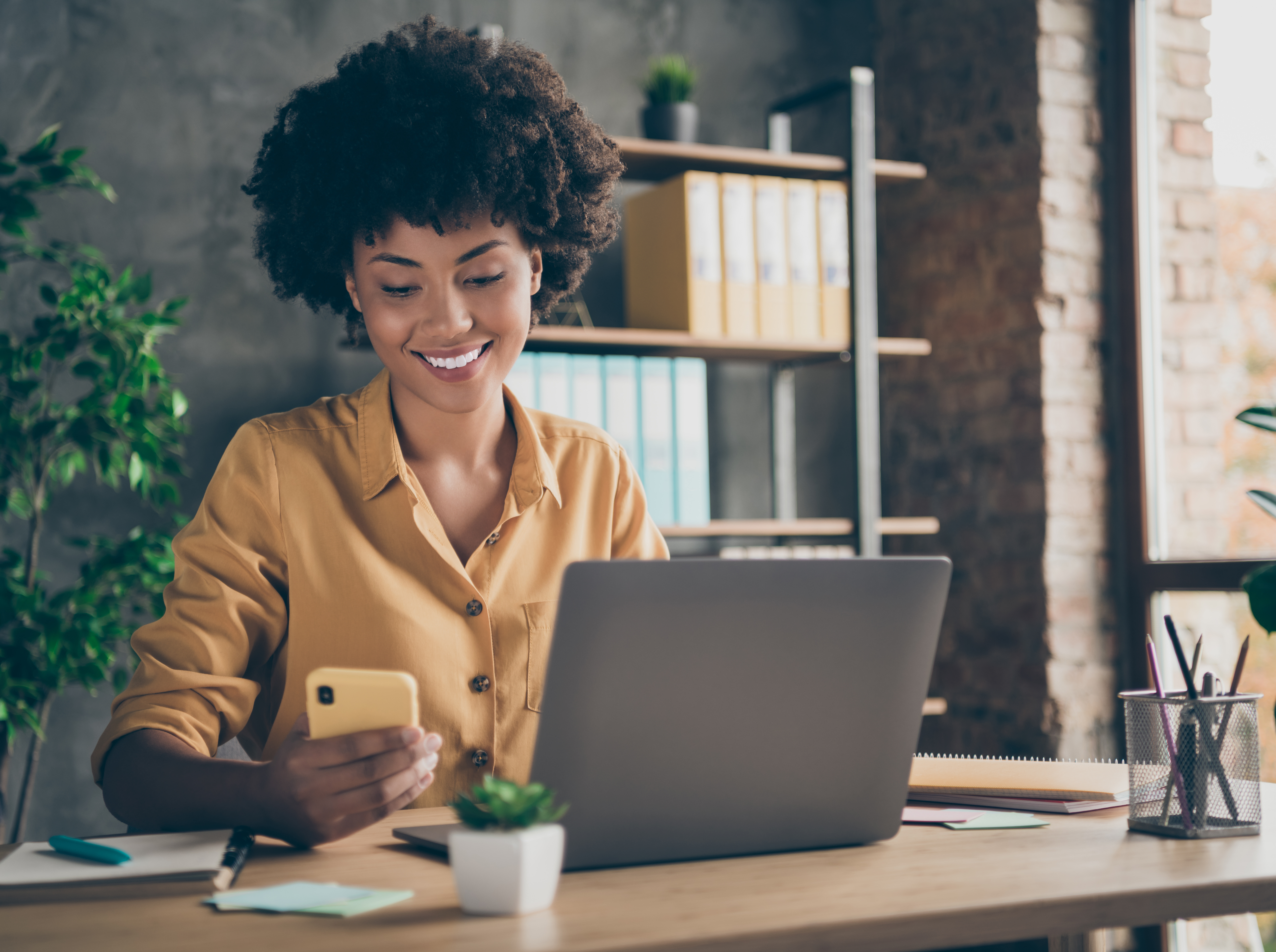 Femme professionnelle souriante travaillant sur ordinateur portable et consultant son smartphone dans un bureau moderne, entourée de plantes et de fournitures de bureau.
