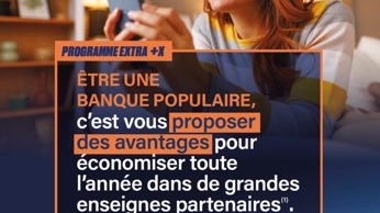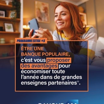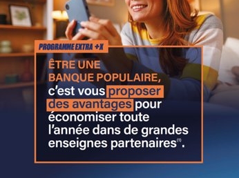 Affiche présentant le programme de fidélité EXTRA +X de Banque Populaire, avec une cliente utilisant son mobile pour profiter d’avantages chez des enseignes partenaires. Sur l'affiche est inscrit "Etre une Banque Populaire, c'est vous proposer des avantages pour économiser toute l'année dans de grandes enseignes partenaires".