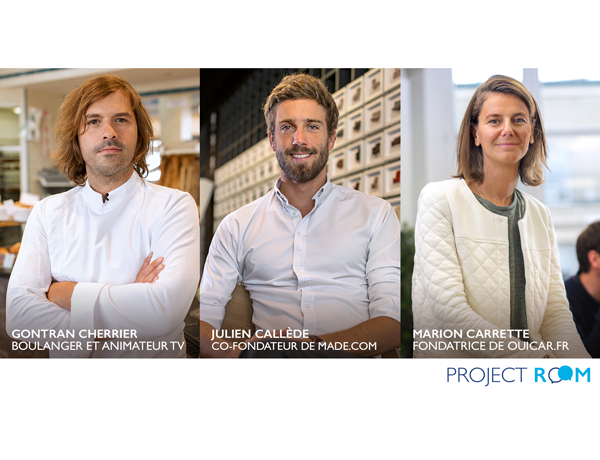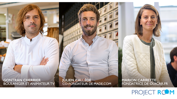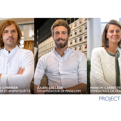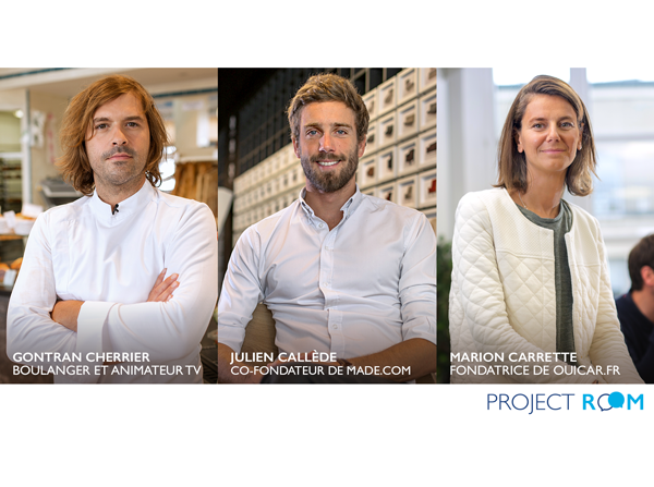 Portraits de Gontran Cherrier, Julien Callède et Marion Carrette, mentors de la Project Room Banque Populaire, initiative dédiée à l'entrepreneuriat et au partage d'expérience entre entrepreneurs et porteurs de projets.