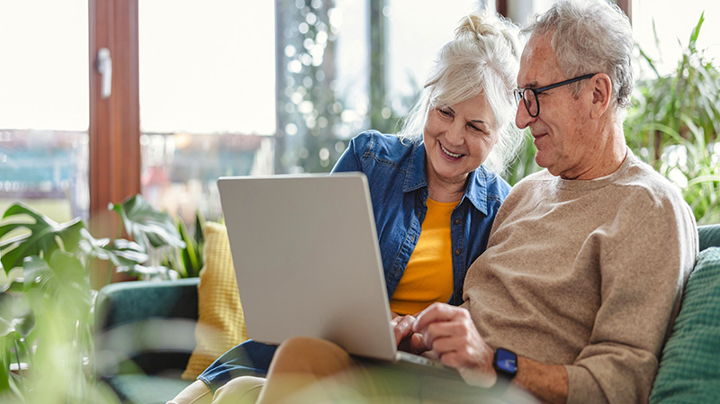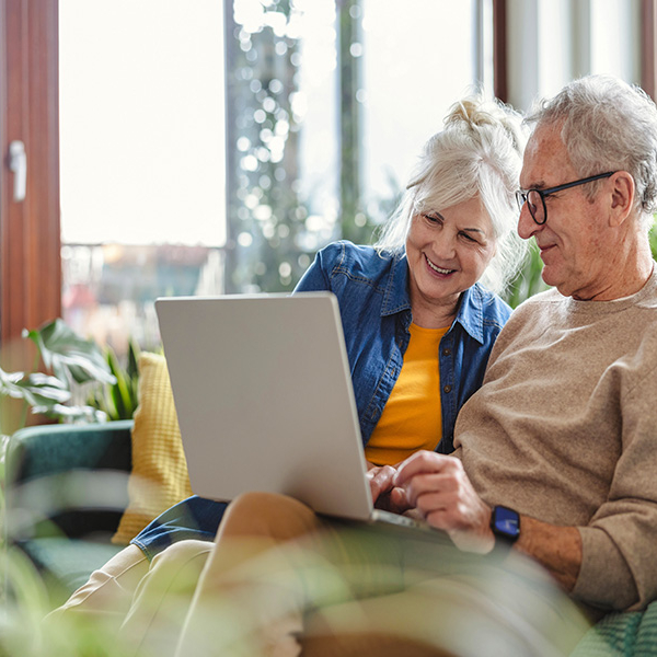 Couple de seniors souriant assis sur un canapé à la maison et consultant un ordinateur portable ensemble, entouré de plantes.