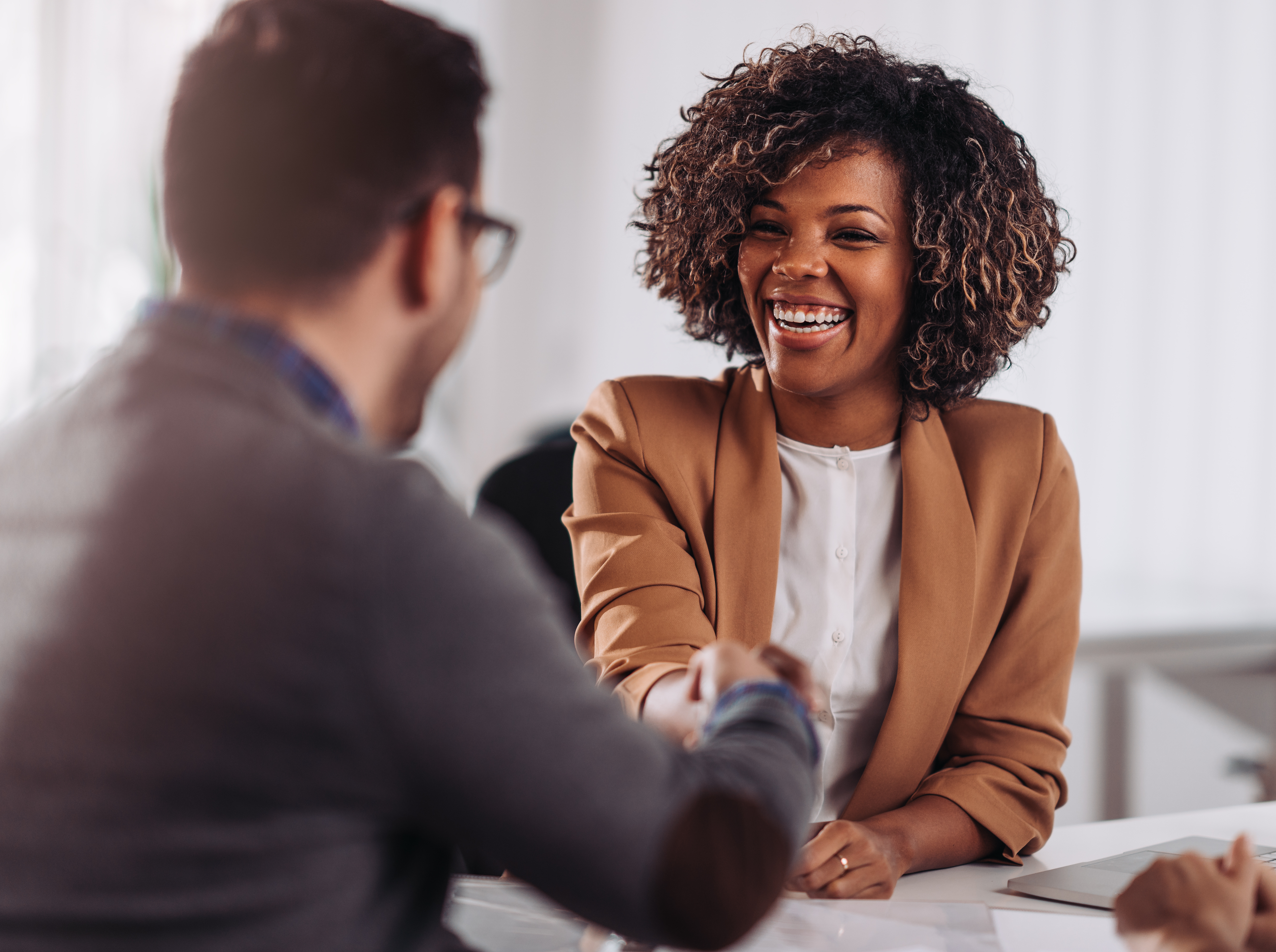 Deux professionnels échangent une poignée de main dans un bureau lumineux, illustrant un entretien d'embauche réussi.