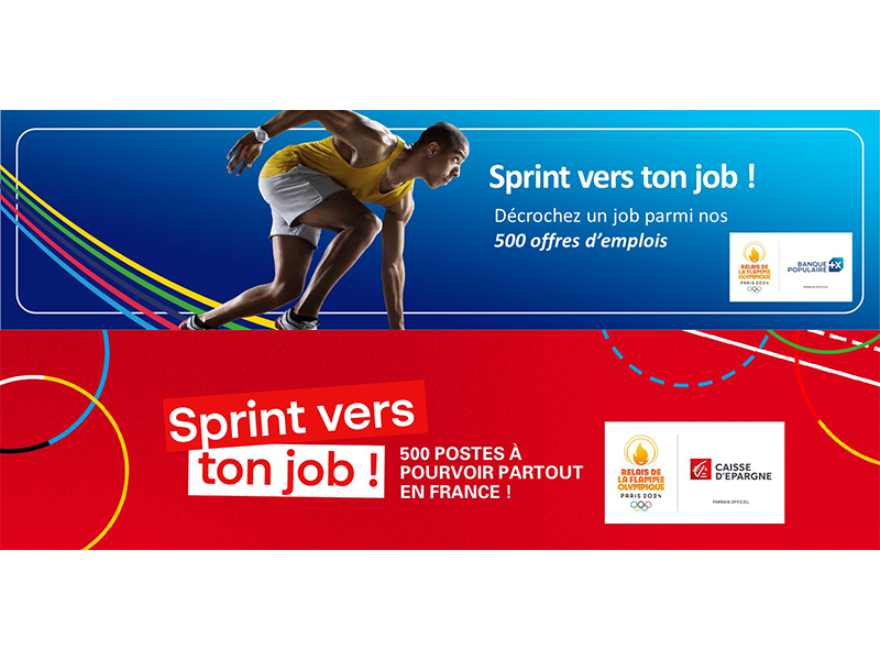 Visuel promotionnel pour l'opération de recrutement 'Sprint vers ton job !' des Banques Populaires et Caisses d'Épargne, proposant 500 postes à pourvoir en France en lien avec le Relais de la Flamme Olympique Paris 2024.