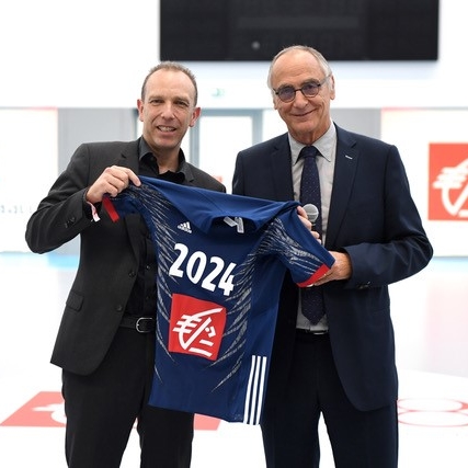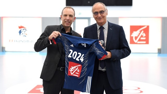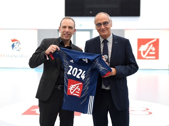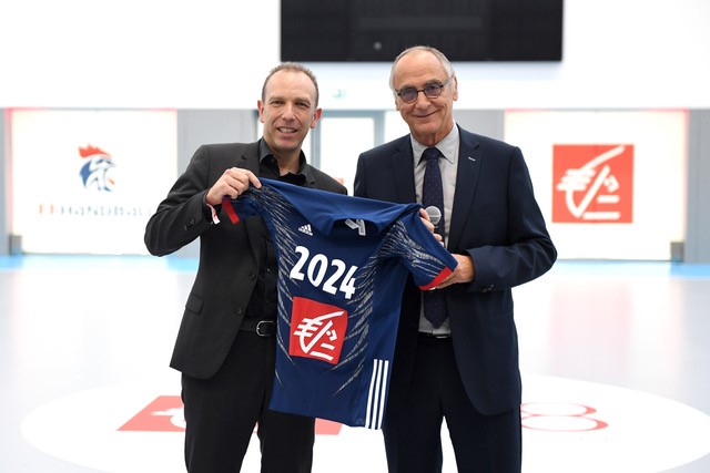 Laurent Roubin et Joël Delplanque présentent le maillot officiel célébrant le renouvellement du partenariat entre la Caisse d’Epargne et la Fédération française de handball jusqu’aux Jeux Olympiques de Paris 2024.