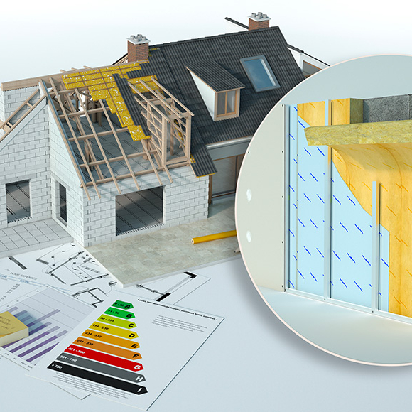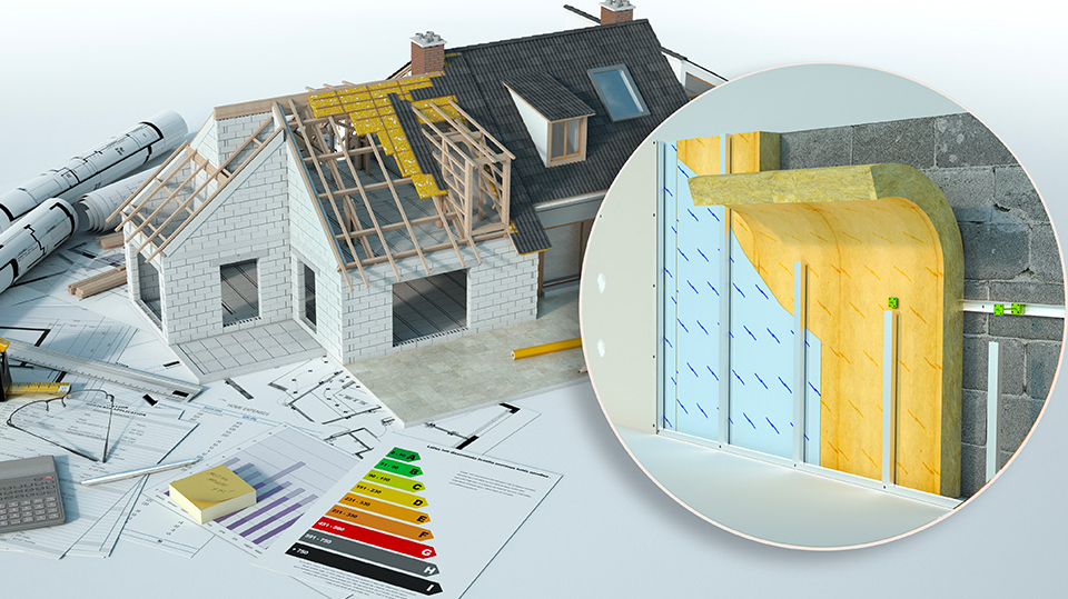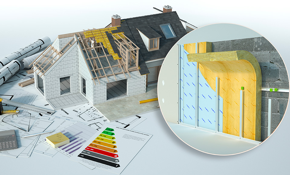 Maquette d'une maison en construction accompagnée de plans, d'un diagramme de performance énergétique, et d'un zoom sur l'isolation intérieure du bâtiment, illustrant la rénovation énergétique et l'efficacité énergétique des logements.