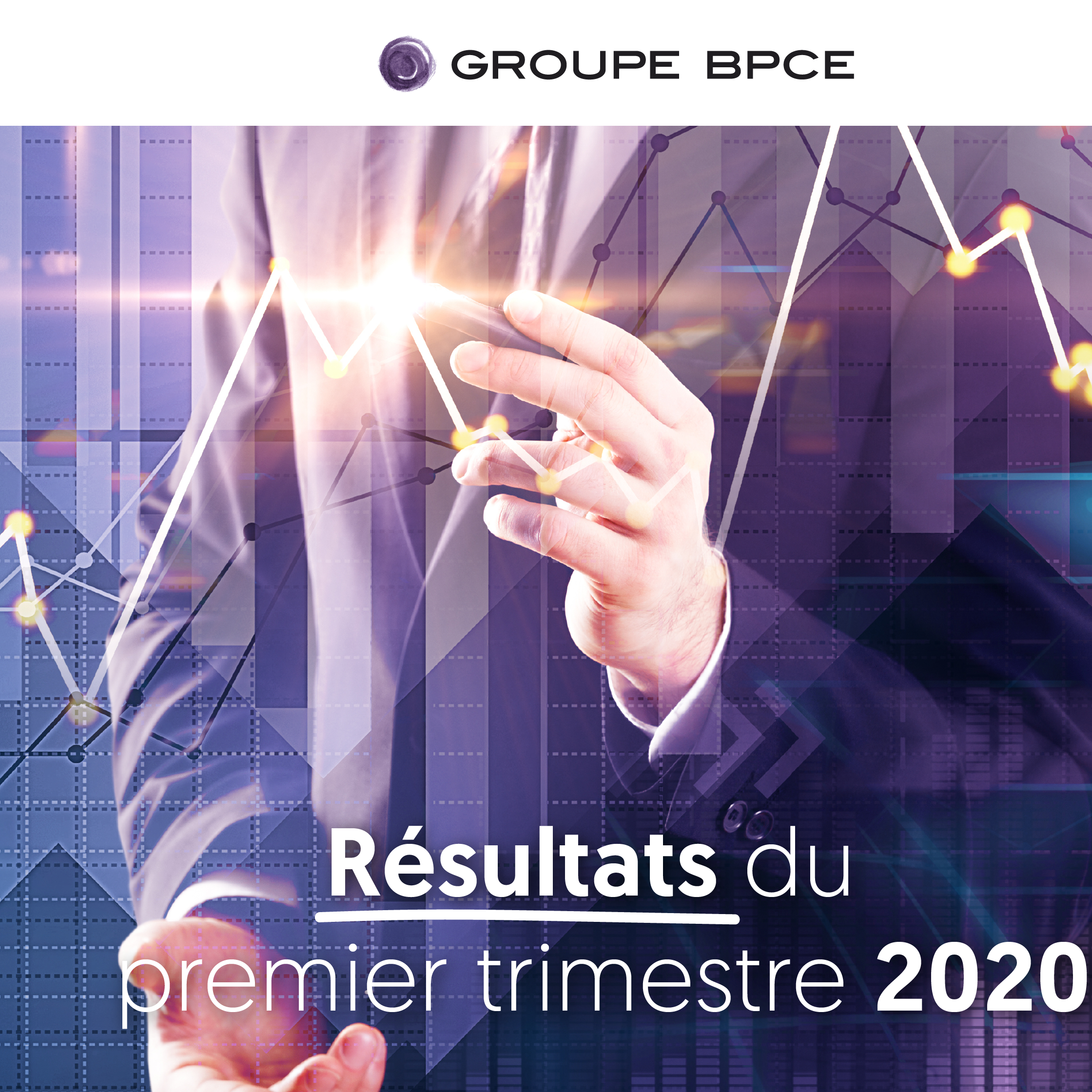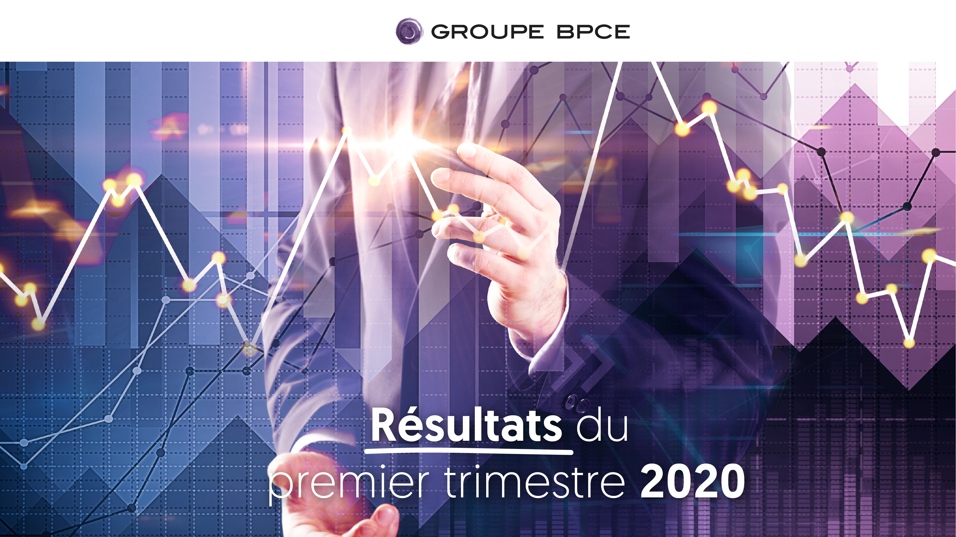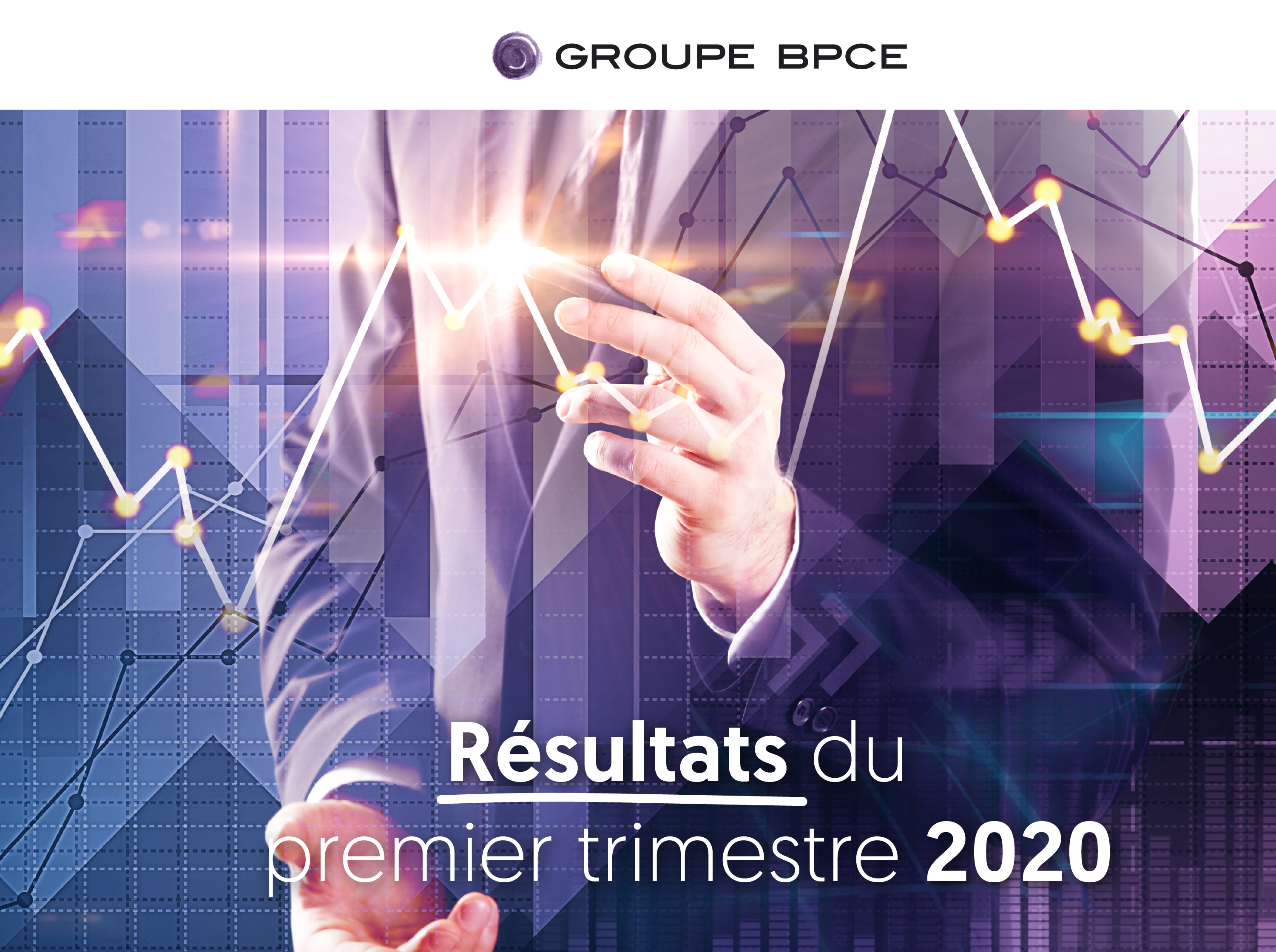 Visuel officiel des résultats financiers du premier trimestre 2020 du Groupe BPCE, illustrant graphiques financiers et identité visuelle du groupe.