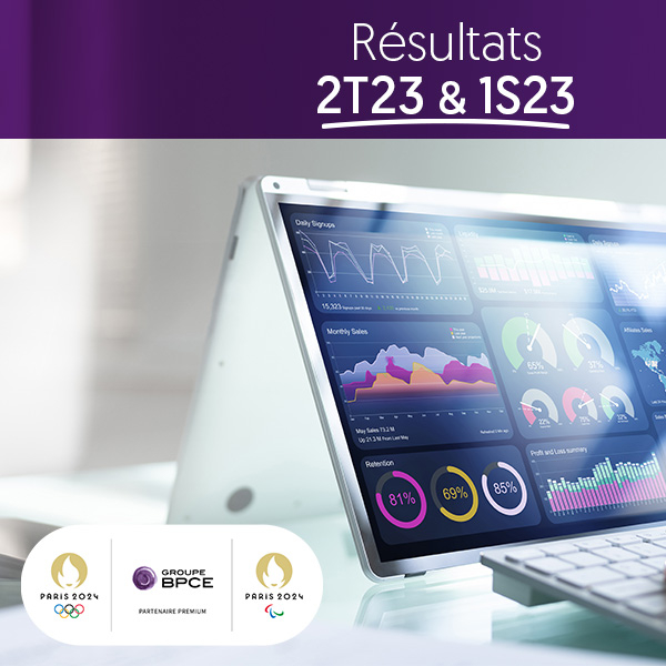 Visuel illustrant les résultats financiers du Groupe BPCE pour le deuxième trimestre et le premier semestre 2023, avec graphiques financiers affichés sur un écran d’ordinateur et mentions de Paris 2024.