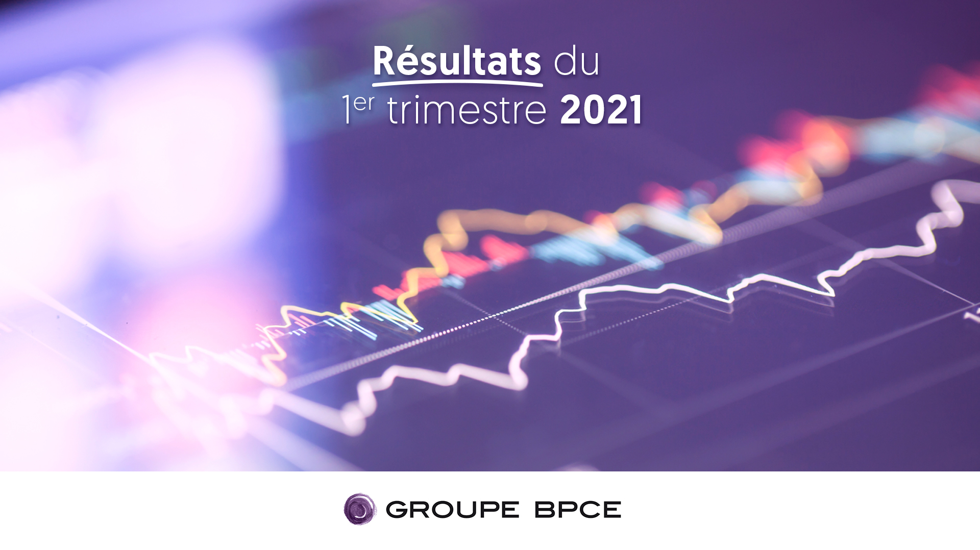 Visuel présentant l’annonce des résultats financiers du 1er trimestre 2021 du Groupe BPCE, illustré par des courbes de marchés financiers.